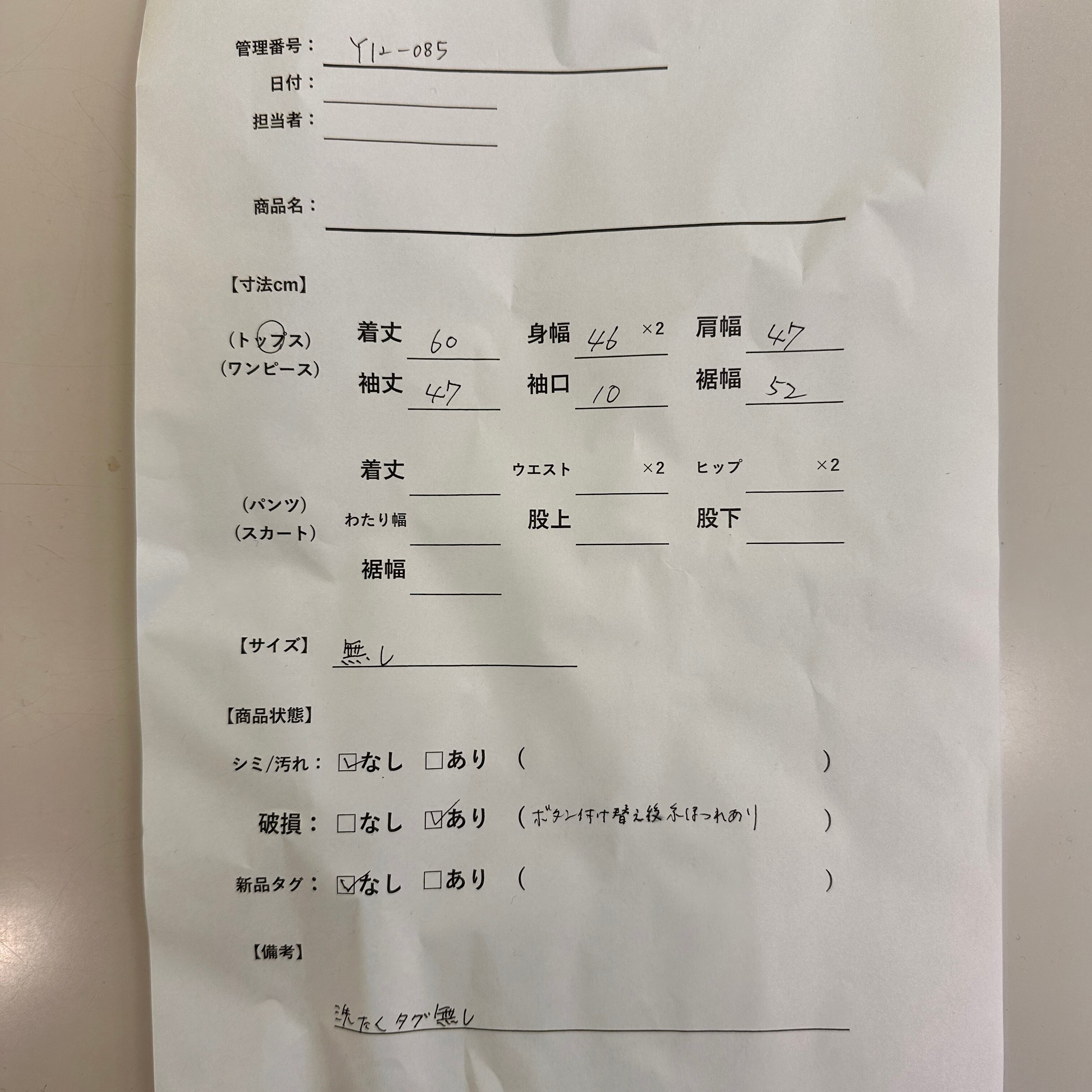管理番号:Y12-085 #てまいらずアパレル商品一覧