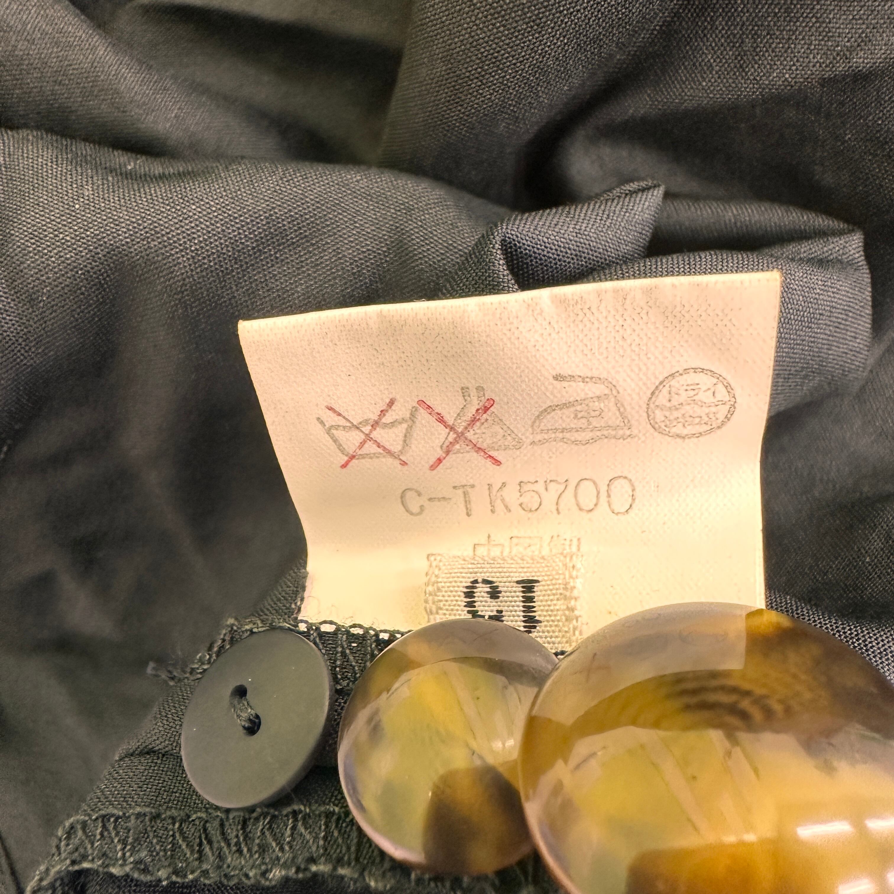 V字型のプリーツデザインと、茶系のマーブルボタンがポイントになっています。