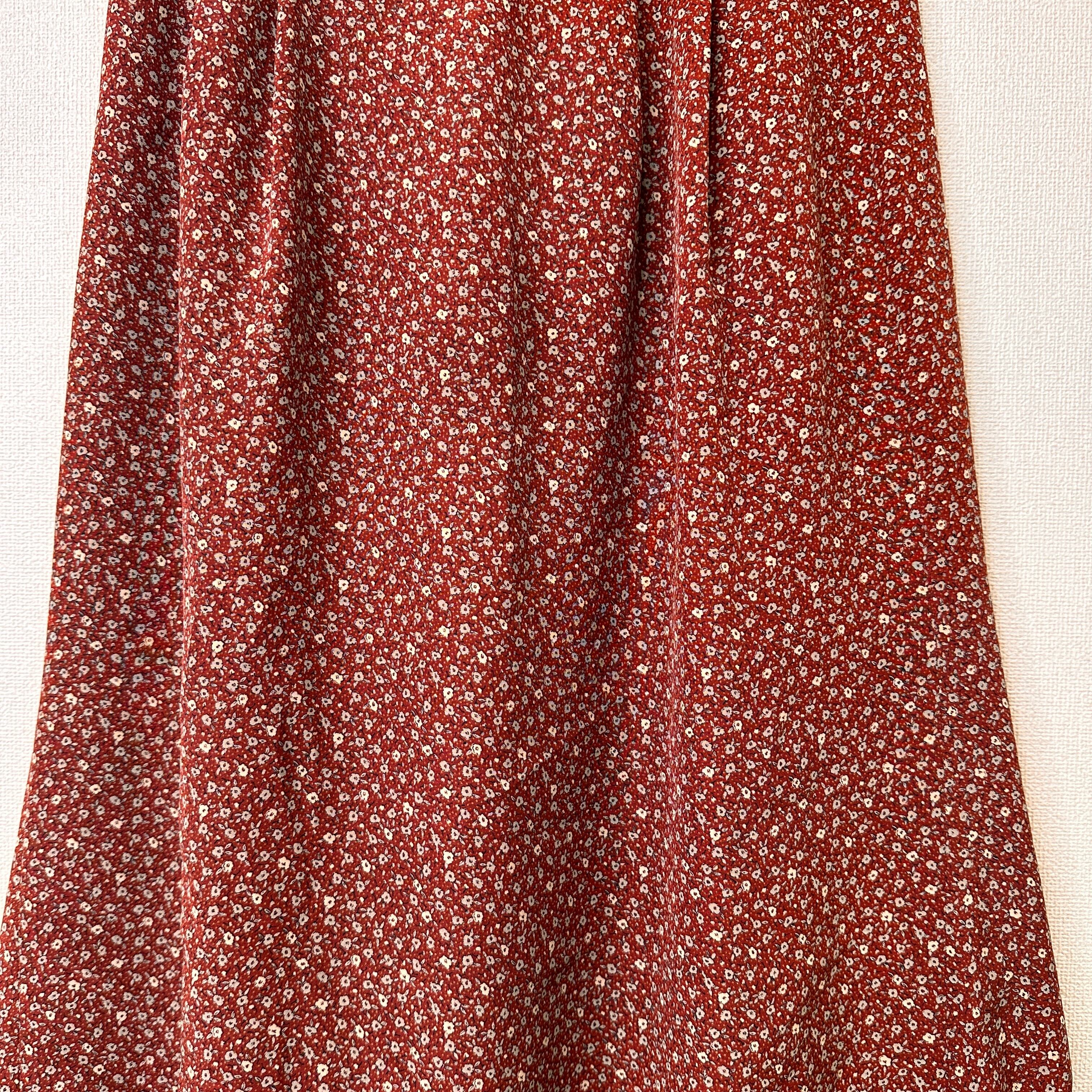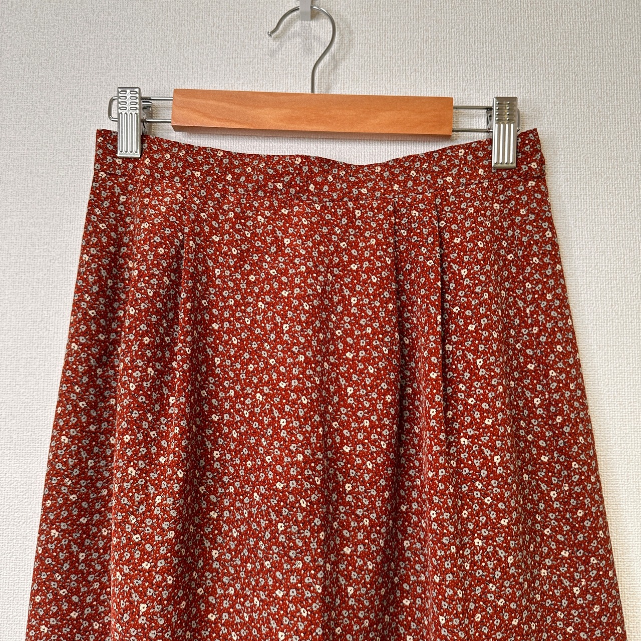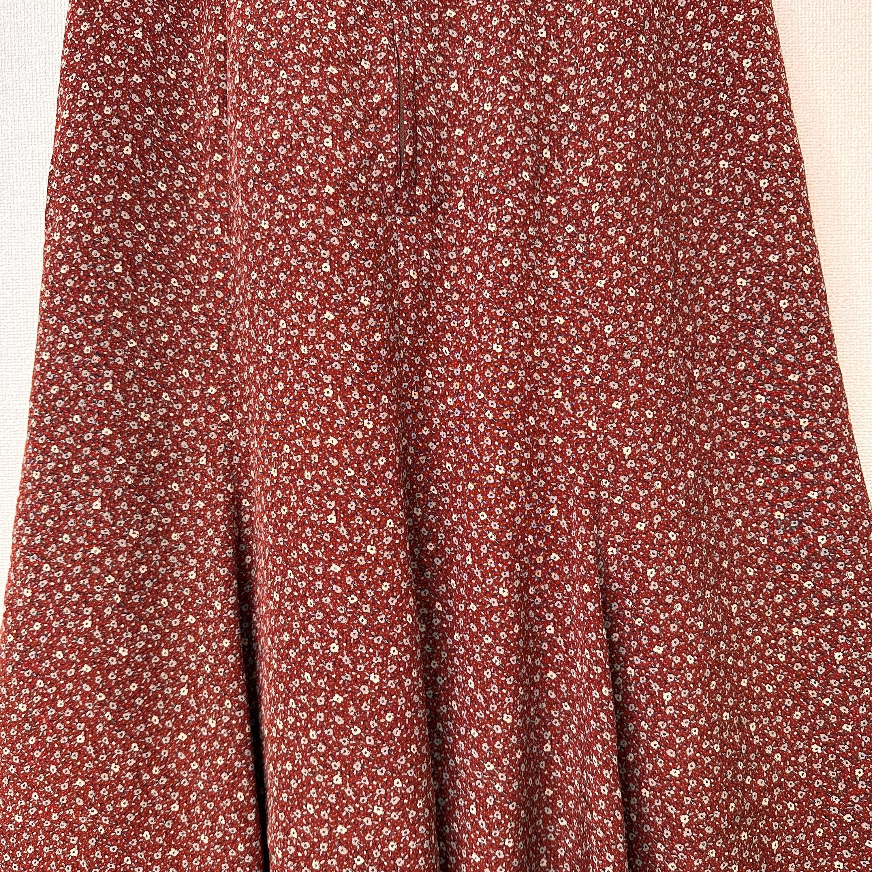 赤茶系の生地に、白や紺の小花が散りばめられたレトロなロングスカートです。