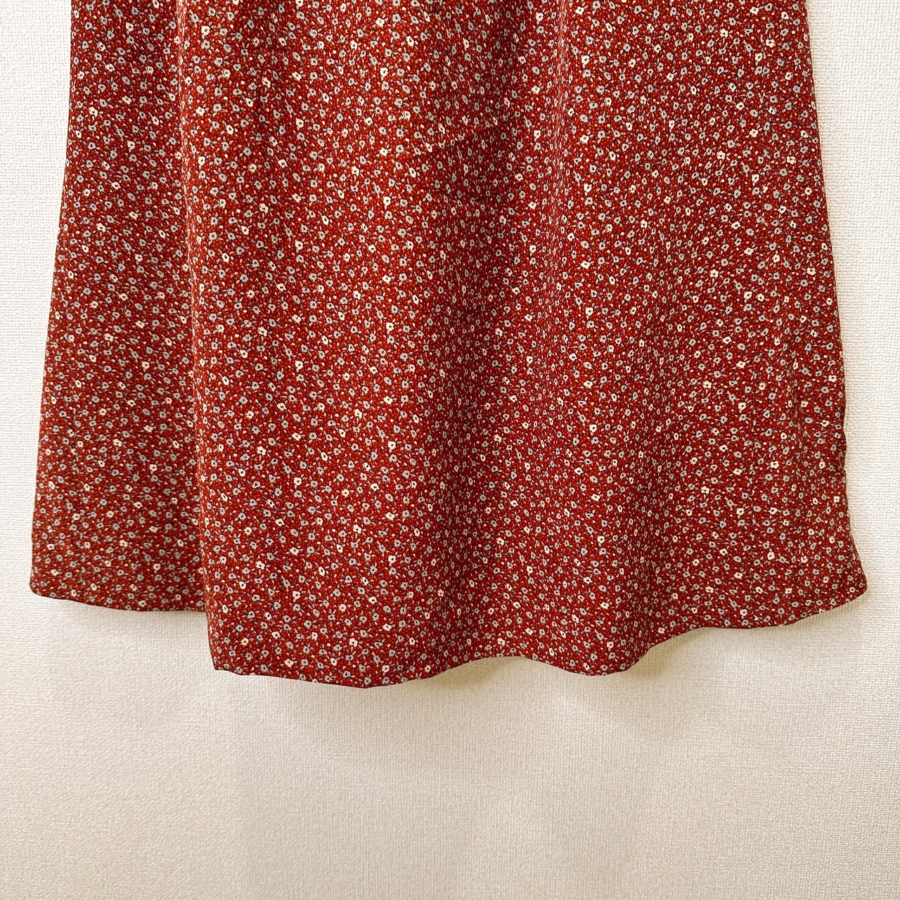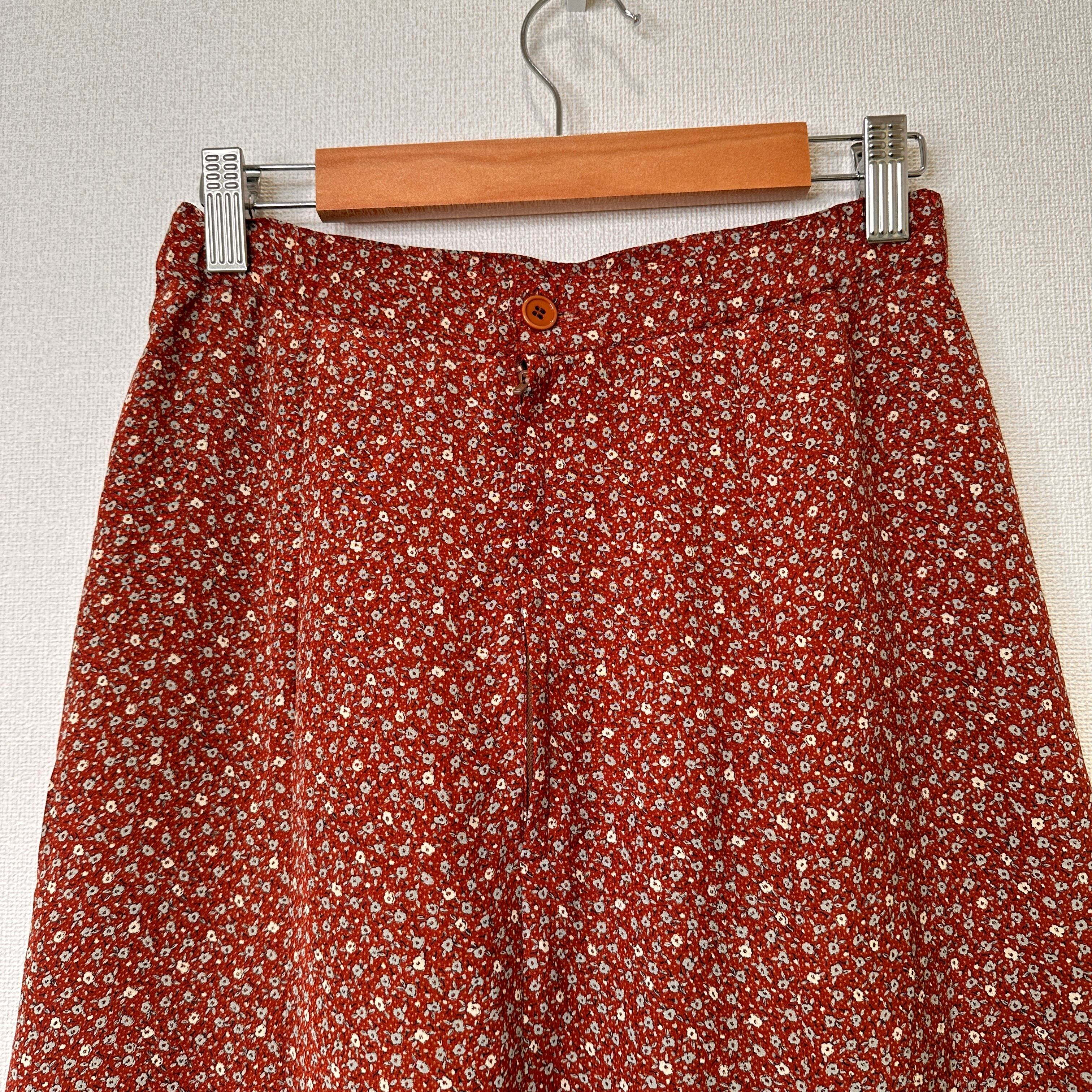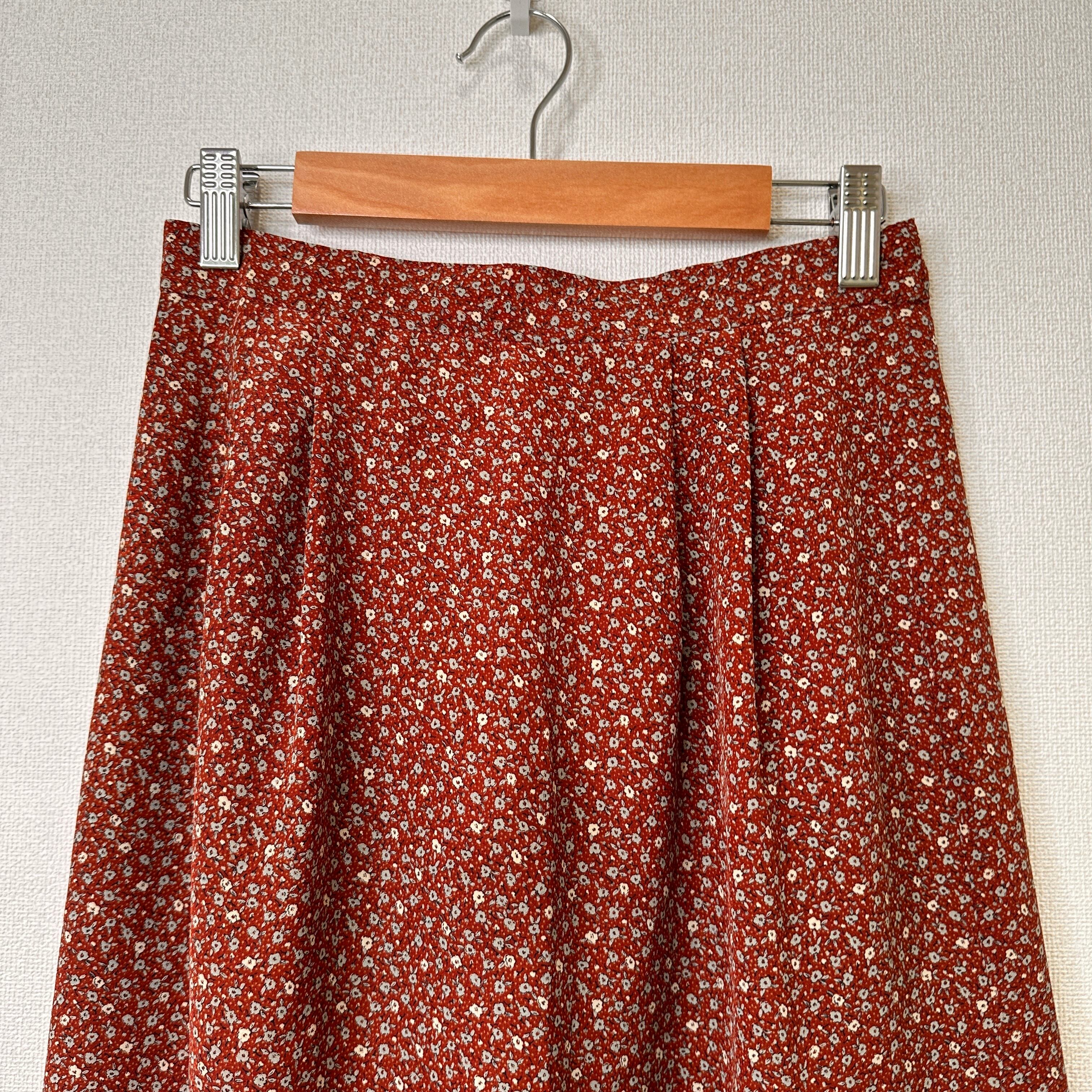 赤茶系の生地に、白や紺の小花が散りばめられたレトロなロングスカートです。