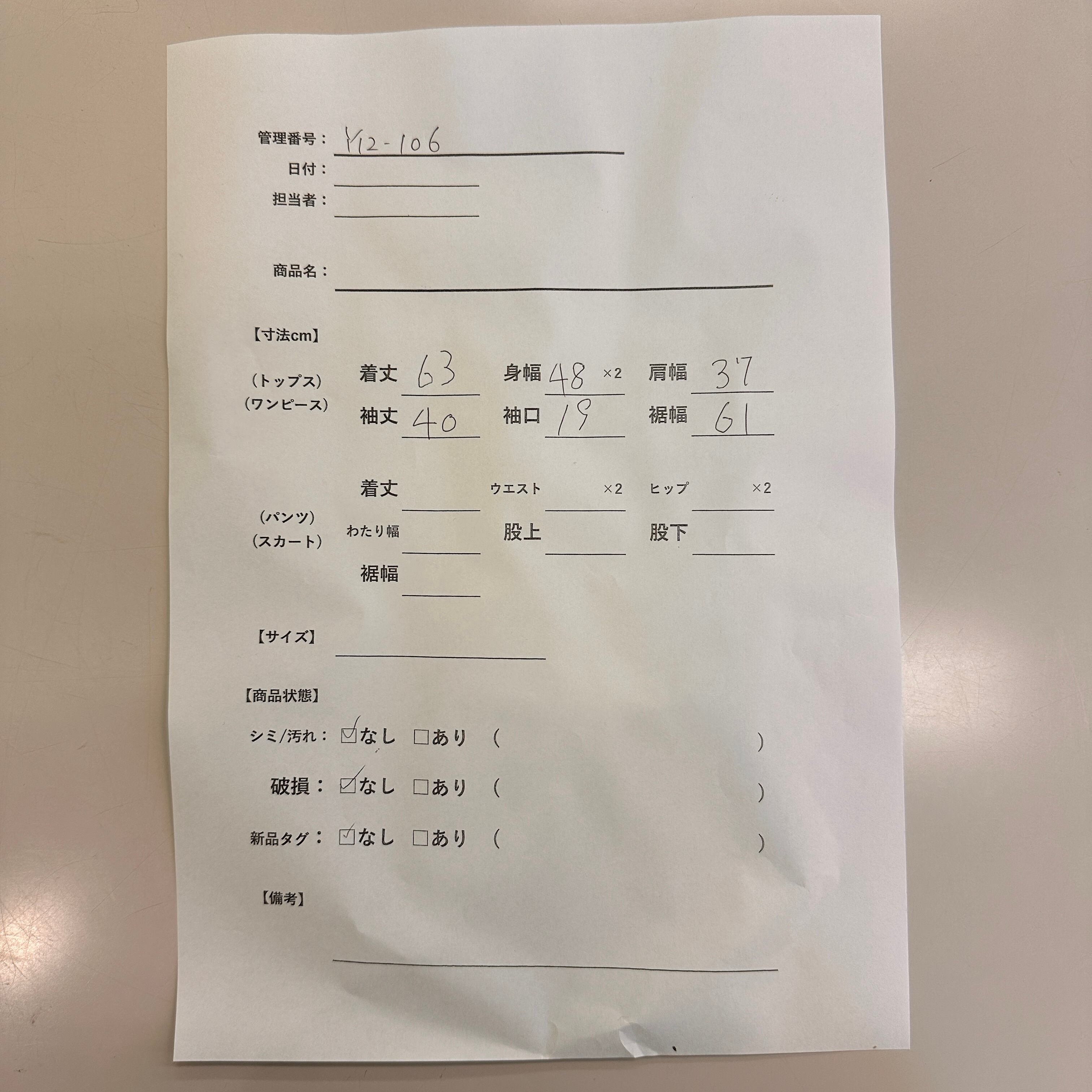 管理番号:Y12-106 #てまいらずアパレル商品一覧