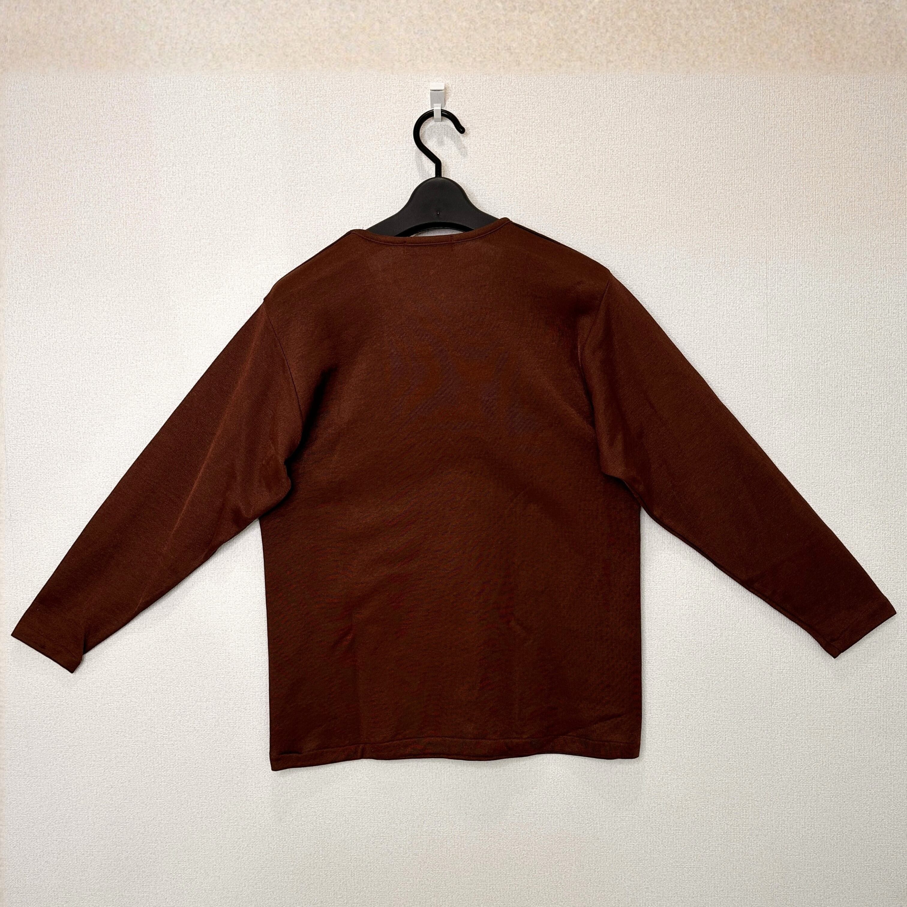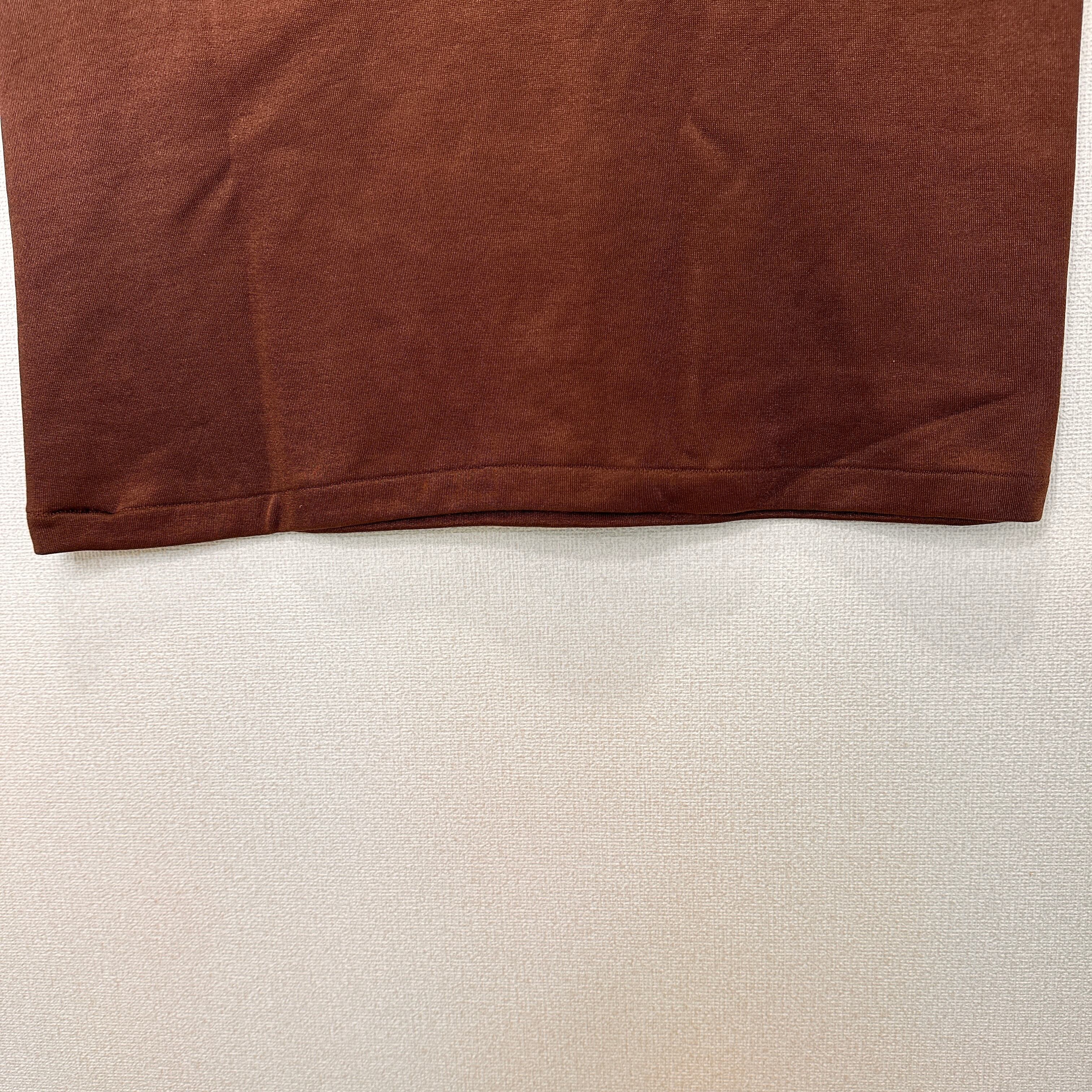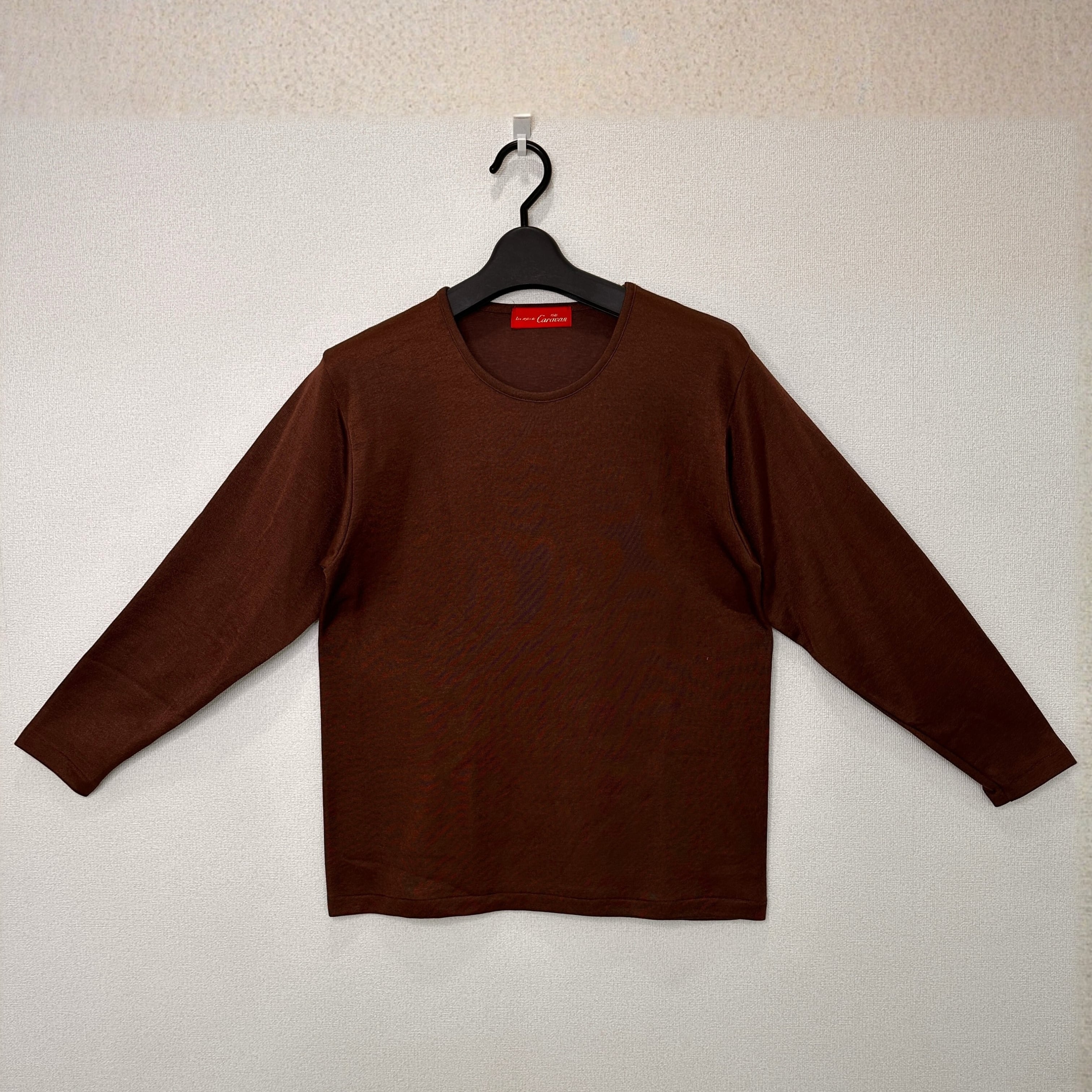 深みのあるブラウンで、シンプルなUネックまたはクルーネックのベーシックなデザインです。