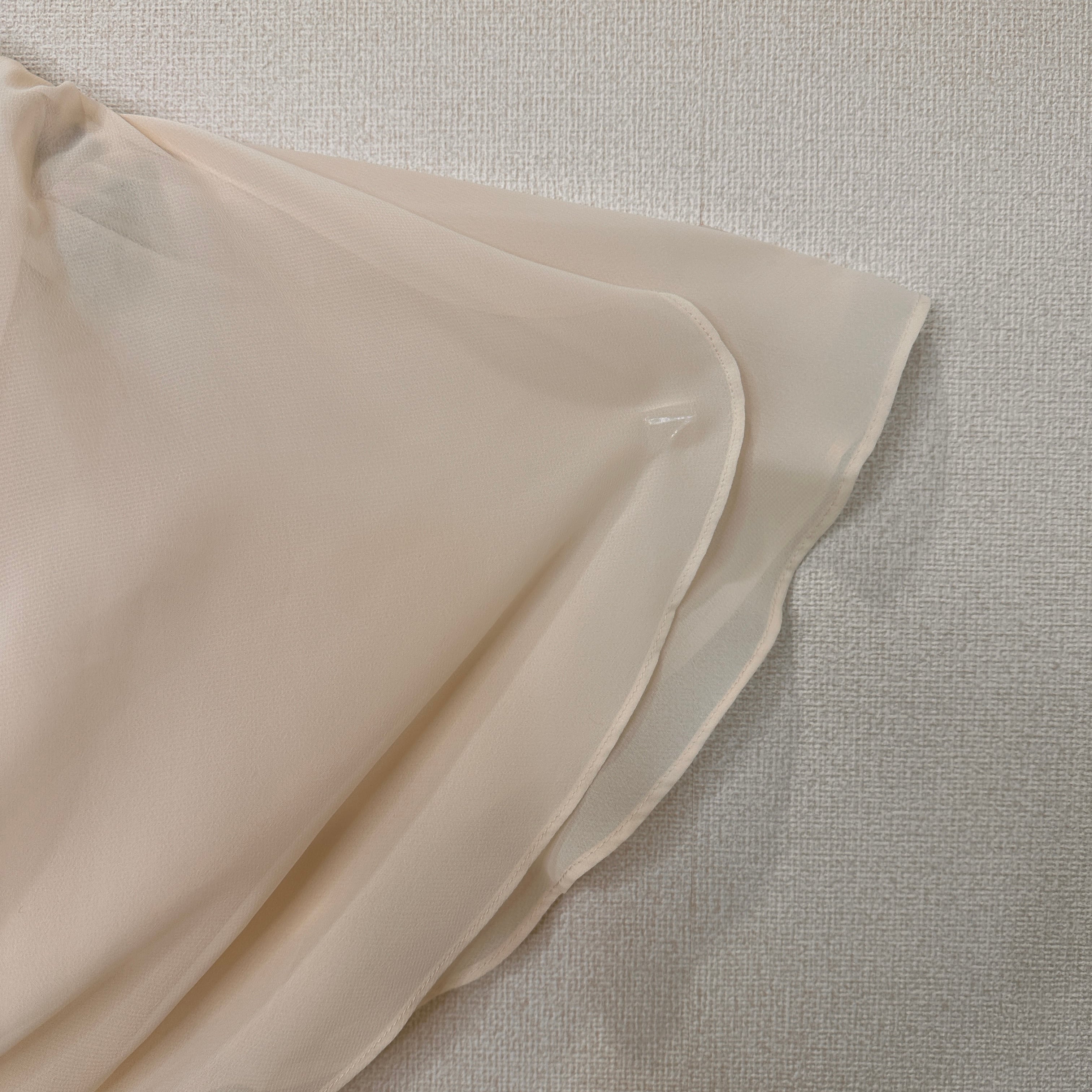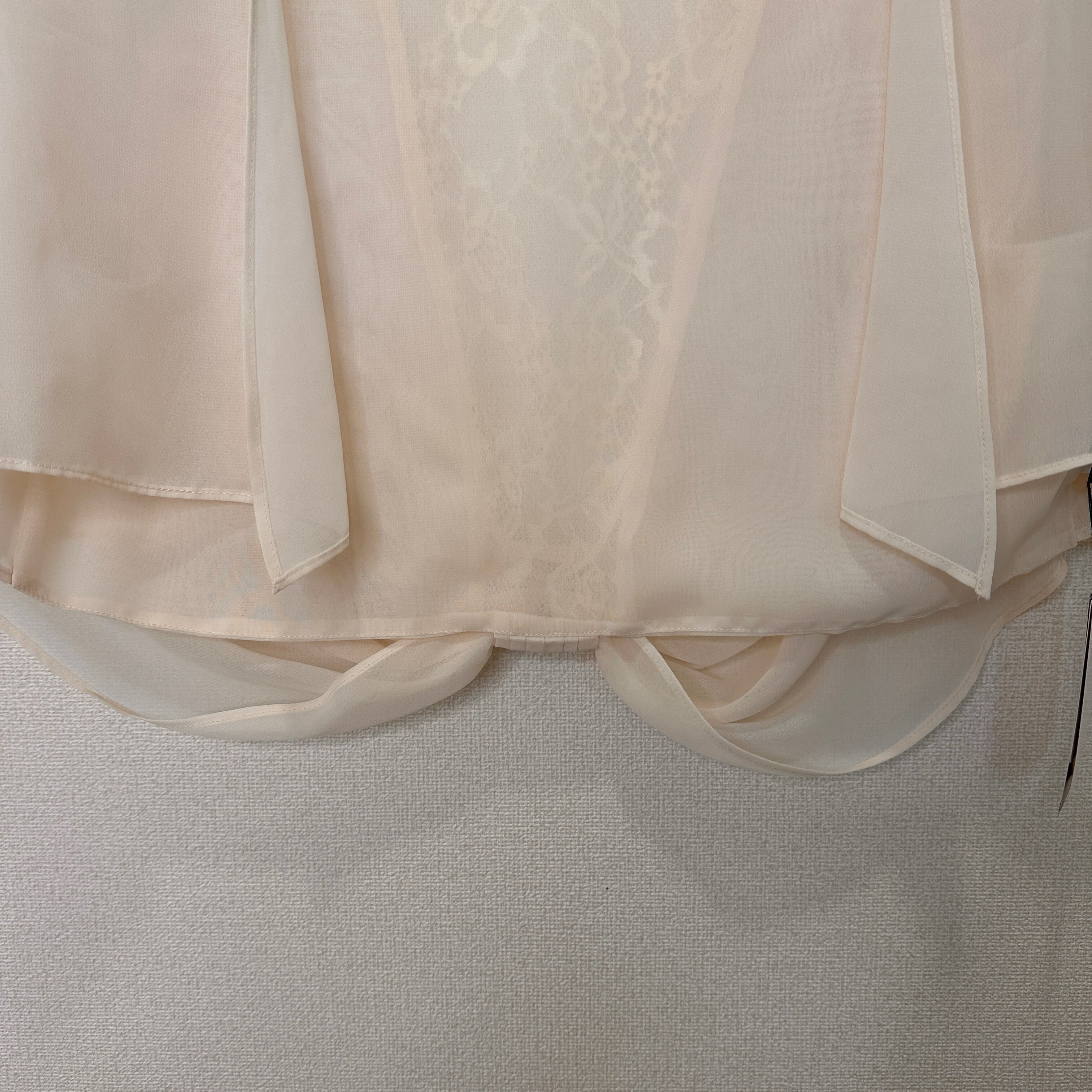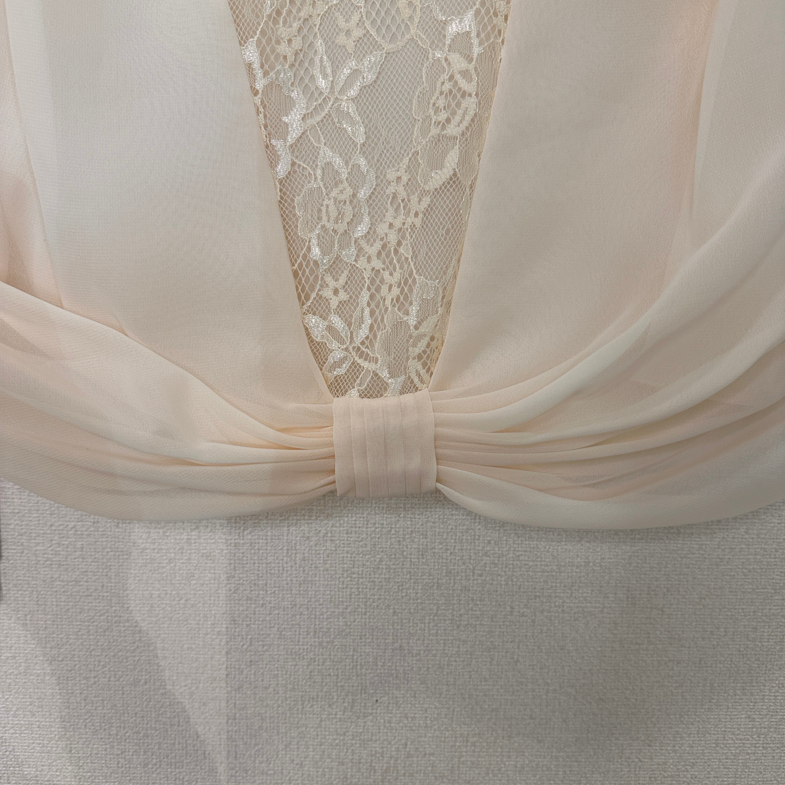 柔らかなアイボリー系のシフォン素材に、背中部分が繊細なラメ入りレースになっています。