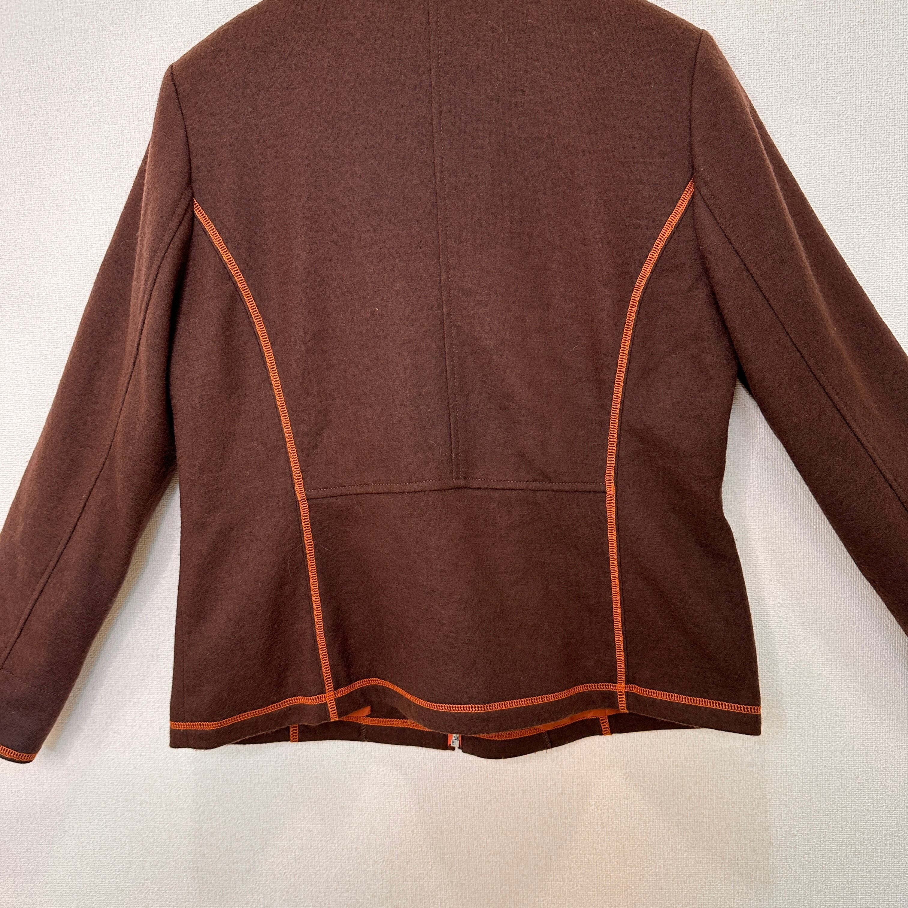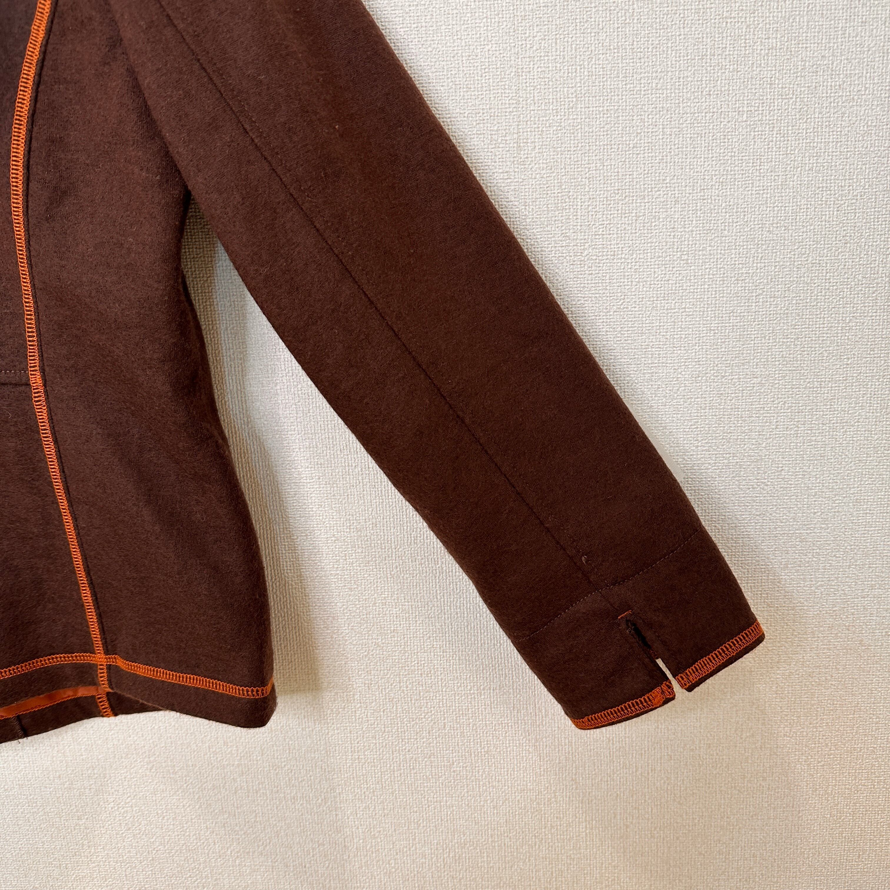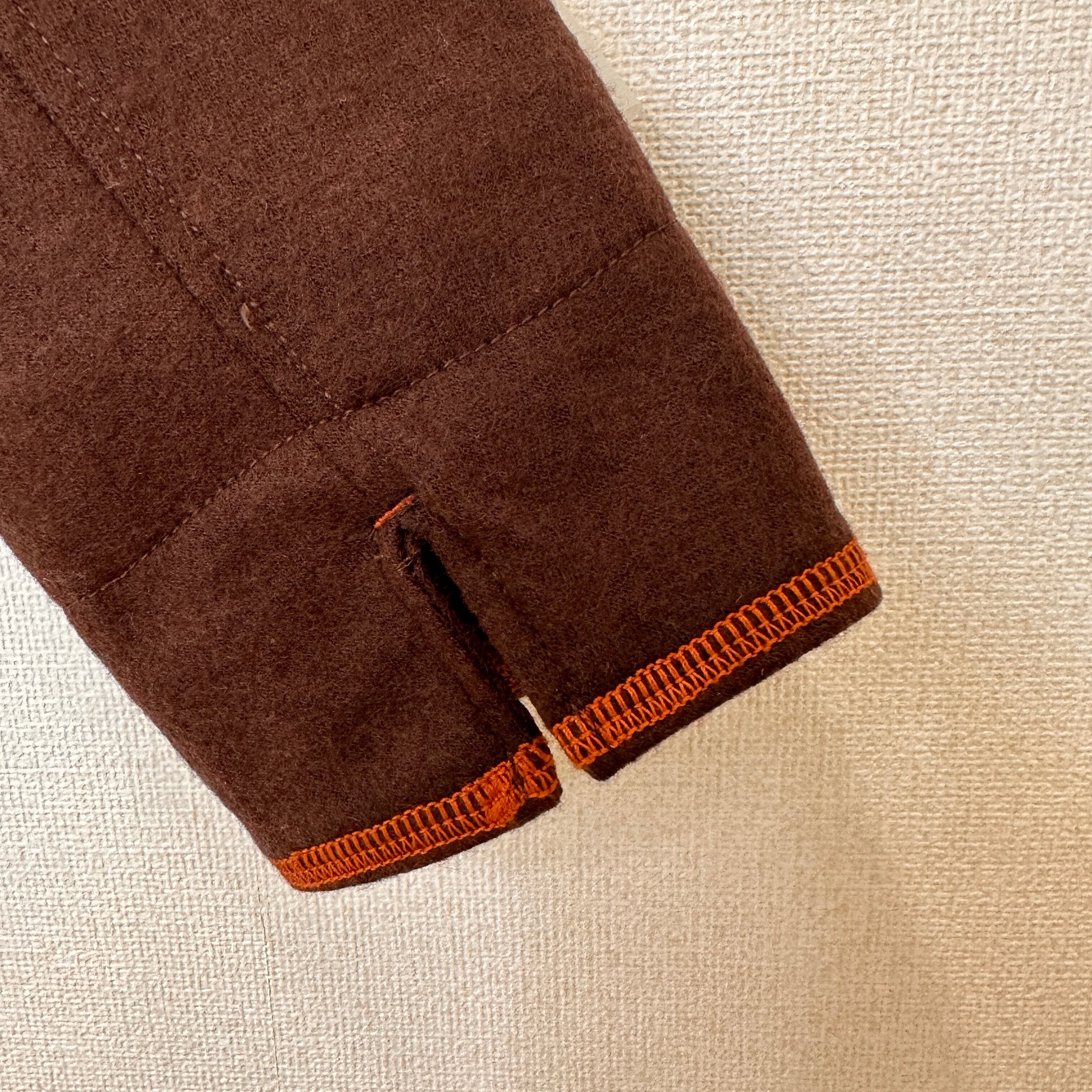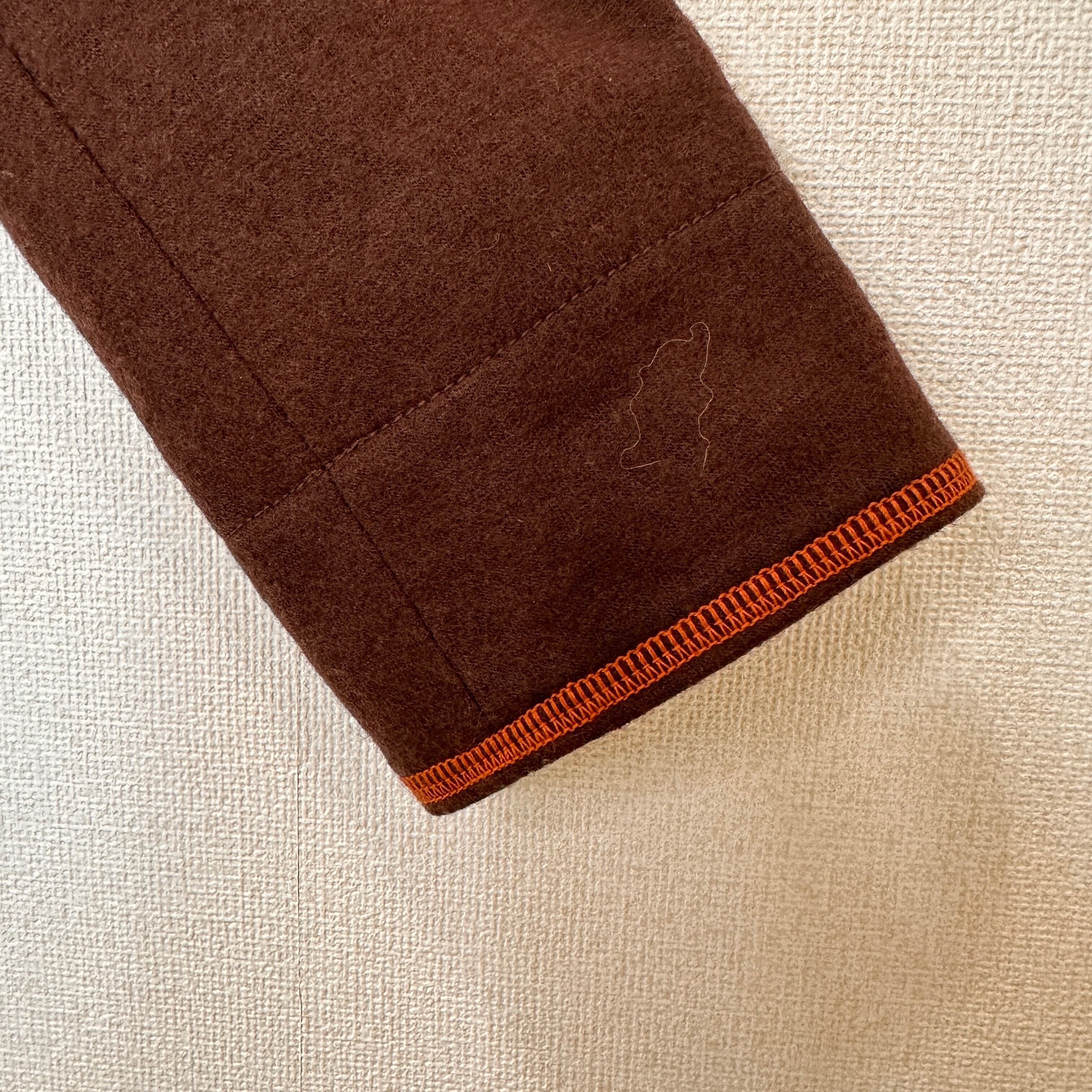 暖かみのあるウール混のブラウン生地に、オレンジのステッチ(パイピング)がアクセントになったデザインです。