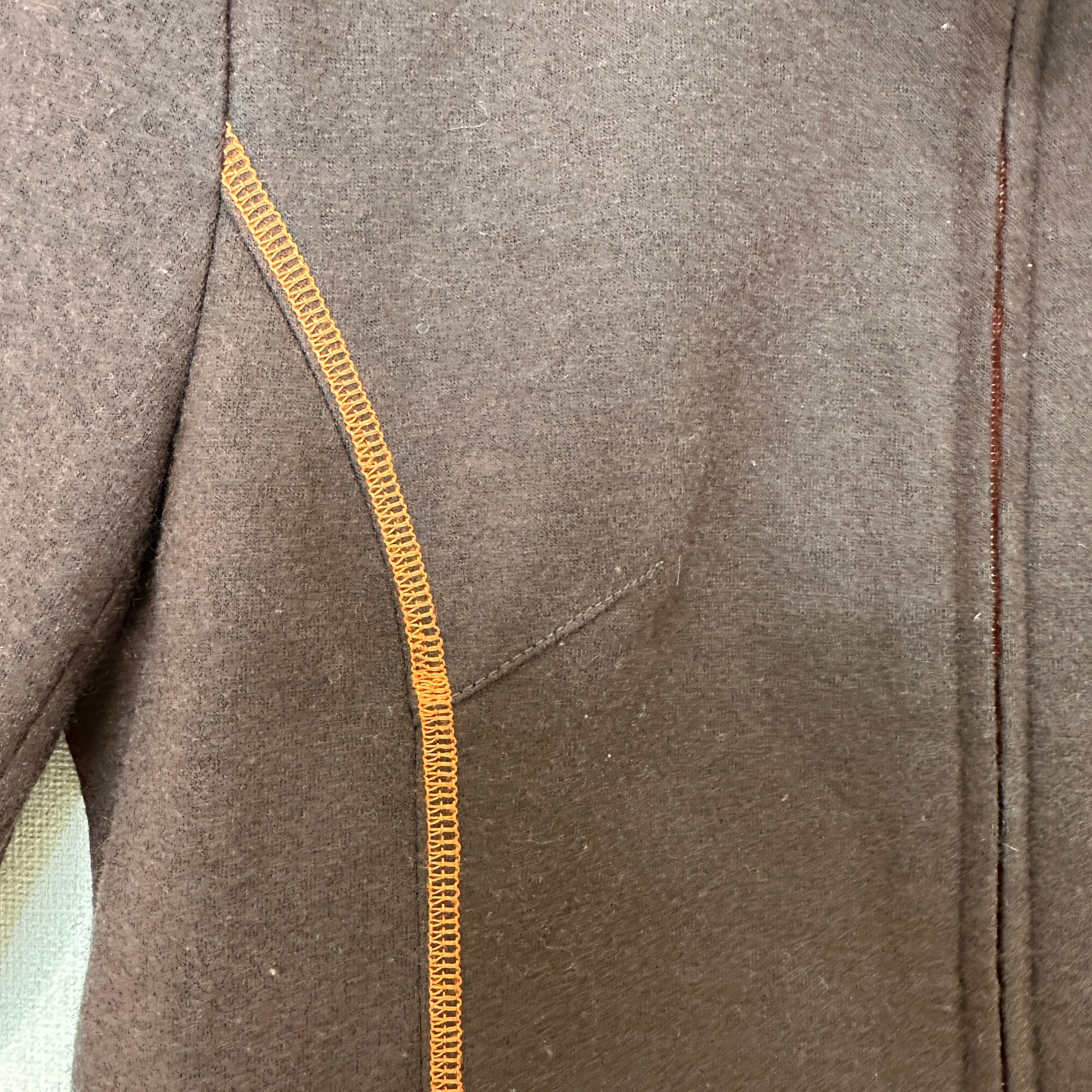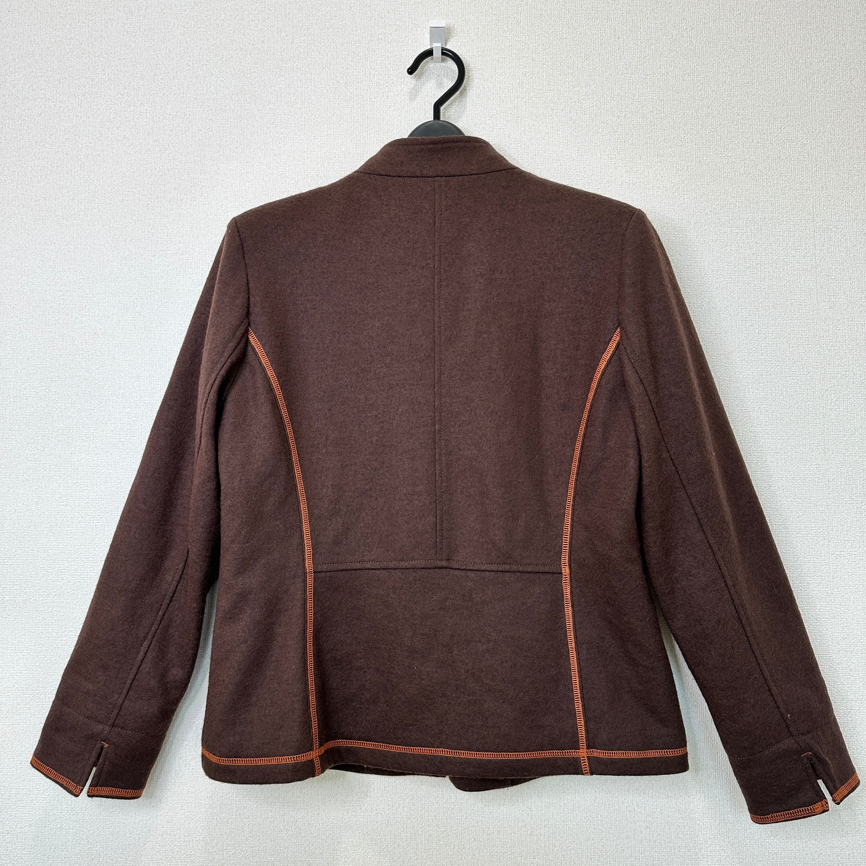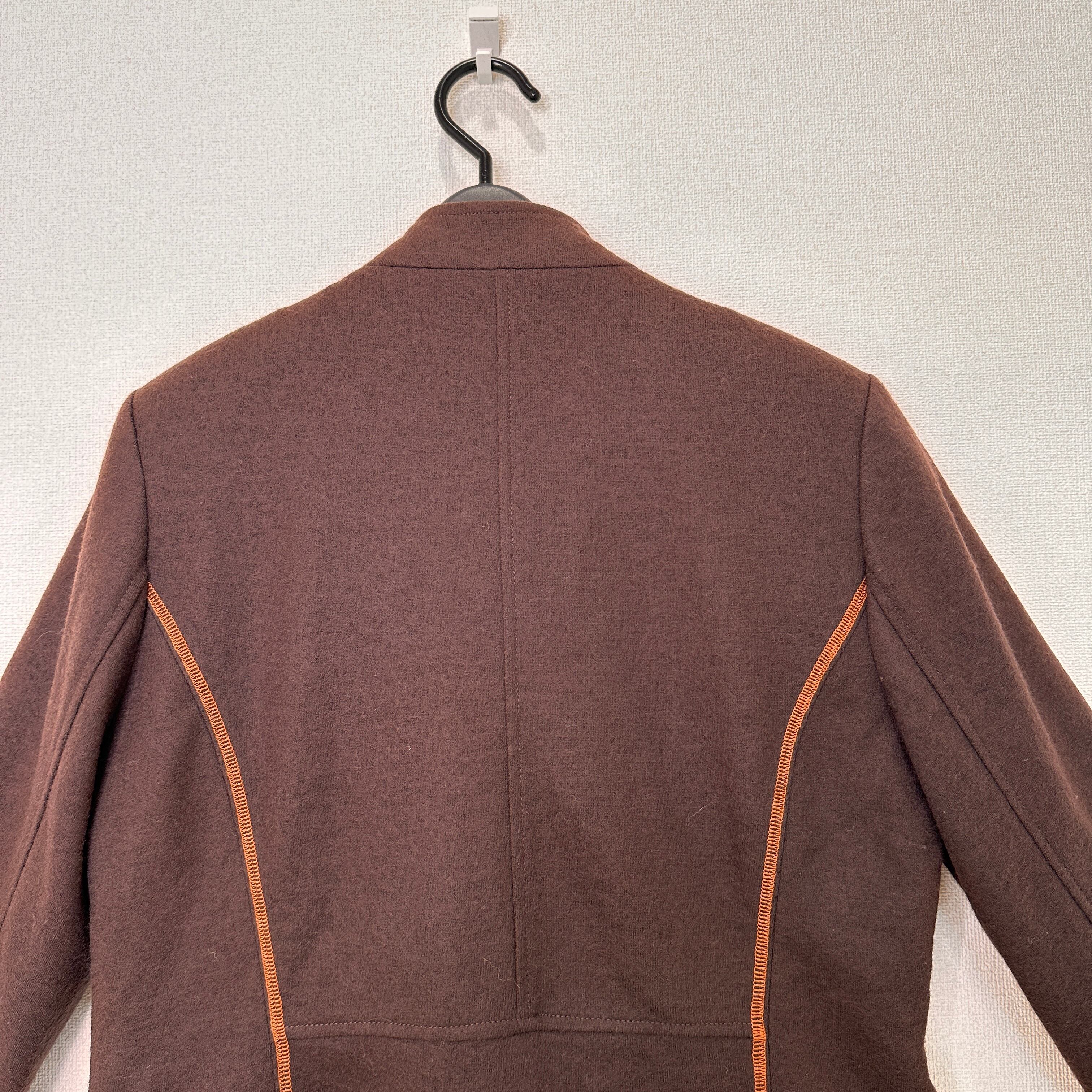 暖かみのあるウール混のブラウン生地に、オレンジのステッチ(パイピング)がアクセントになったデザインです。