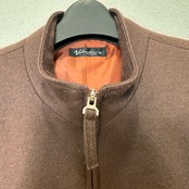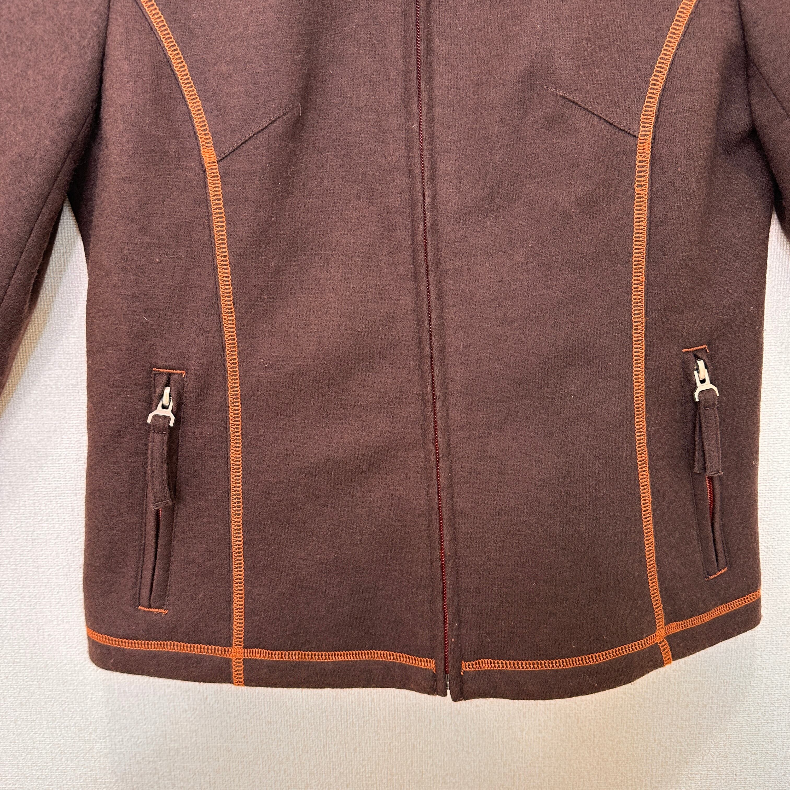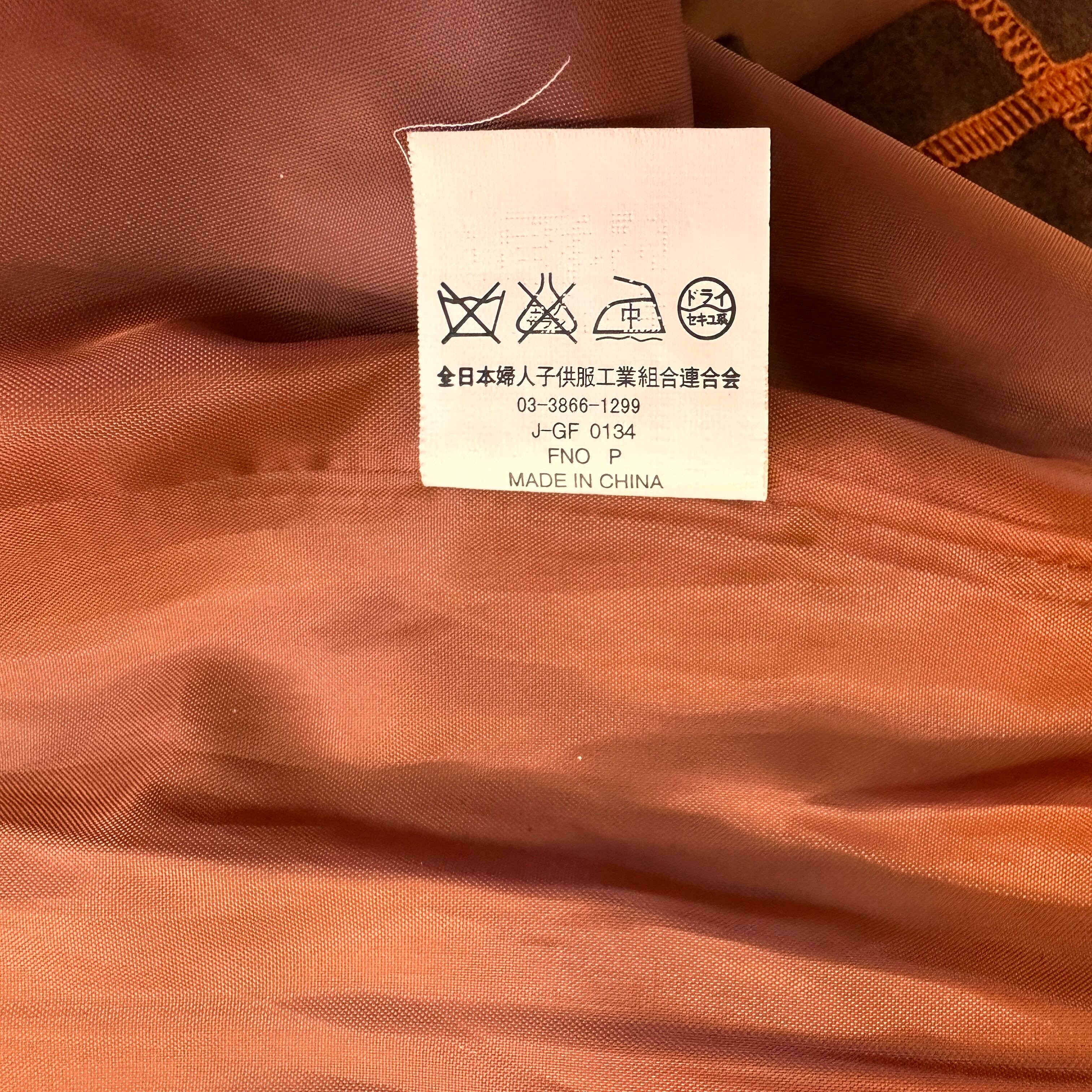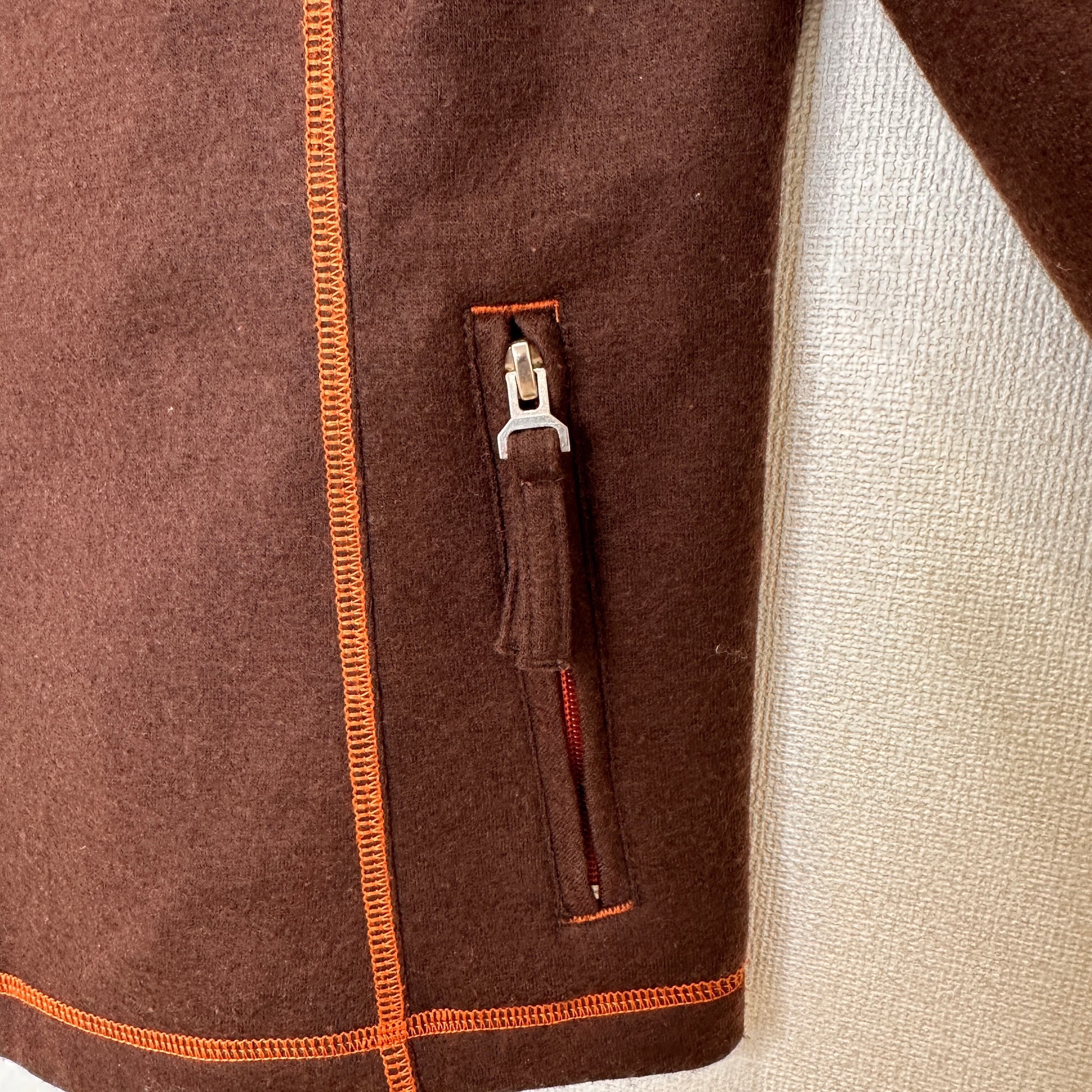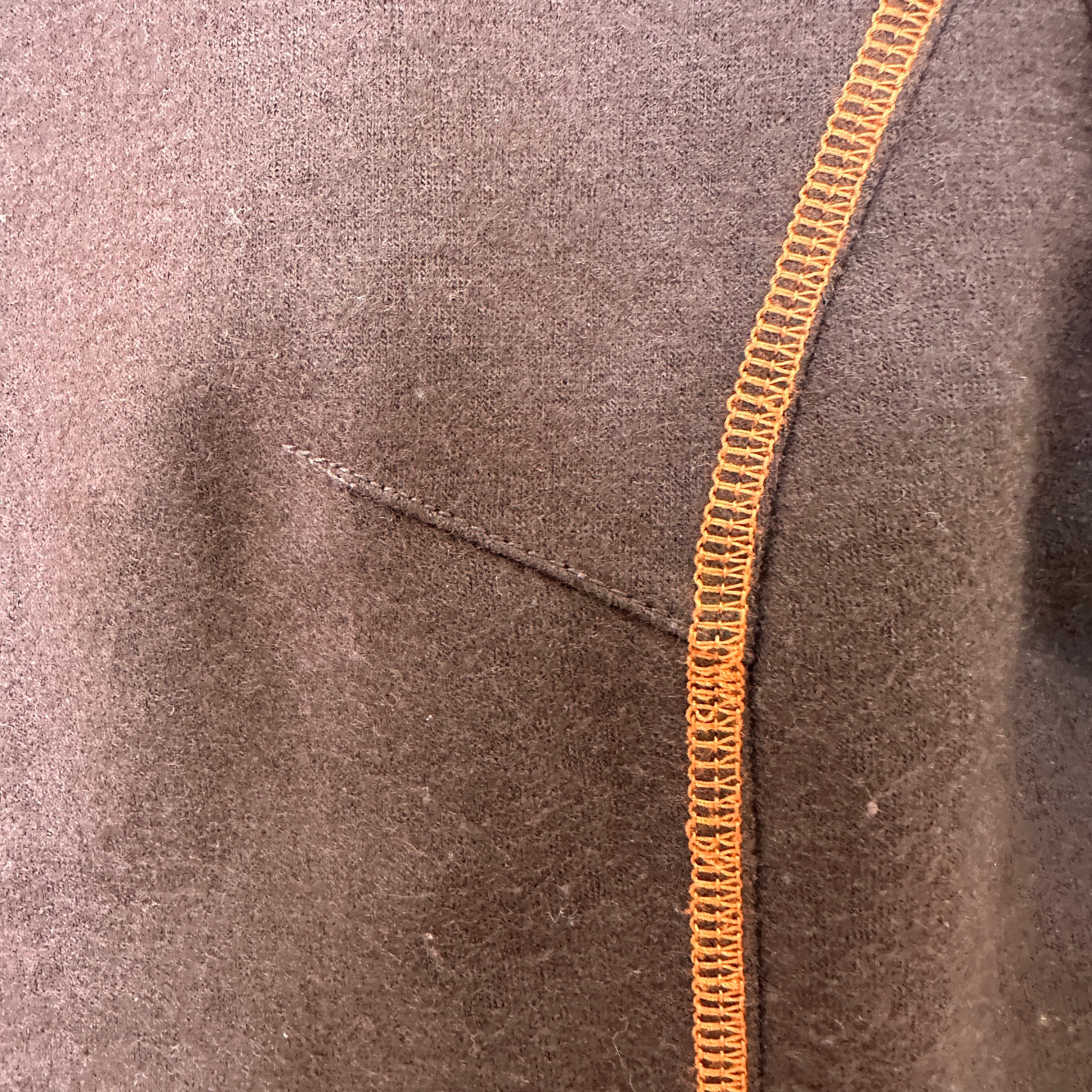 暖かみのあるウール混のブラウン生地に、オレンジのステッチ(パイピング)がアクセントになったデザインです。