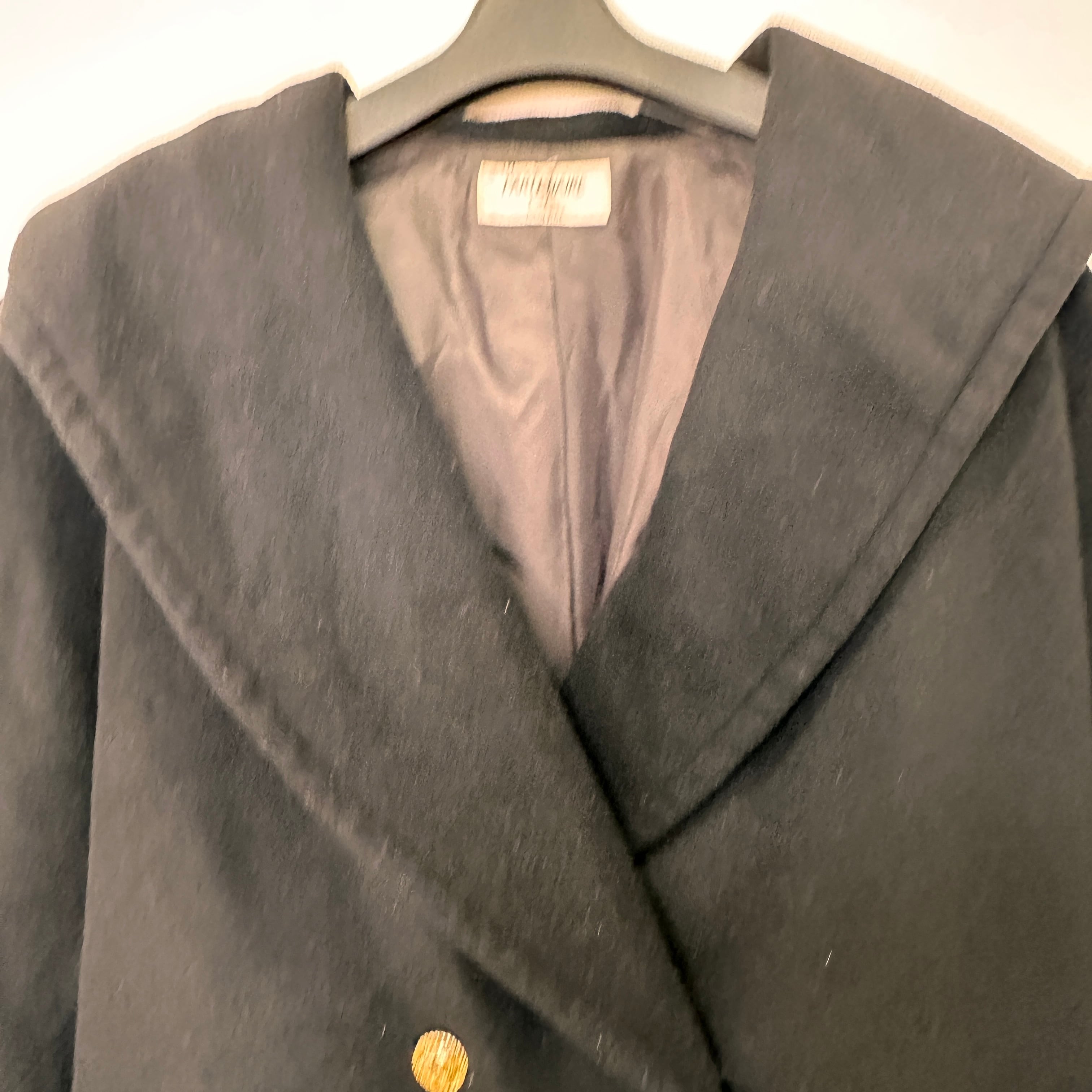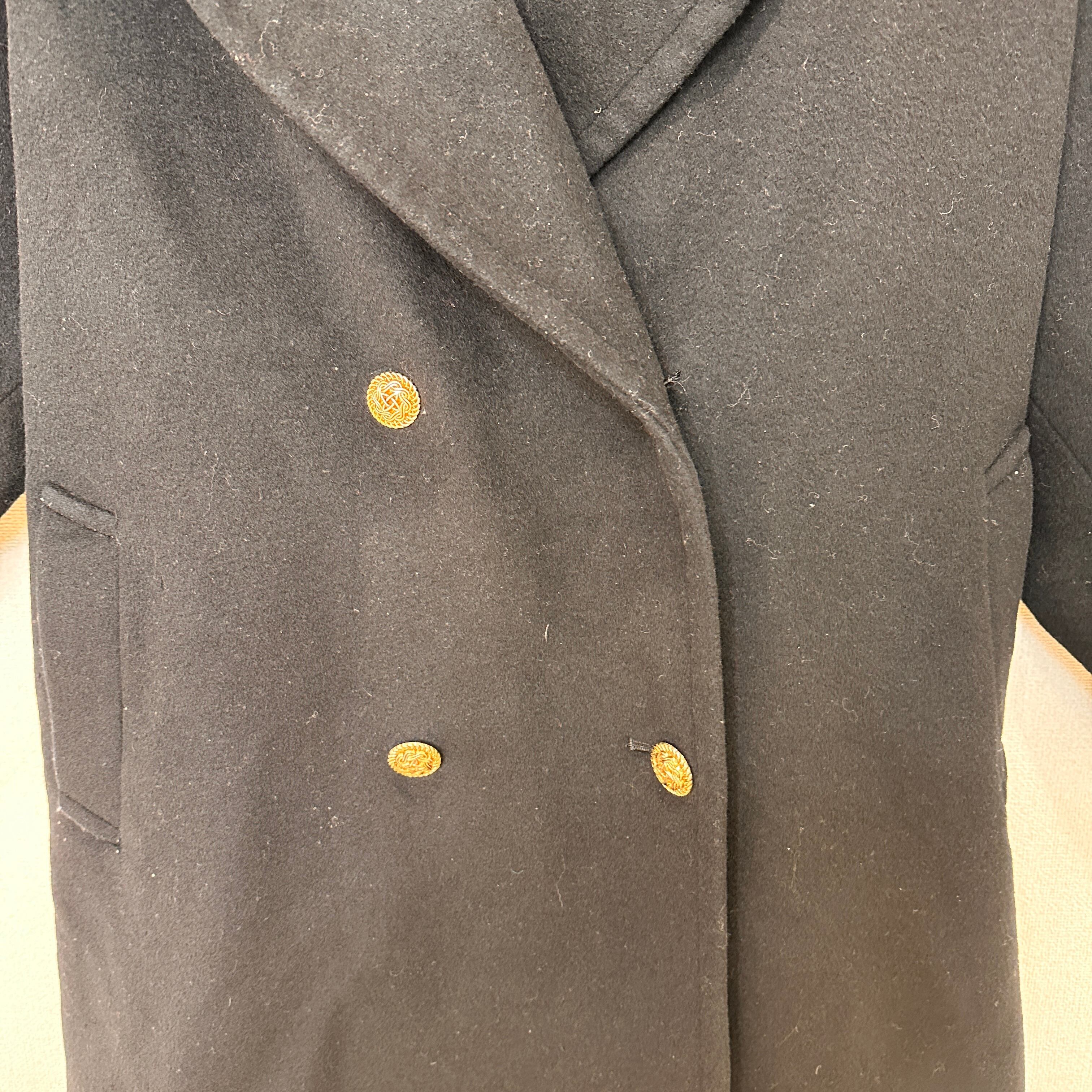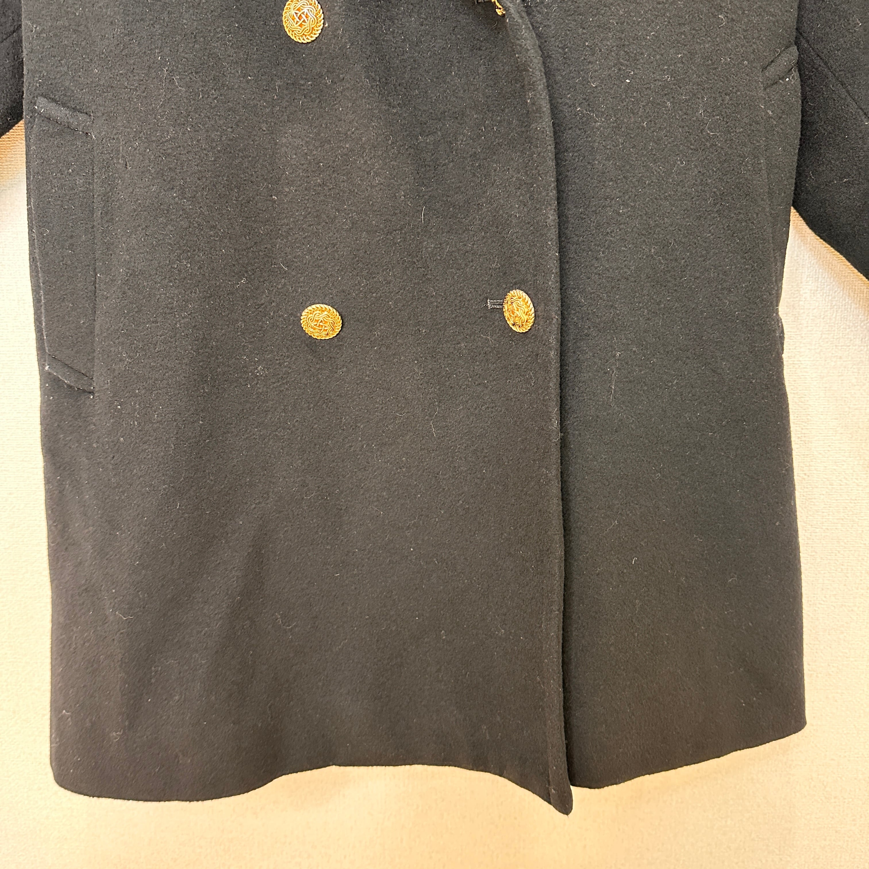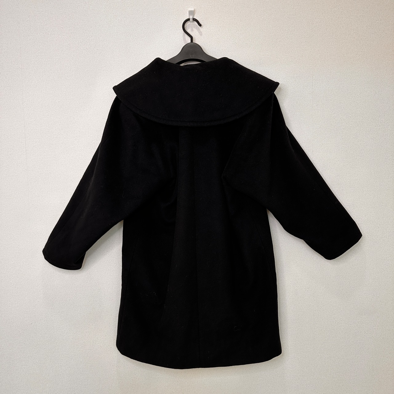 大きめの襟(ビッグカラー)とダブルボタンが特徴的なPコート風のデザインで、エレガントかつレトロな雰囲気があります。