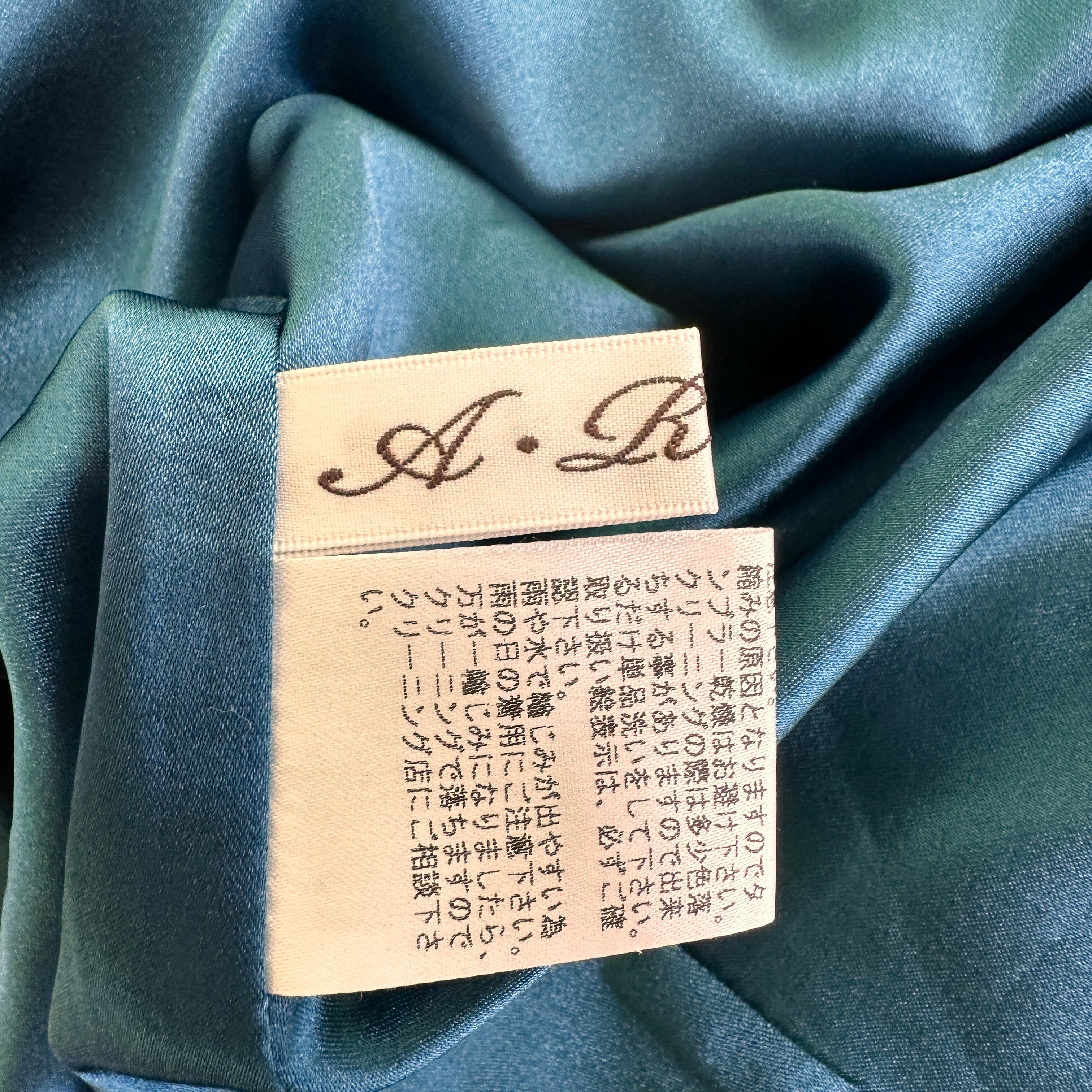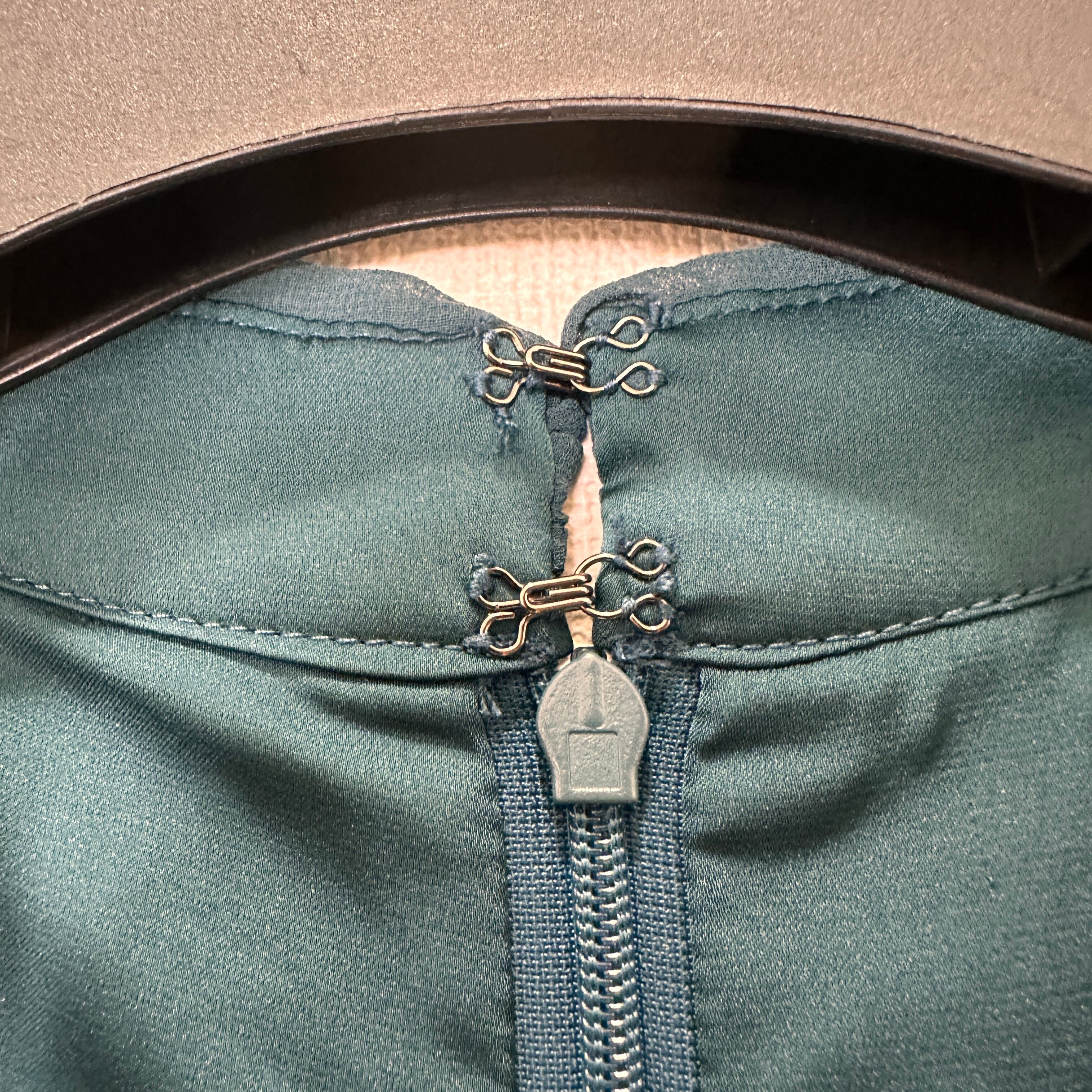 裏地付きで、背中はハイネックデザインからプリーツが入っており、ファスナーで着脱します。
