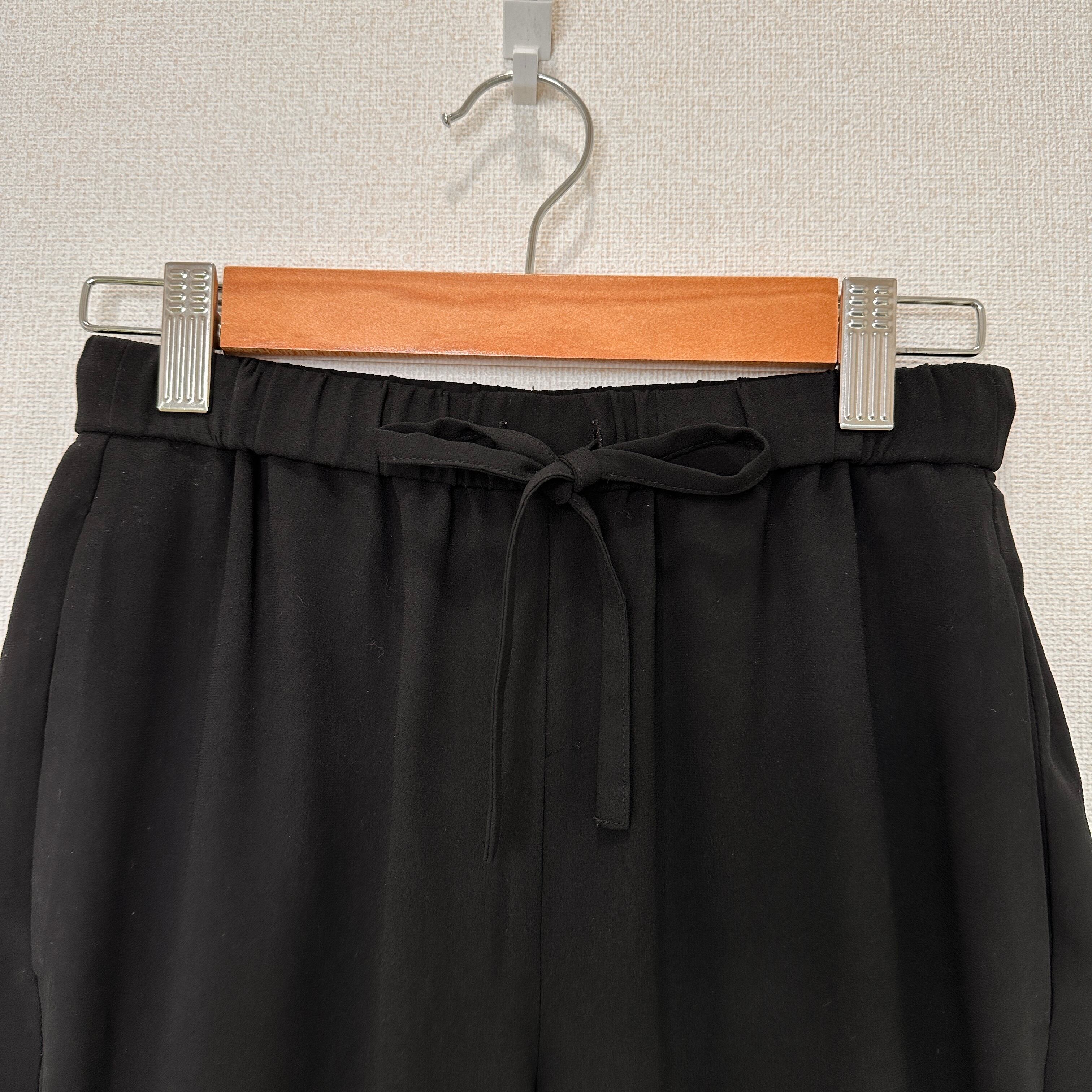 パウダーのようにさらりとしたクレープ素材できれいめな印象でありながら、ウエストはゴムとドローストリング(紐)で快適な履き心地です。