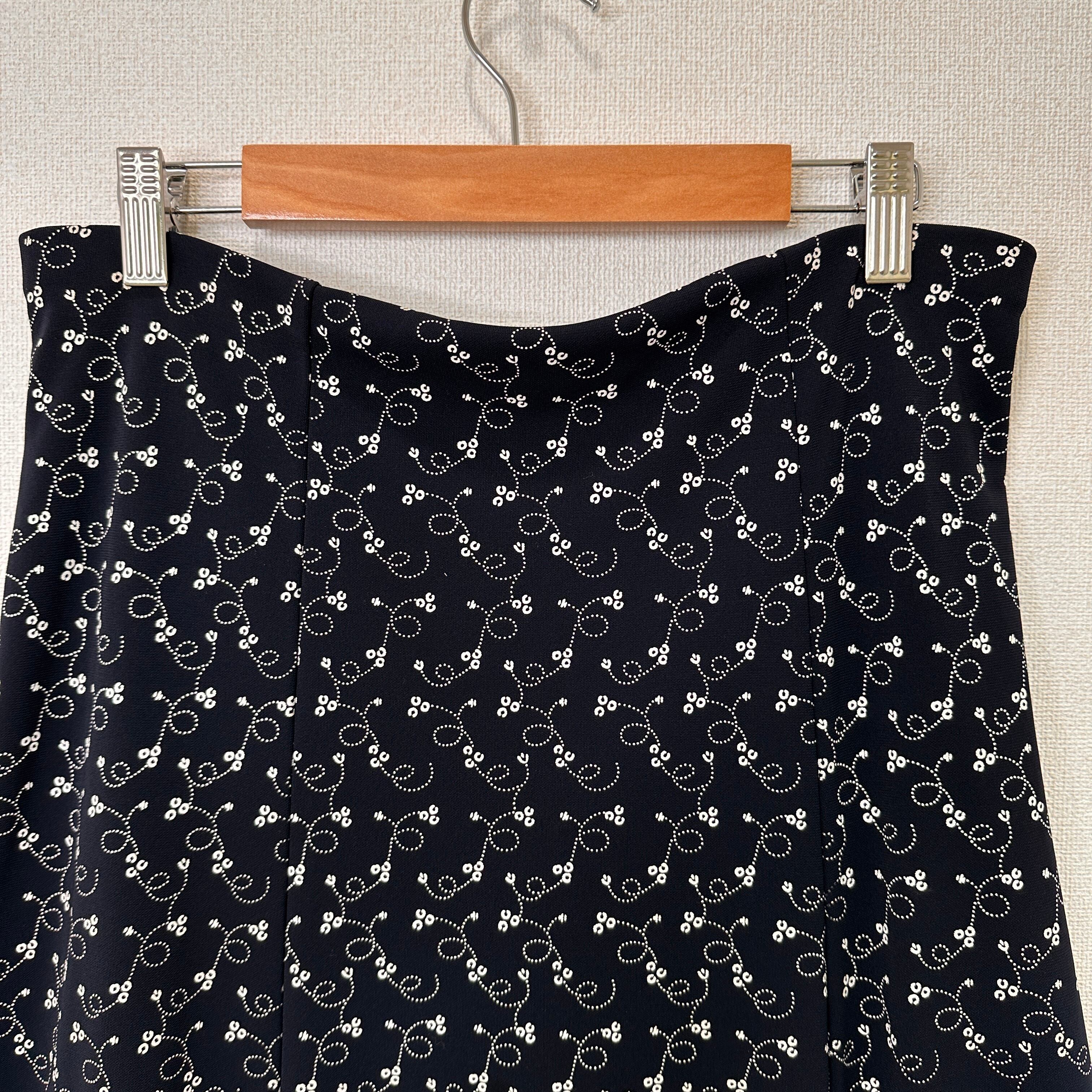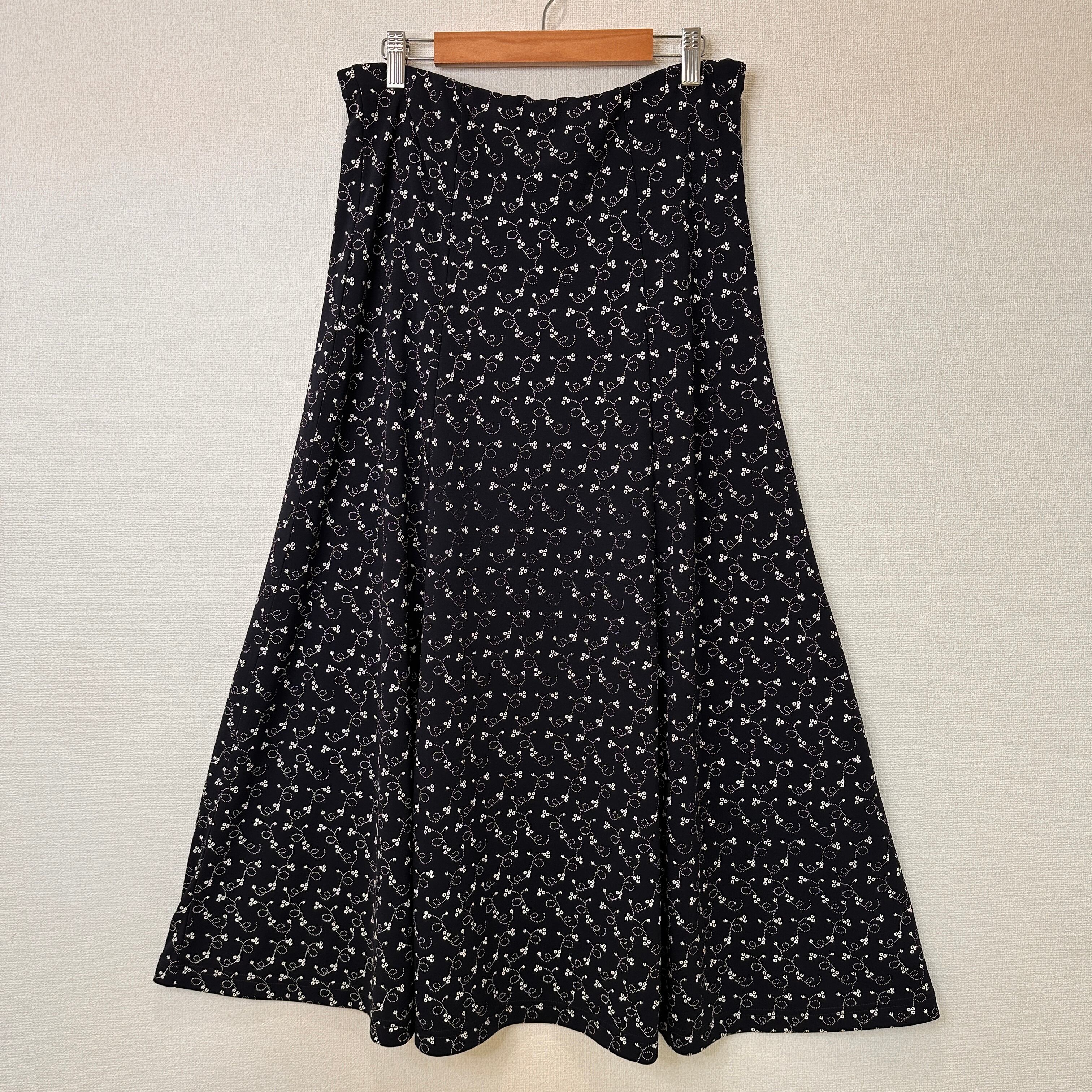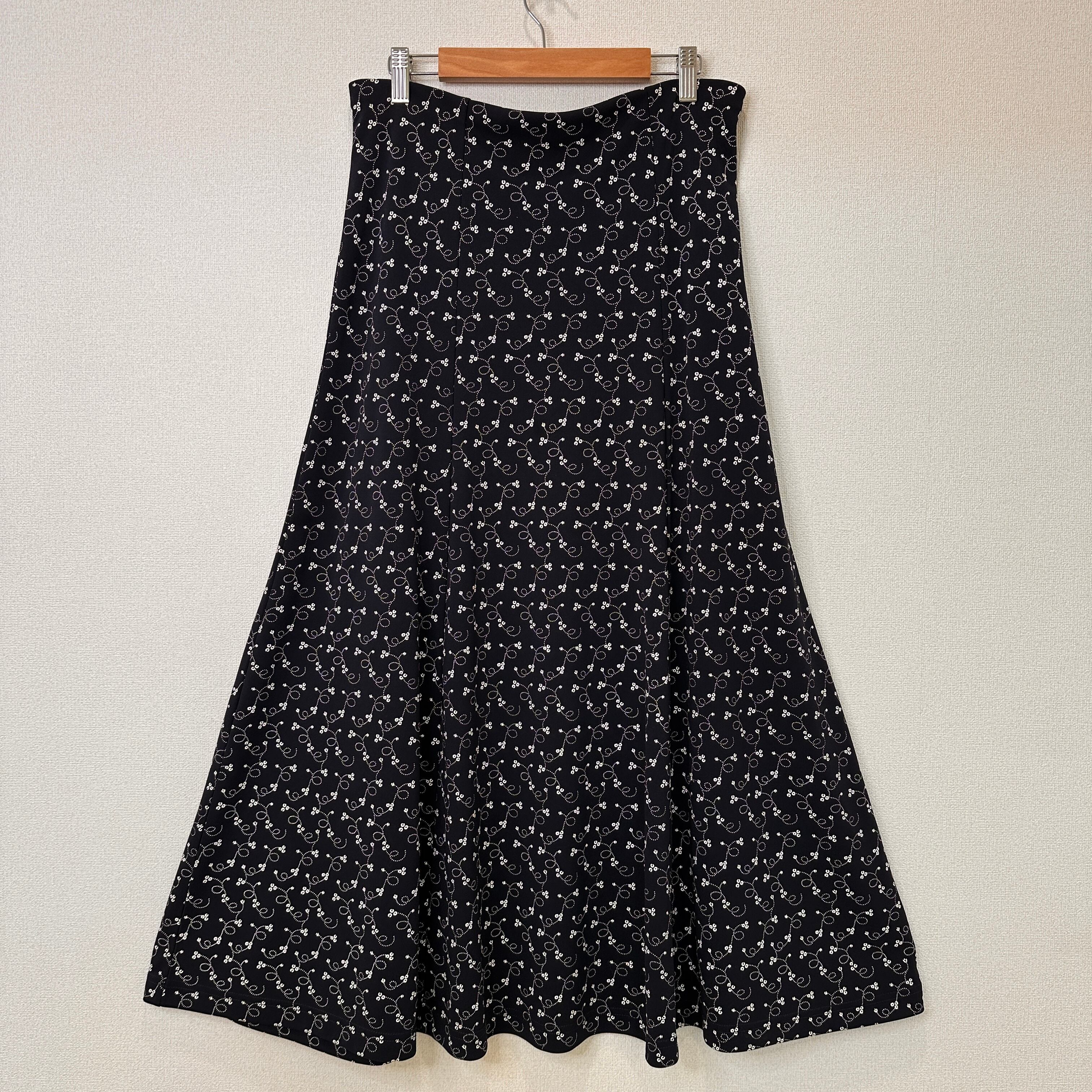 濃いネイビーまたは黒に近い色地に、白の小花柄や渦巻き柄が全体にあしらわれた、Aラインのロングスカートです。