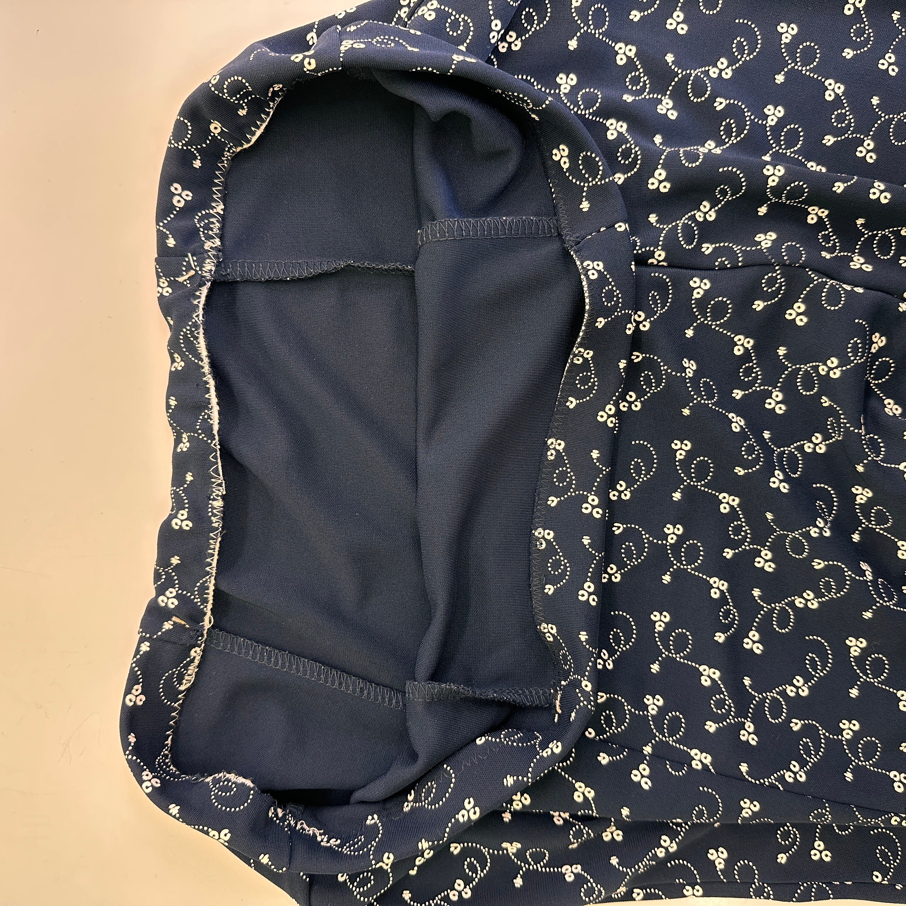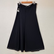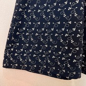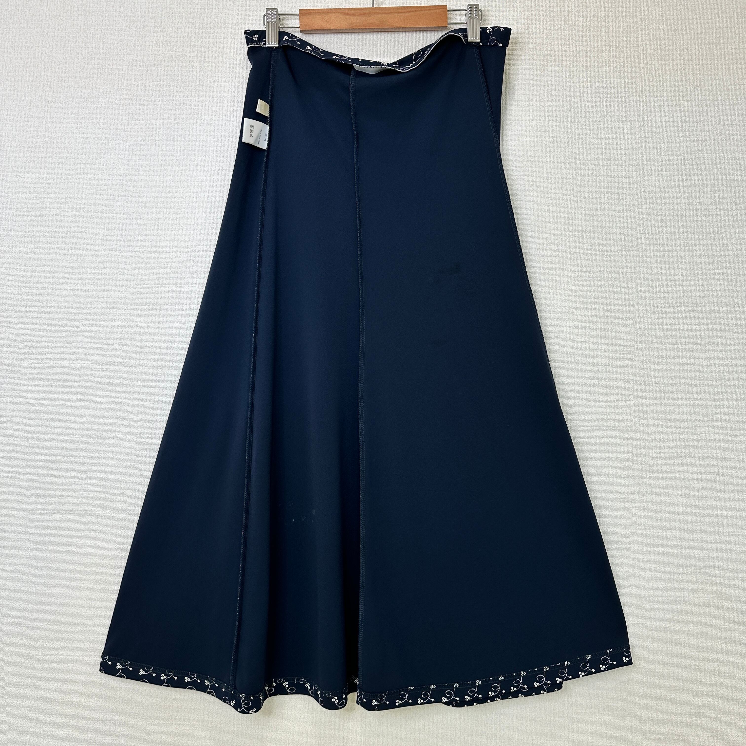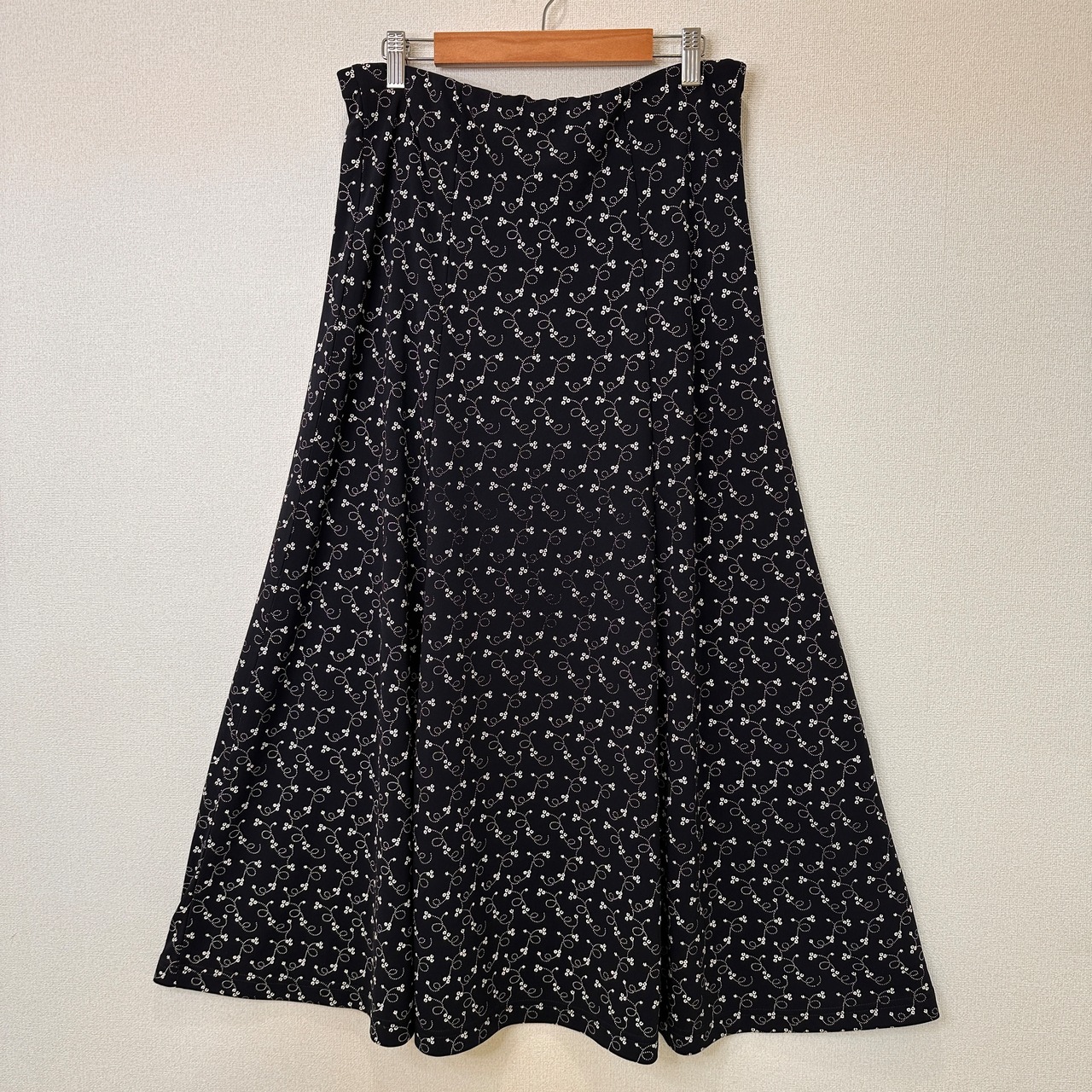 濃いネイビーまたは黒に近い色地に、白の小花柄や渦巻き柄が全体にあしらわれた、Aラインのロングスカートです。