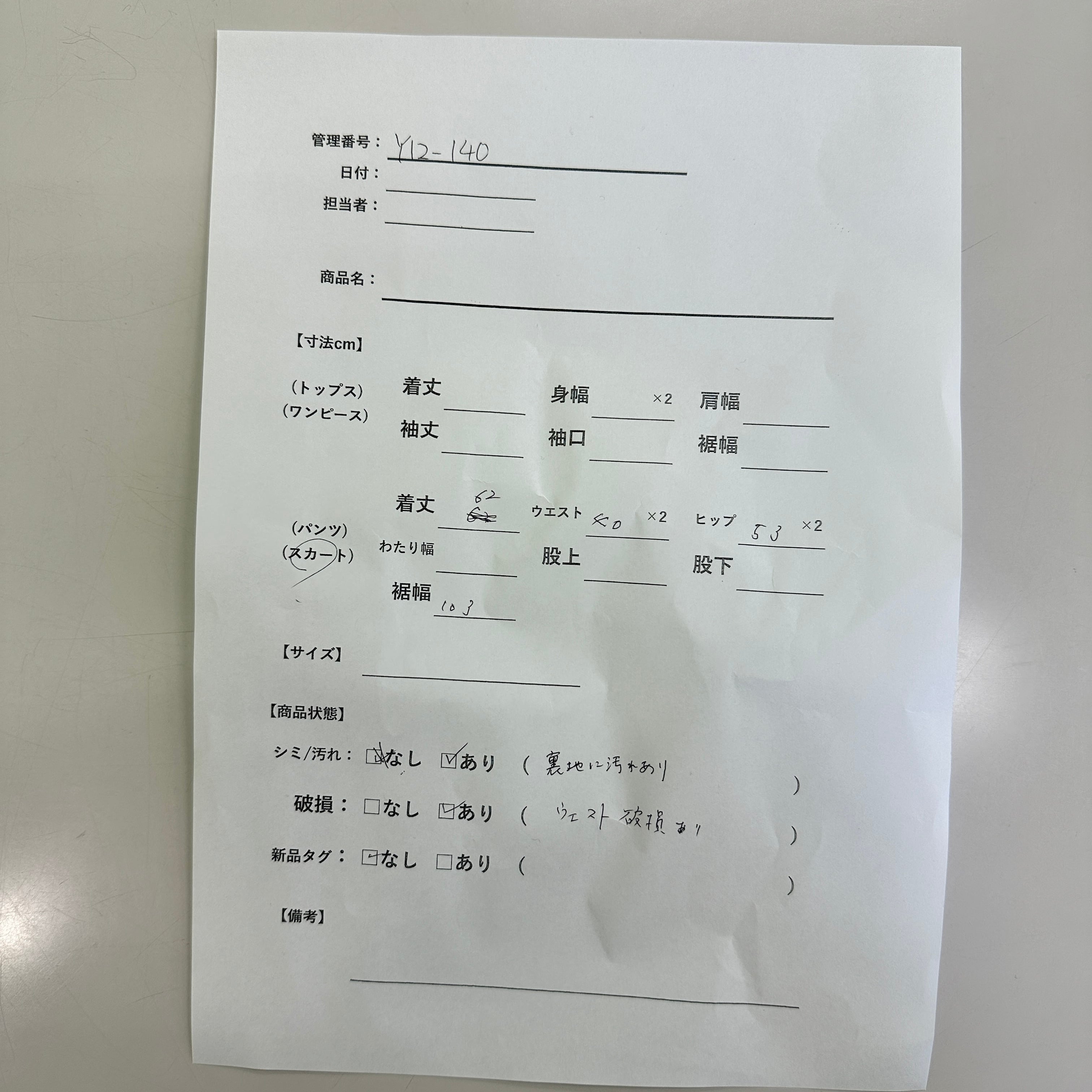 破損: あり(ウエスト破損あり)