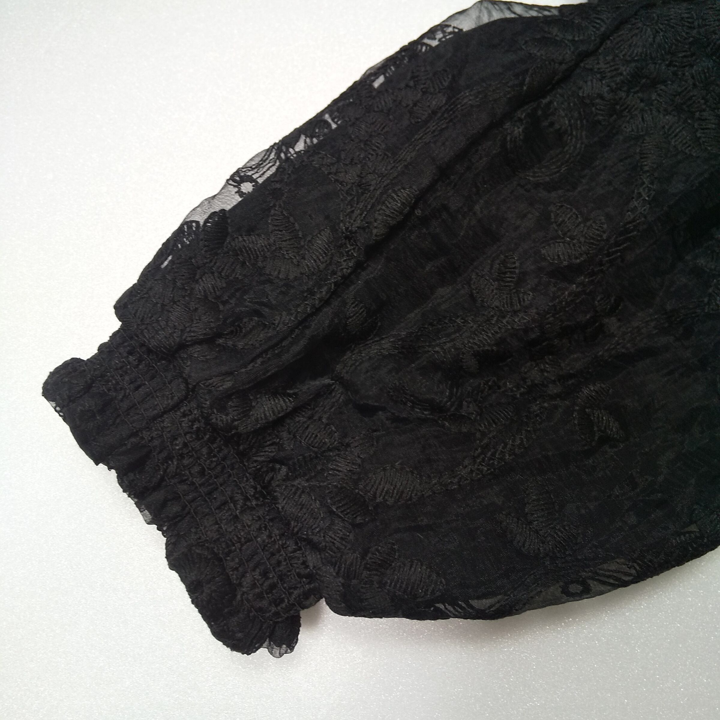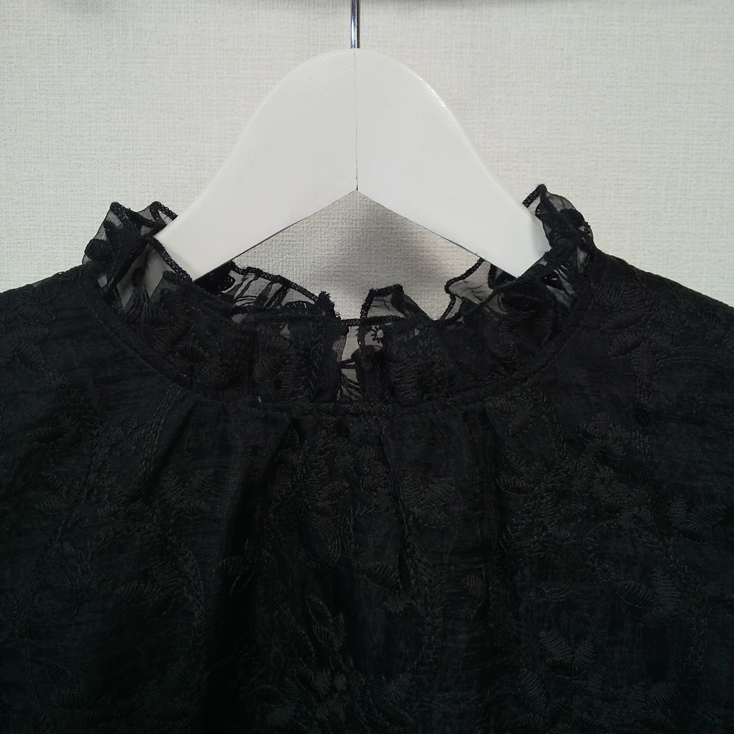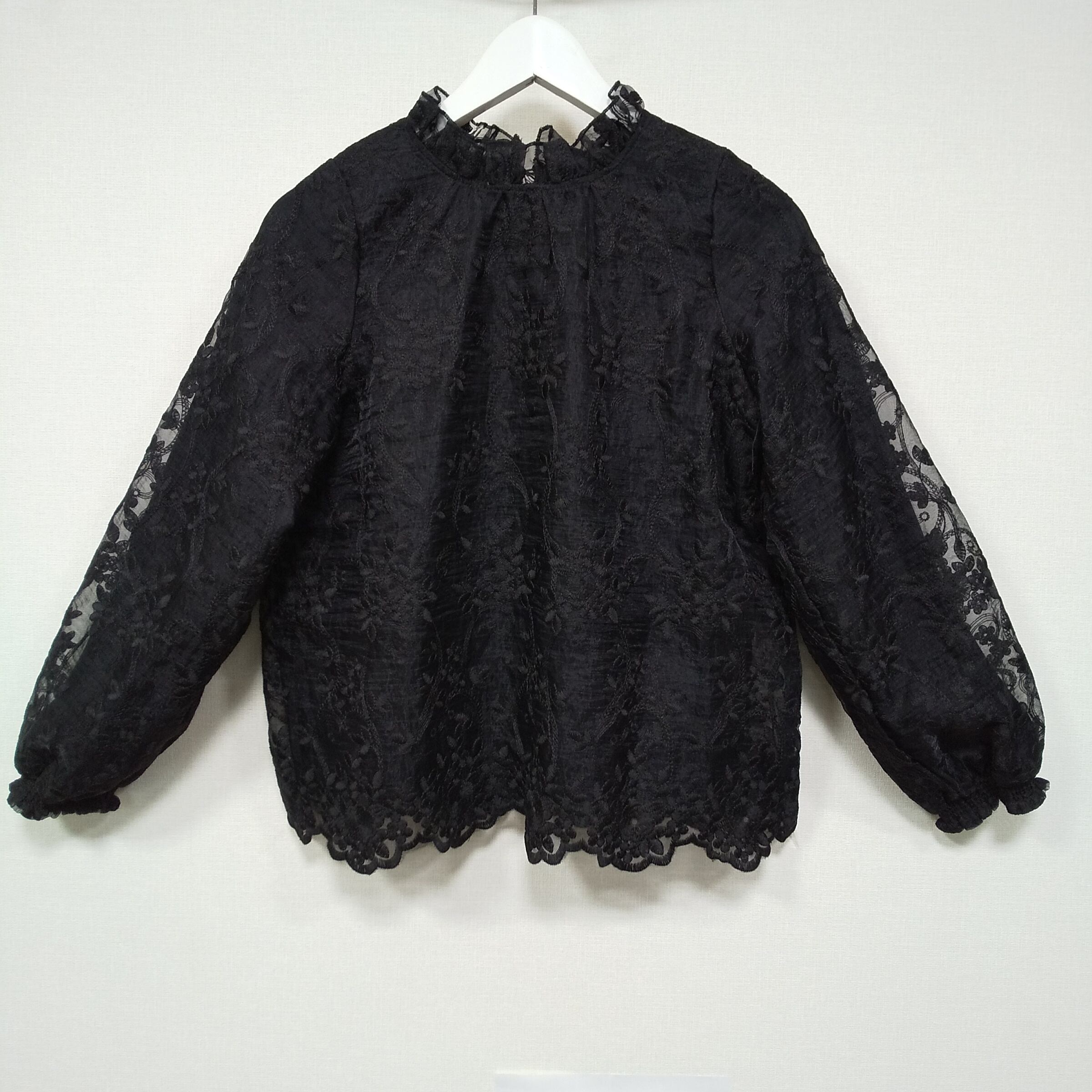 ハイネックデザインに、ネックラインと裾部分はスカラップカット仕様。繊細な刺繍レースが全体に施されており、華やかさがありながらも落ち着いた印象で着用できます。程よい透け感があり、インナー次第で雰囲気を変えられるのも魅力です。