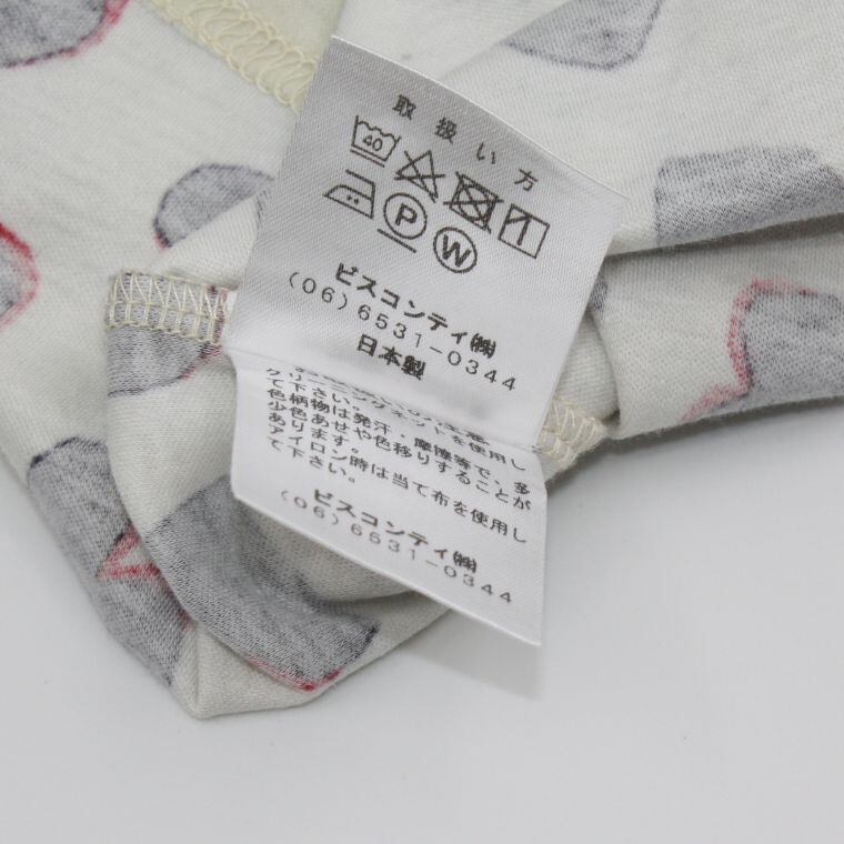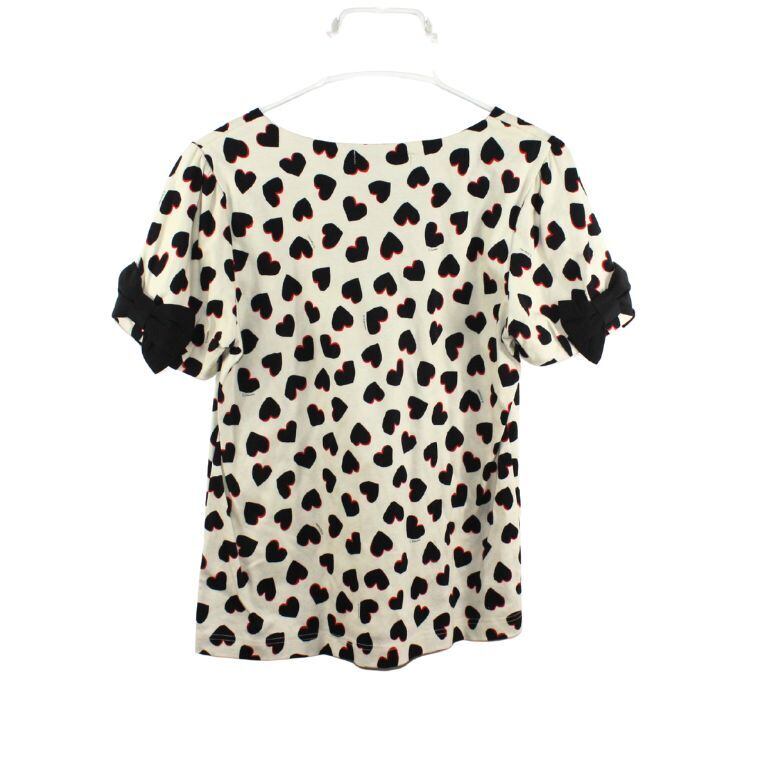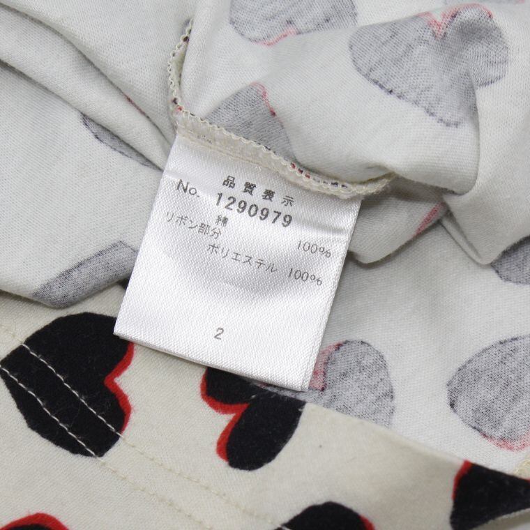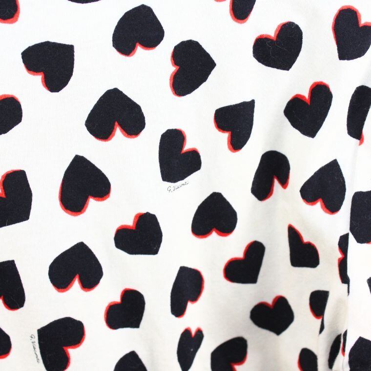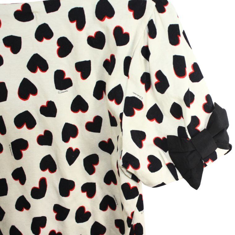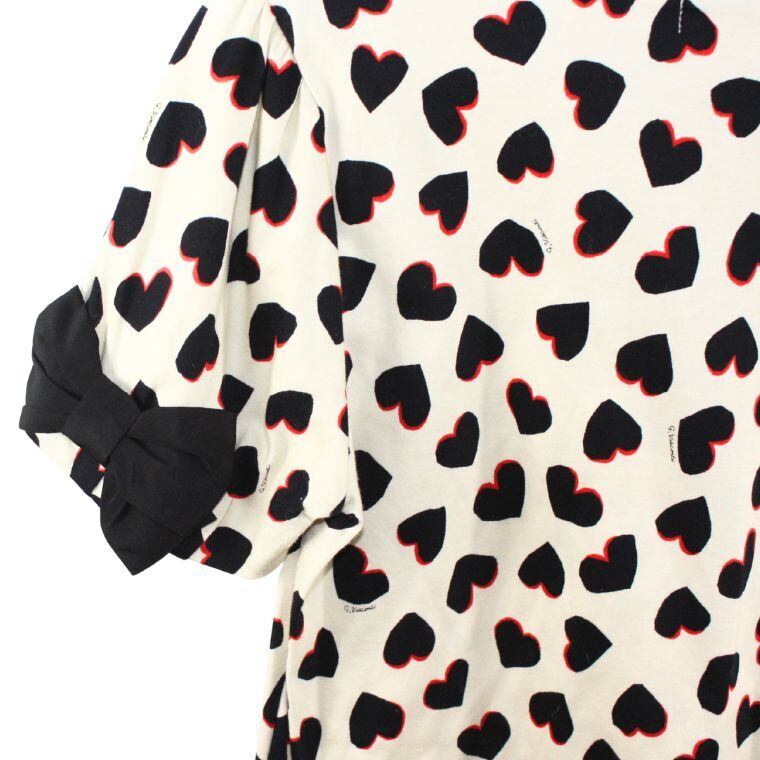 アイボリーカラーをベースに、ブラックとレッドのハート柄が全面にあしらわれたデザイン性の高いトップスです。