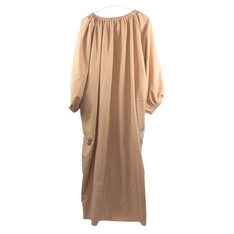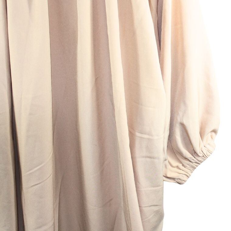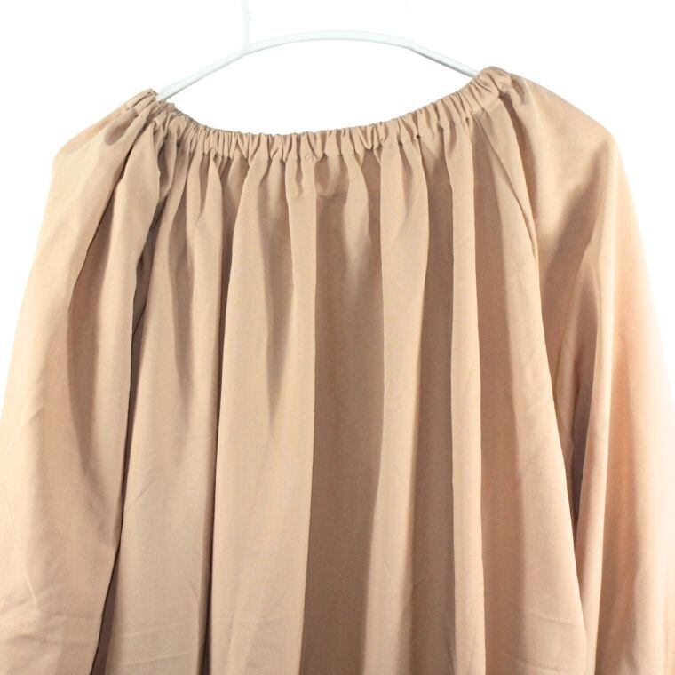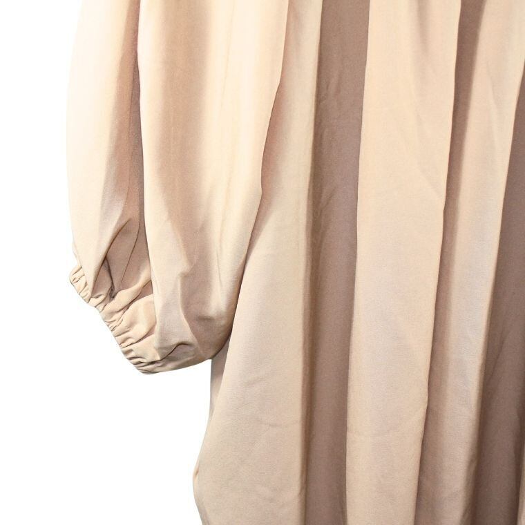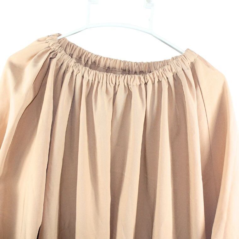 ギャザーネックデザインが特徴的な、ベージュカラーのロングワンピースです。