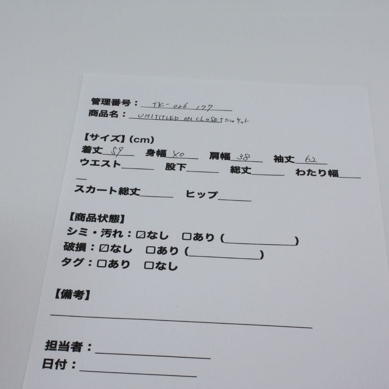 目立つシミや汚れ、破損は見受けられず、タグも付いているため、中古品としては比較的良好な状態です。UNTITLED系ブランドのジャケットをお探しの方や、きれいめで使いやすいテーラードジャケットをお求めの方に適した一着です。