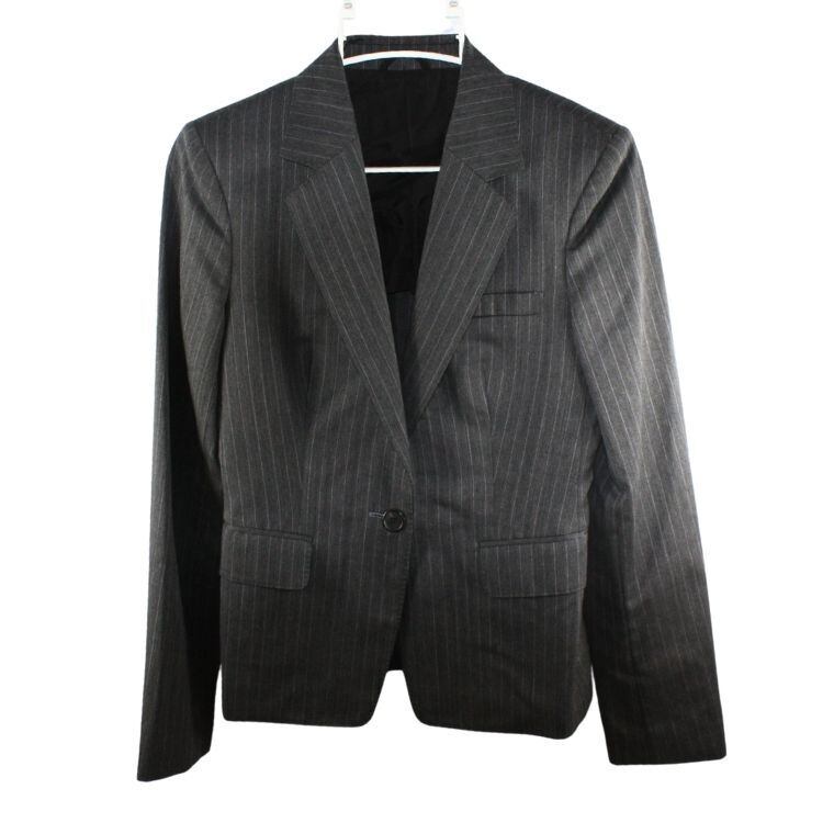 シルエットはウエストラインがすっきりとしたデザインで、全体的にコンパクトな印象です。フロントはシングルボタン仕様で、羽織った際にバランスよく見える作りになっています。パンツやスカートのどちらとも合わせやすく、通勤用や式典、きちんとした場面での着用にも向いています。