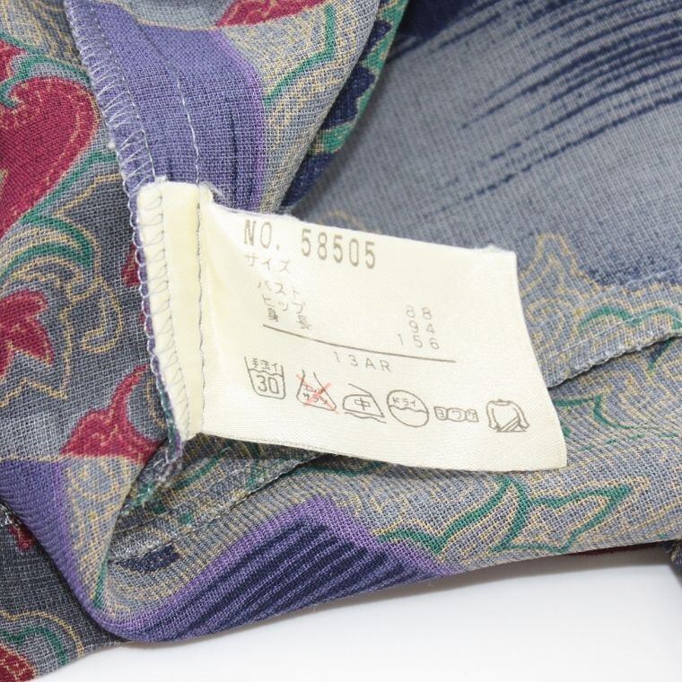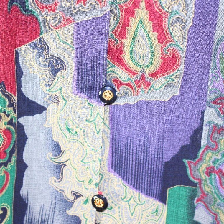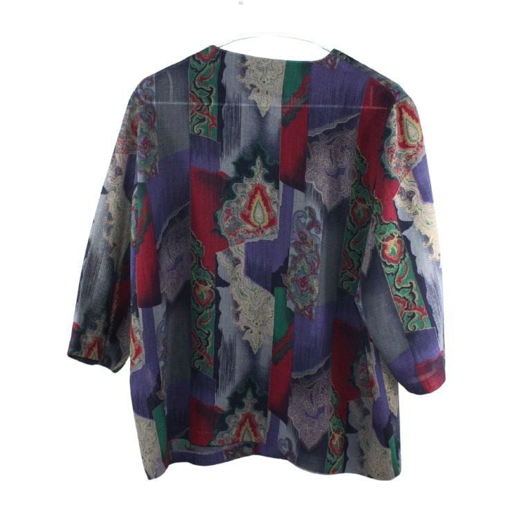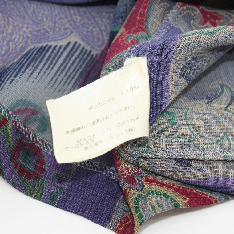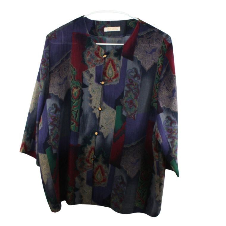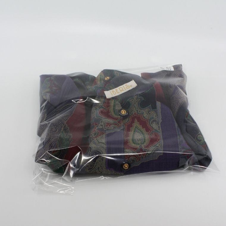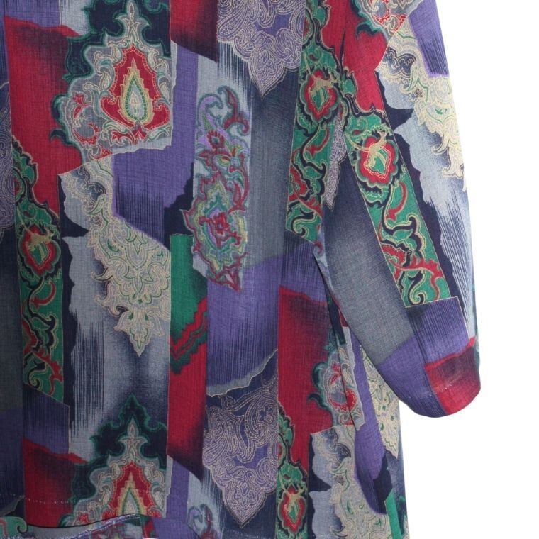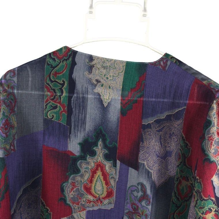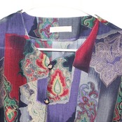 目立つシミや汚れ、破損は見受けられず、タグも付いているため、中古品としては比較的良好な状態です。柄物ブラウスをお探しの方や、落ち着いたデザインで個性のあるトップスをお求めの方に適した一着です。