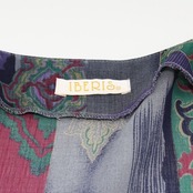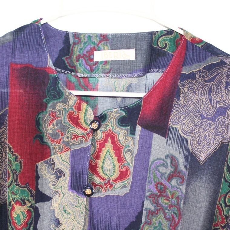 IBERIS(イベリス)の総柄ブラウスです。落ち着いたネイビー系をベースに、グリーンやボルドー、パープルなど複数の色味を組み合わせた柄デザインが特徴的な一着です。派手すぎない配色のため、個性的でありながらもコーディネートに取り入れやすく、上品な印象で着用できます。