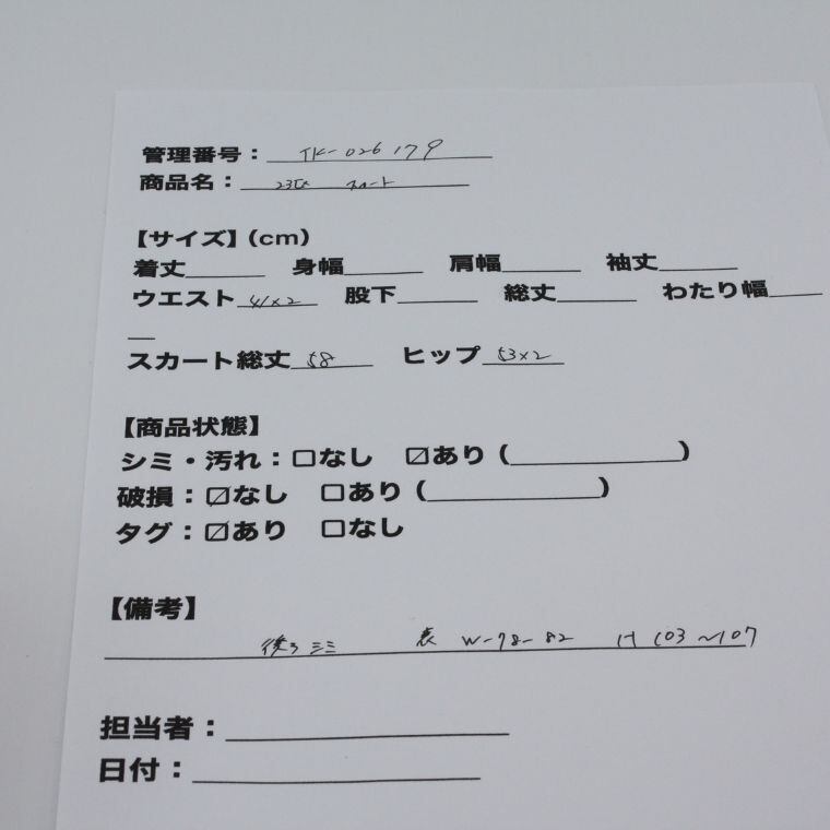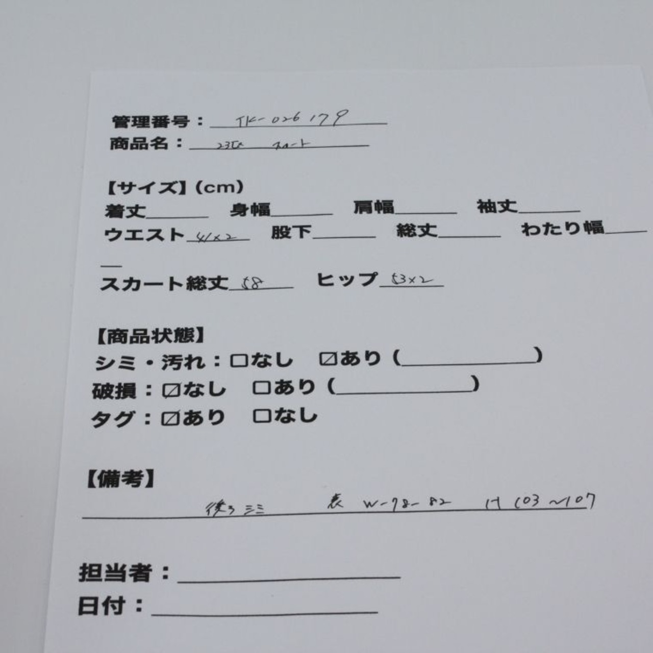 後ろ部分に小さなシミがありますが、着用時に大きく目立つものではありません。その他に目立つ破損は見受けられず、全体としては中古品として一般的なコンディションです。23区のスカートをお探しの方や、ベーシックで使いやすいフレアスカートをお求めの方に適した一着です。
