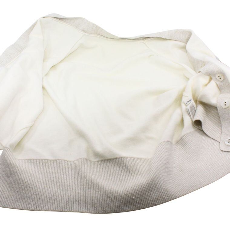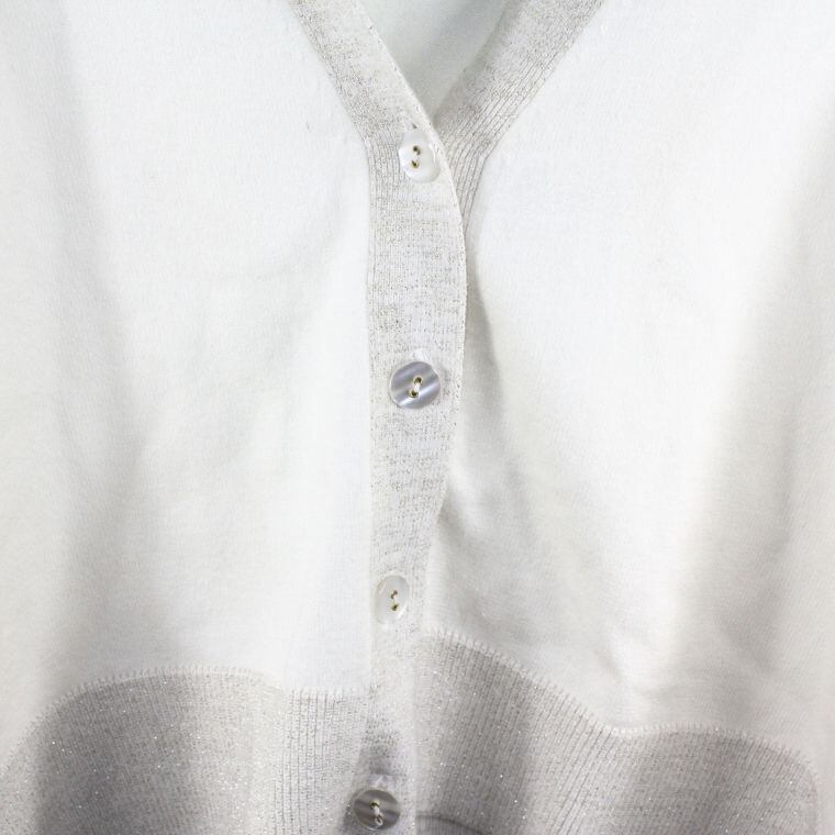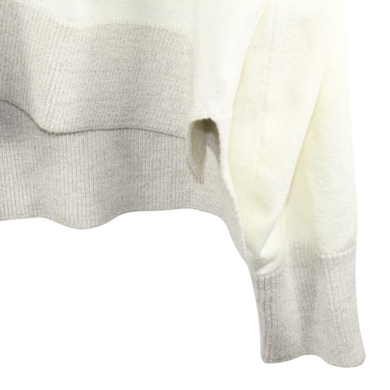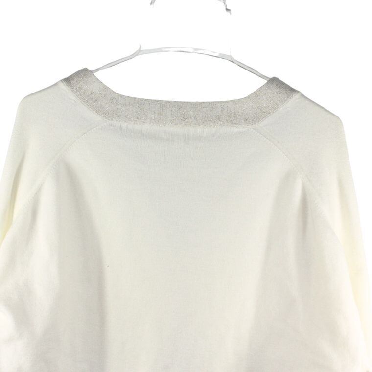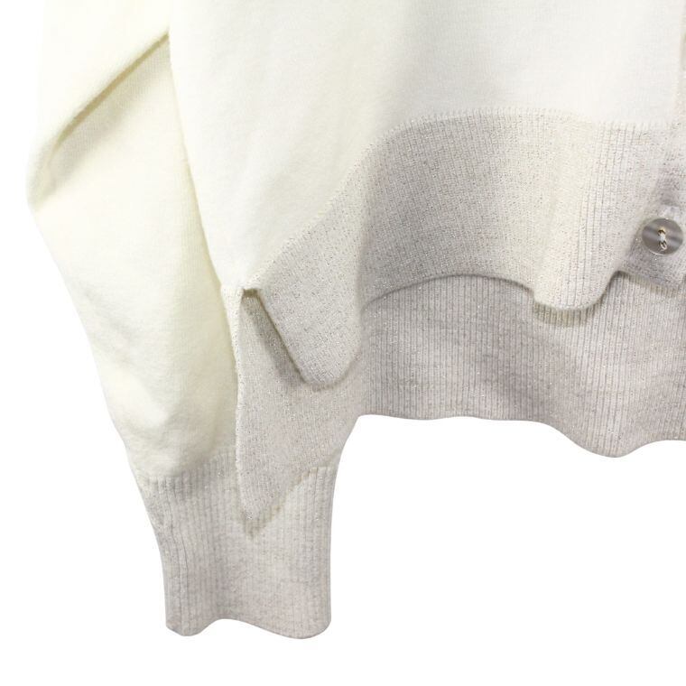 柔らかく落ち感のあるニット素材に、裾・前立て部分のラメ切替デザインがさりげないアクセントになった一着です。シンプルな配色ながら、光の当たり方で上品にきらめくラメが大人らしい印象を演出します。