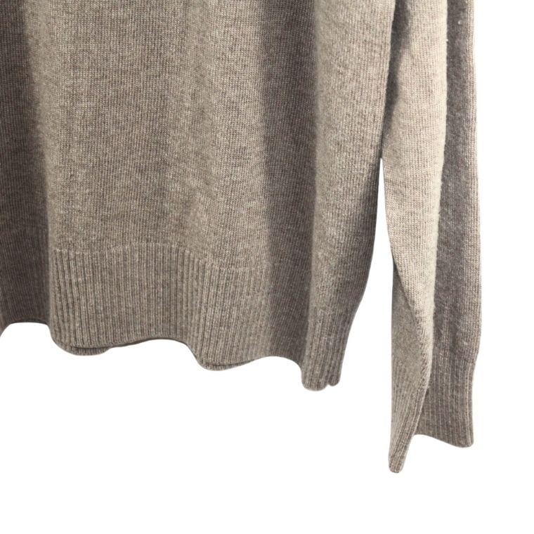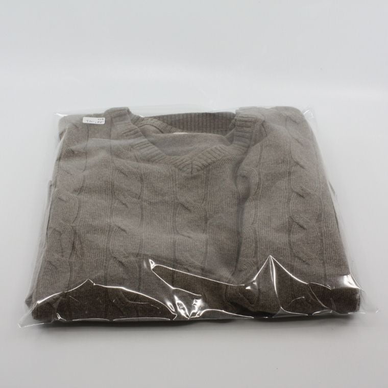 落ち着いたグレー系カラーで、ケーブル編み特有の立体感があり、シンプルながらも表情のあるデザインです。Vネック仕様のため、シャツやカットソーとのレイヤードもしやすく、カジュアルからきれいめまで幅広いスタイルに対応します。