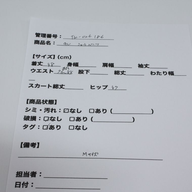 中古品ではありますが、目立ったシミや汚れ、破損は見受けられず、タグも付いている状態です。全体的にコンディションは良好で、まだまだ快適にご着用いただけます。状態につきましては、掲載画像とあわせてご確認ください。シンプルで実用性の高いGUのスウェットショートパンツをお探しの方におすすめの一着です。