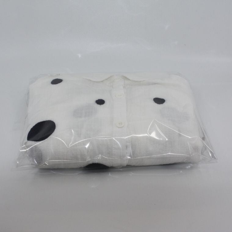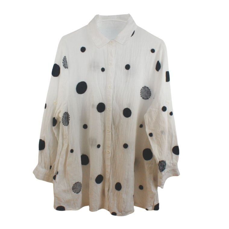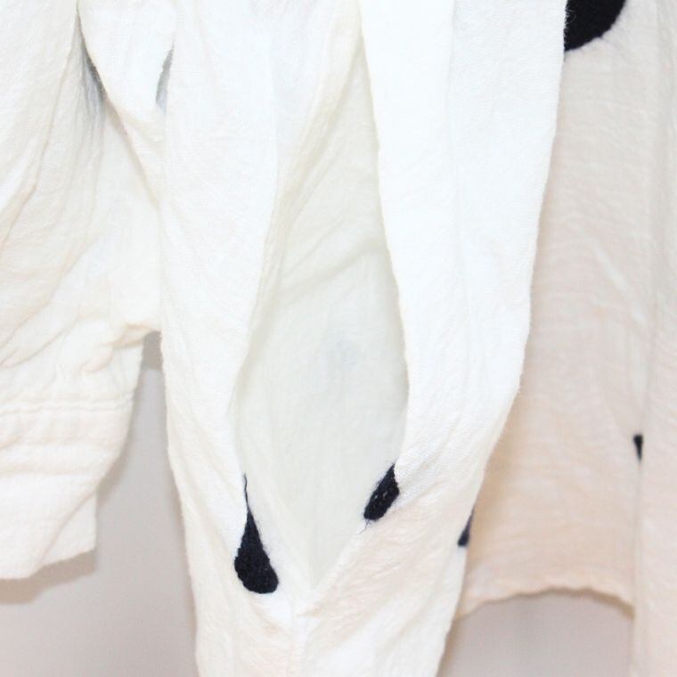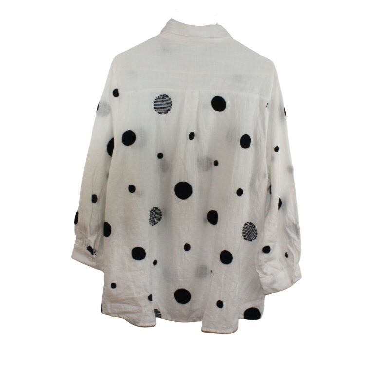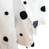 やわらかな白地にブラックのドット柄が映える、シャツ?タイプのトップスです。全体は軽やかな風合いで、透け感のある生地感が特徴。フロントはボタン仕様で、羽織りとしても着用しやすいデザインです。ポケットが2か所付いており、実用性も備えています。