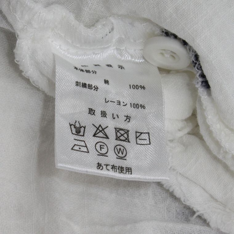 素材表示より、本体部分は綿100%、刺繍部分はレーヨン100%。肌当たりがやさしく、長時間の着用でも快適さが期待できます。袖は七分袖程度で、季節の変わり目や冷房対策にも使いやすい一着です。