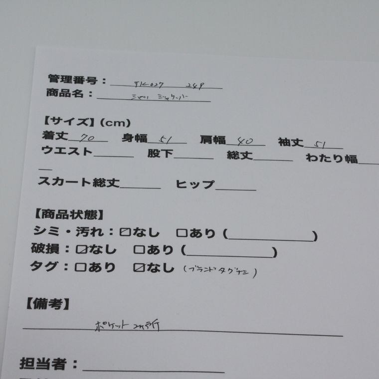 管理シート記載では、シミ・汚れ・破損はいずれも「なし」。ブランドタグは確認できず、ブランド名は不明です。品質表示タグは確認でき、素材表記が明記されています。