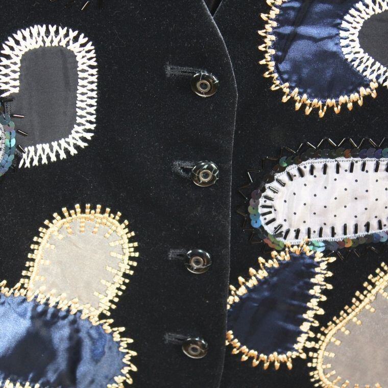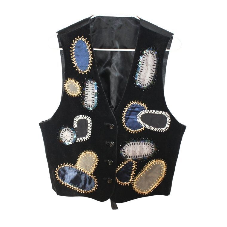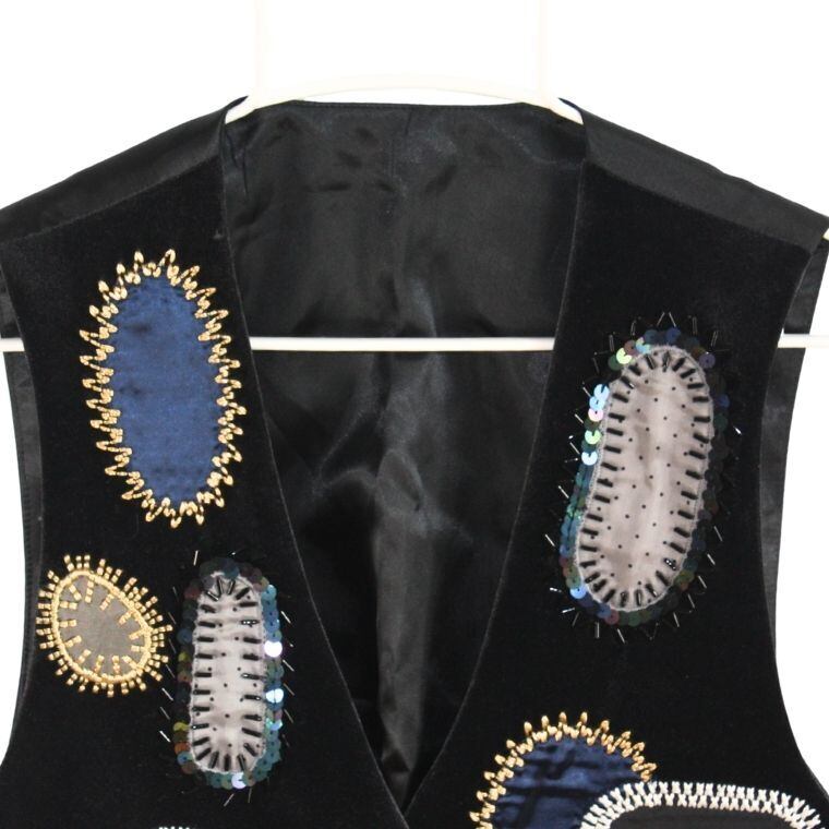 ブラックカラーをベースに、楕円形モチーフの装飾が全体に施されたベストです。フロントには複数の異素材風パーツが縫い付けられており、刺繍や縁取り装飾によって立体感のあるデザインに仕上がっています。左右で配置や色味が異なり、アシンメトリーな印象を受ける一着です。