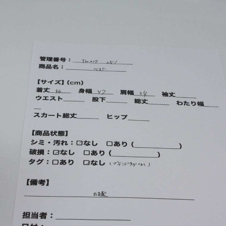 管理シート記載では、シミ・汚れ・破損はいずれも「なし」。ブランドタグは確認できず、ブランド名は不明です。品質表示タグは付いていますが、画像からは素材表記の判別ができません。製造国については、日本製との記載があります。