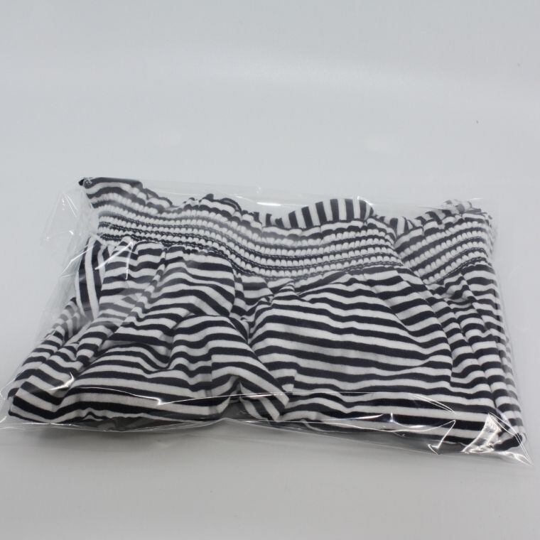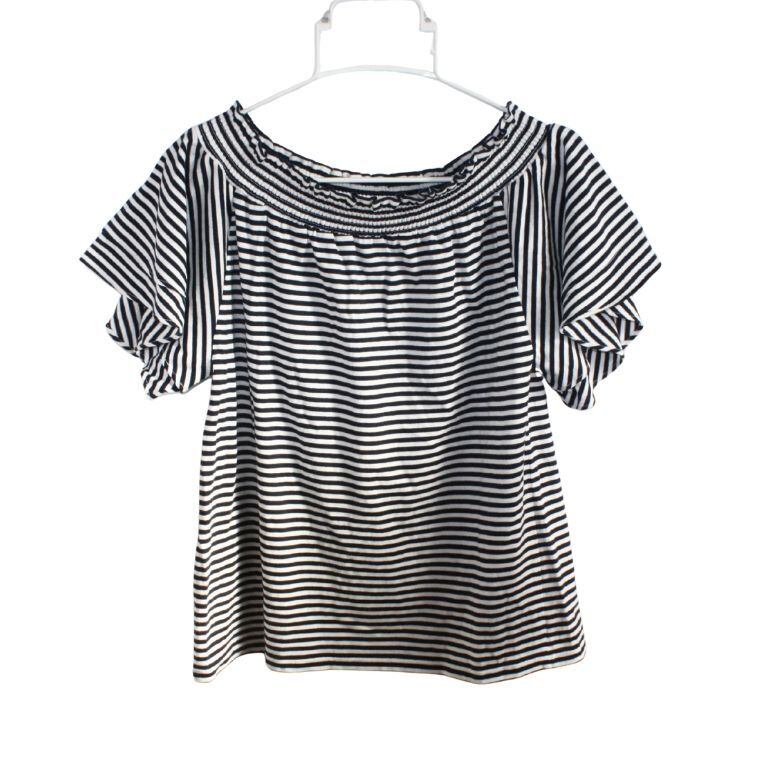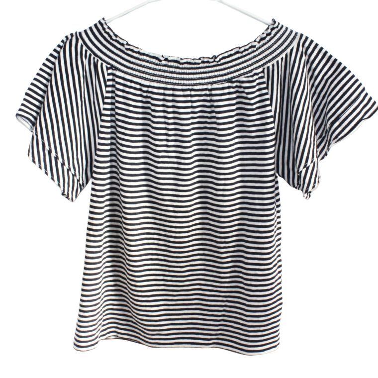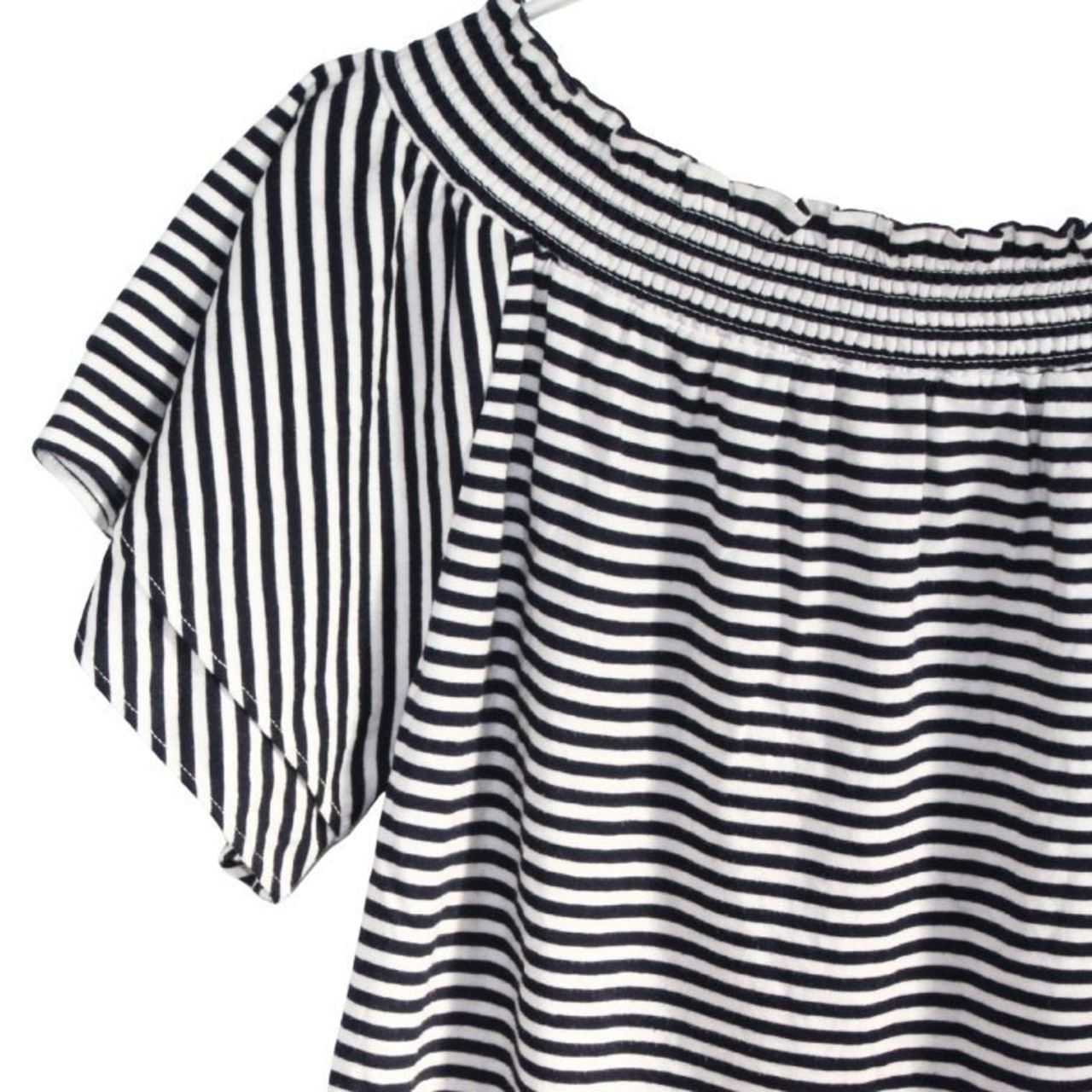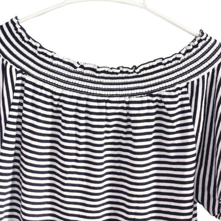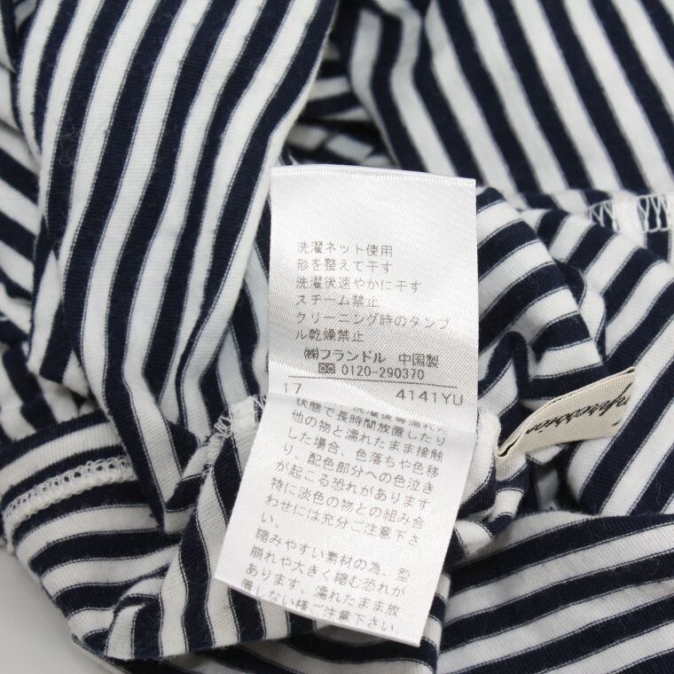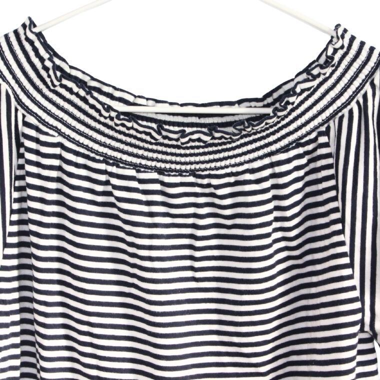 ボーダー柄のためデニムやスカートなど幅広いボトムスと合わせやすく、1枚で着用しても、インナーとしても使いやすいアイテムです。全体の状態や縫製、シャーリング部分の仕様については、掲載画像にてご確認ください。