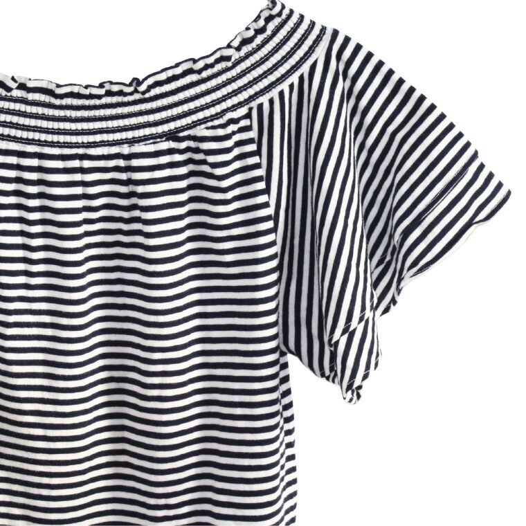 ネイビー×ホワイトのボーダー柄が印象的な半袖トップスです。全体に細めのボーダーが入ったデザインで、カジュアルな雰囲気の中にもすっきりとした印象があります。ネック部分はシャーリング仕様になっており、ギャザーが寄ったデザインのため、首元に自然な立体感が出る作りです。肩から袖にかけては程よいゆとりがあり、締め付け感の少ない着用感が想定されます。