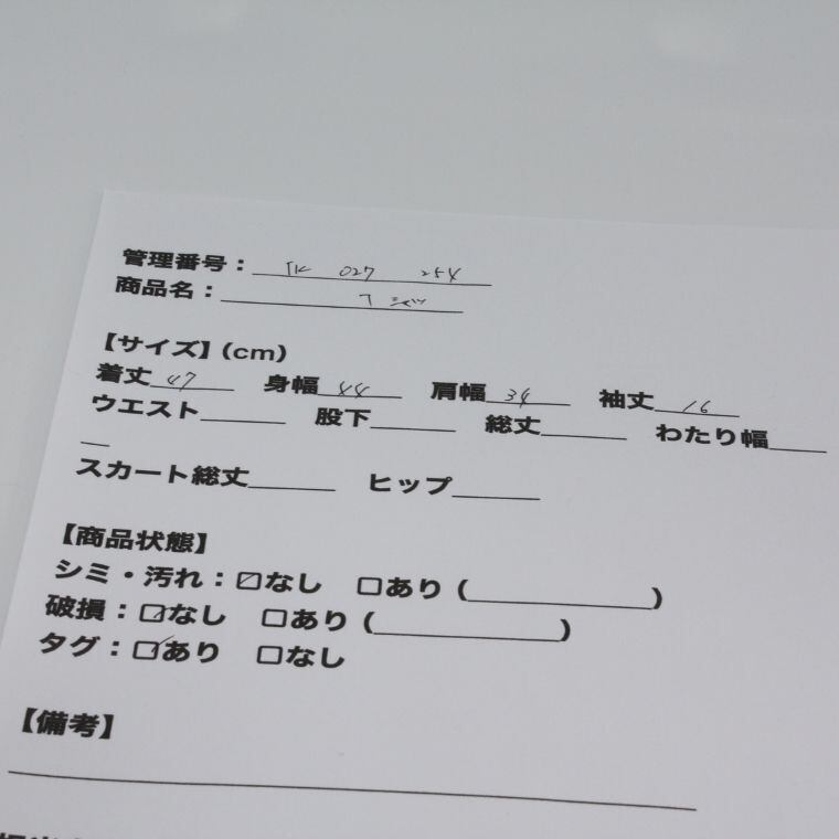 管理シート記載では、シミ・汚れ・破損はいずれも「なし」。タグは「あり」となっており、ブランドタグおよび品質表示タグの両方が確認できます。