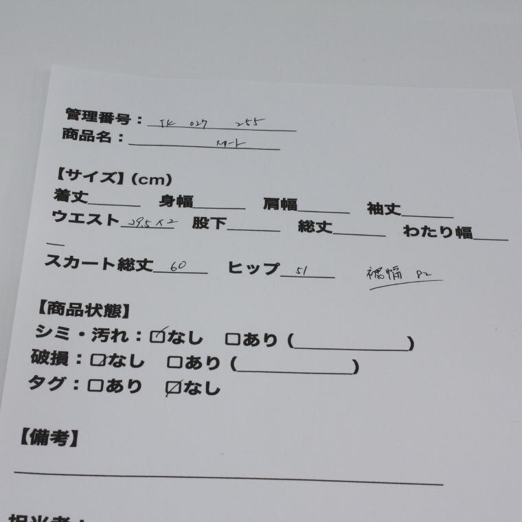管理シート記載では、シミ・汚れ・破損はいずれも「なし」。タグは「なし」となっています。