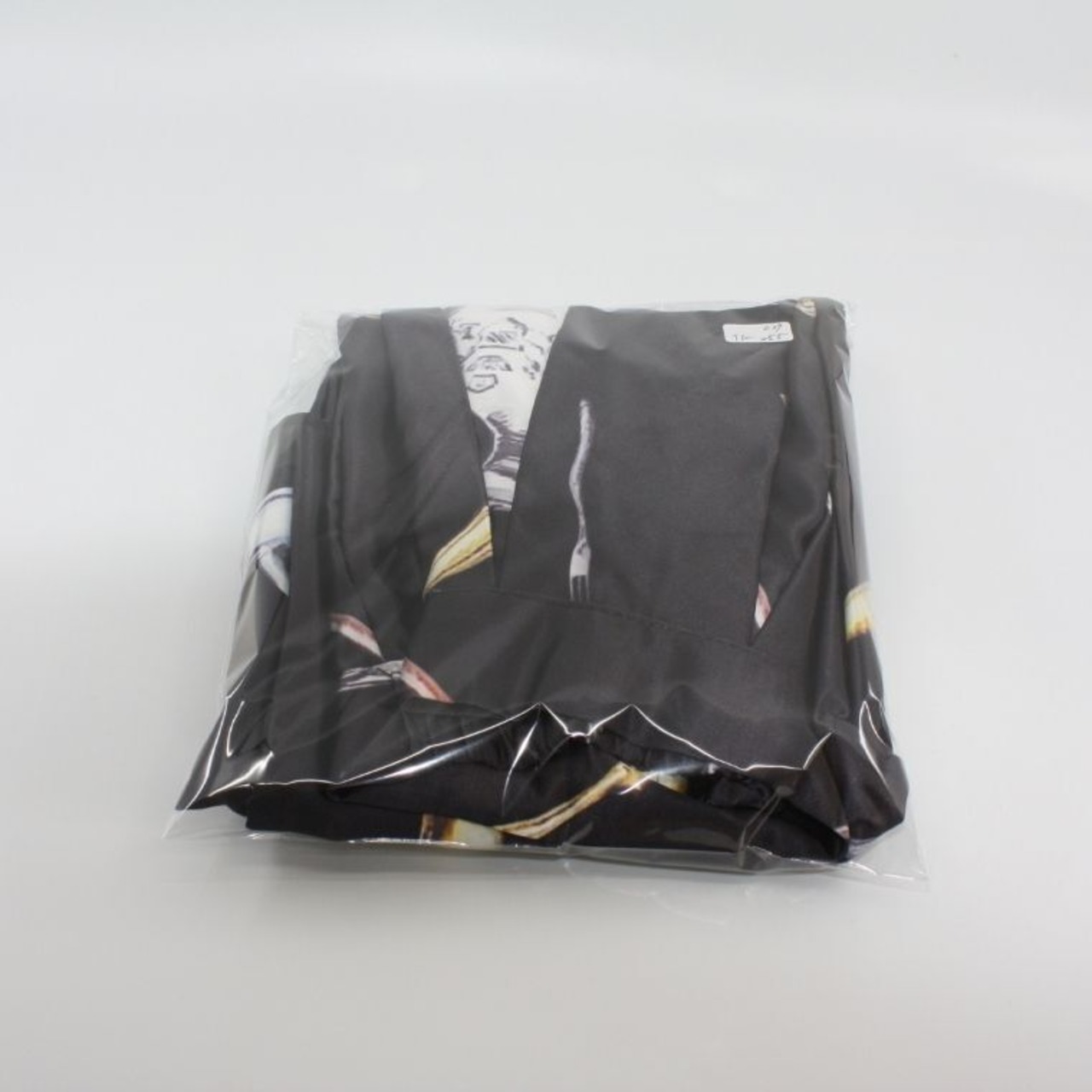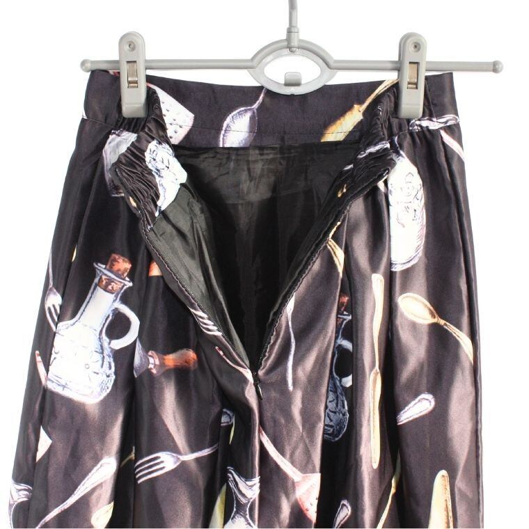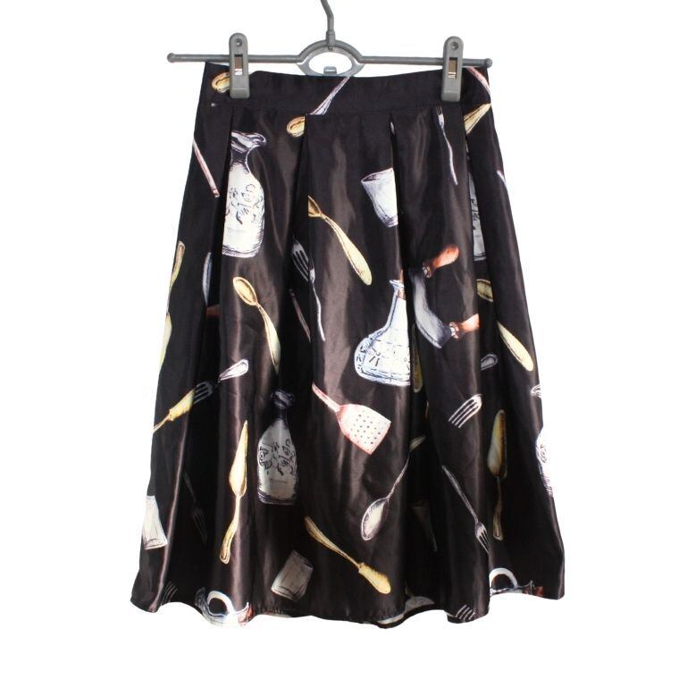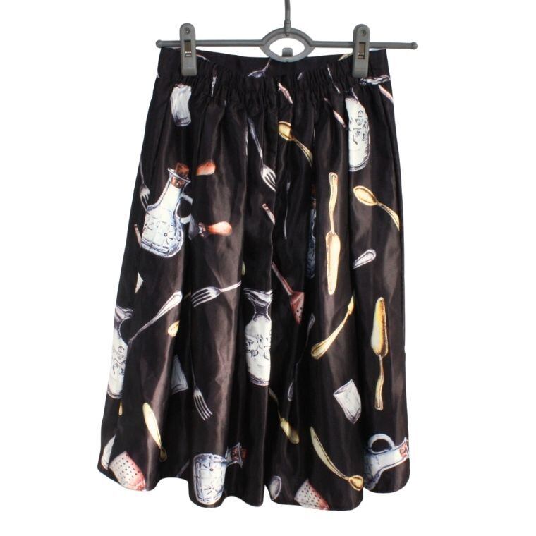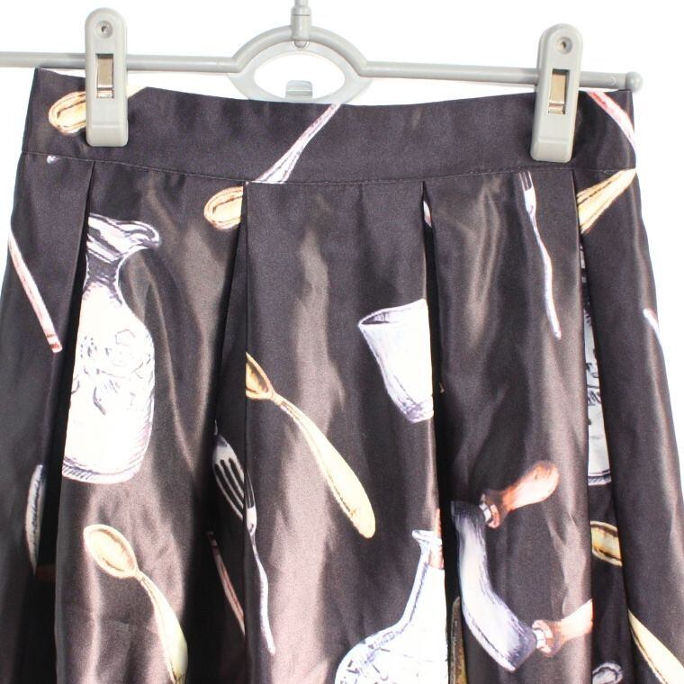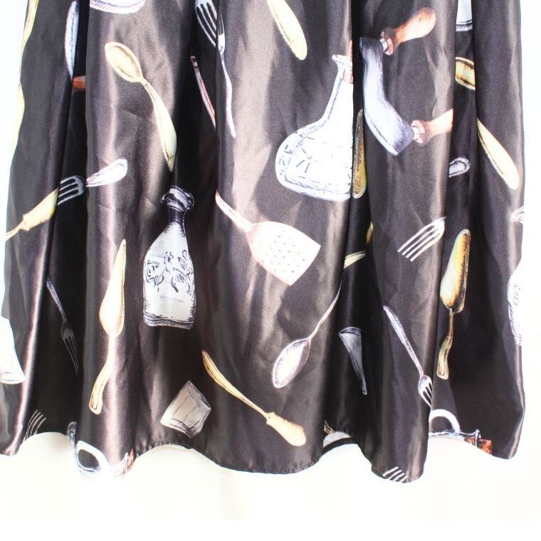 ブラック系カラーをベースに、食器やカトラリーのようなモチーフが全体に描かれた総柄スカートです。落ち着いた色味の中に個性的な柄が配置されており、コーディネートの主役になるデザインが特徴です。シルエットは裾に向かって自然に広がるフレアタイプで、動きのあるラインが出やすい作りです。
