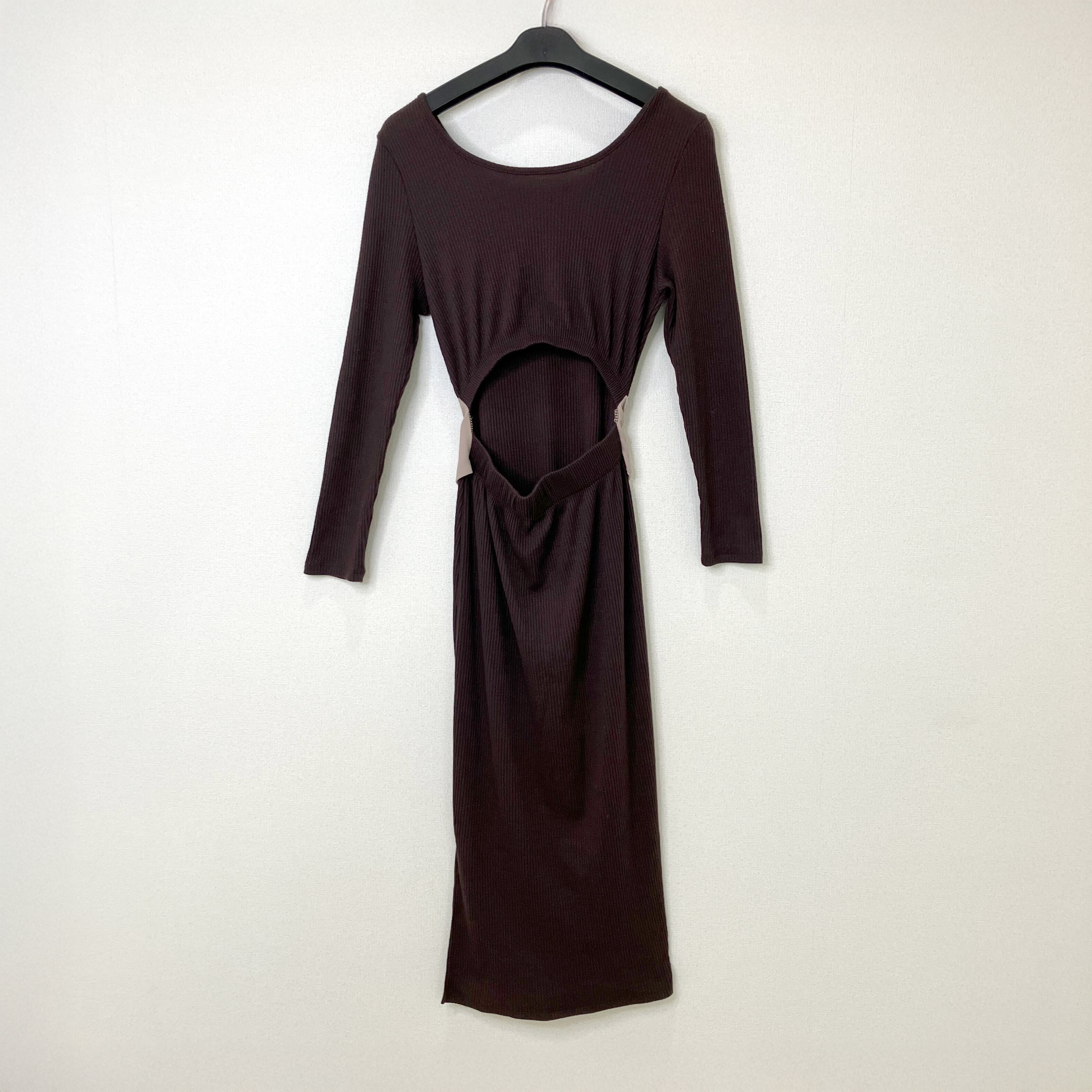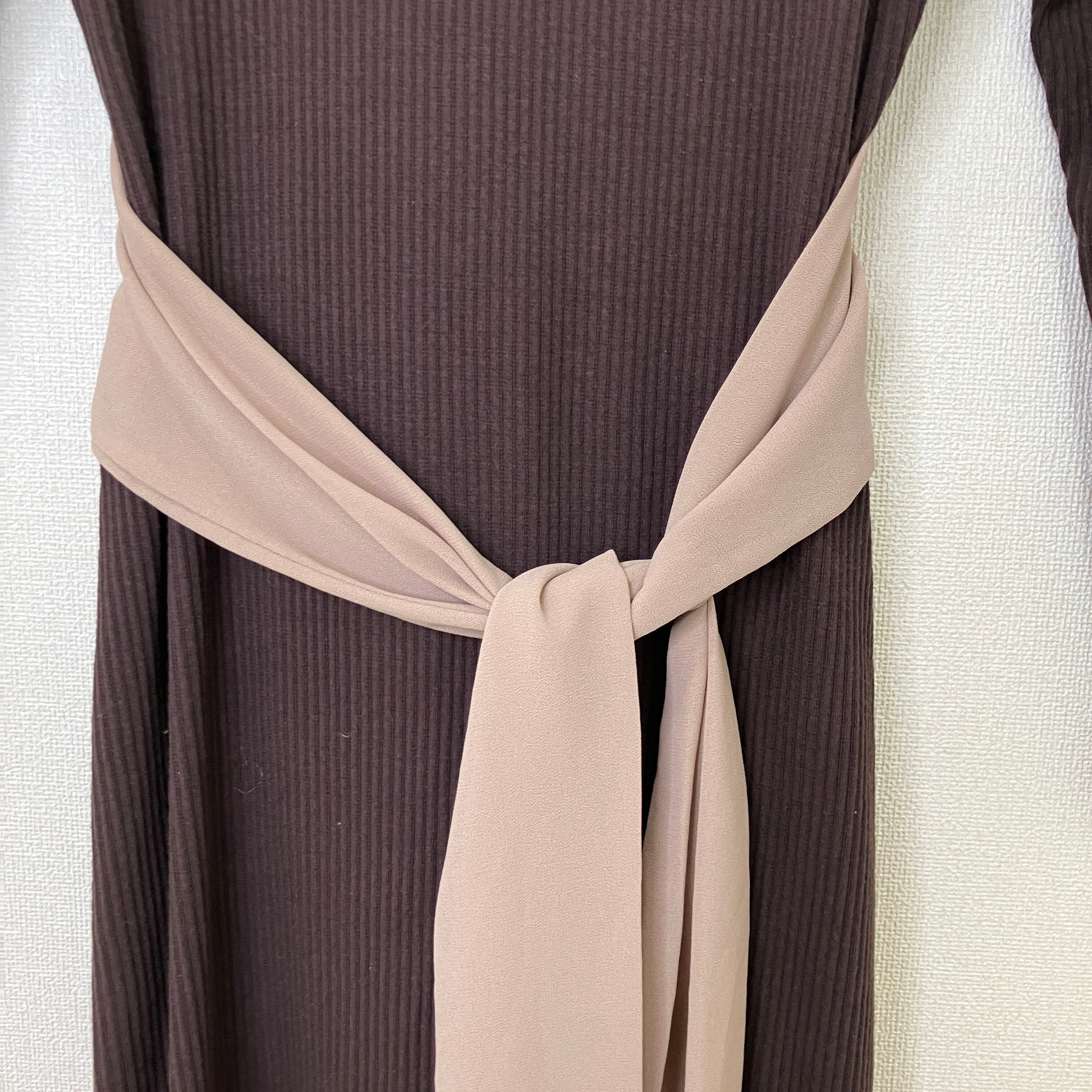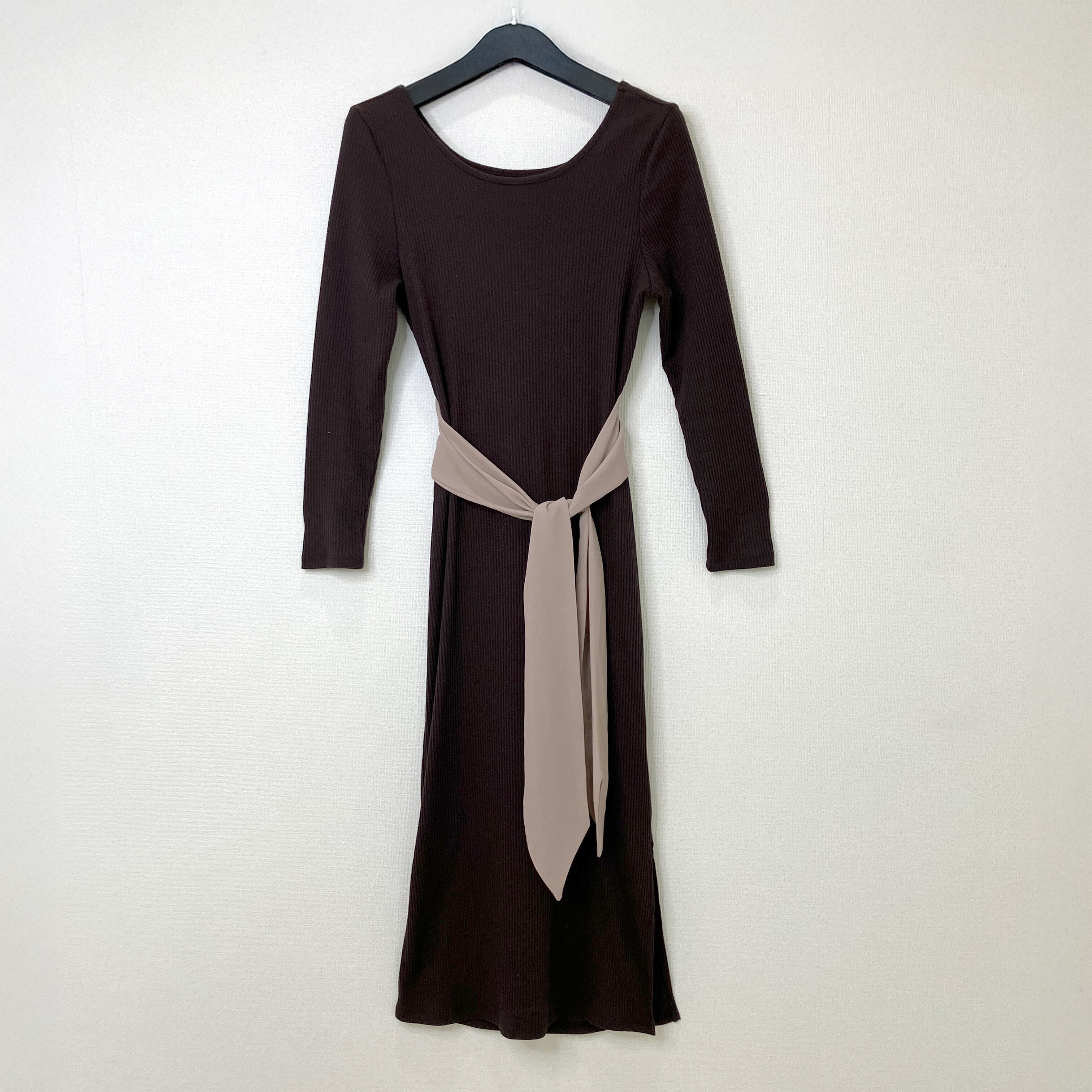 リボン付きのダークブラウンニットワンピース、長袖でラウンドネックデザイン。