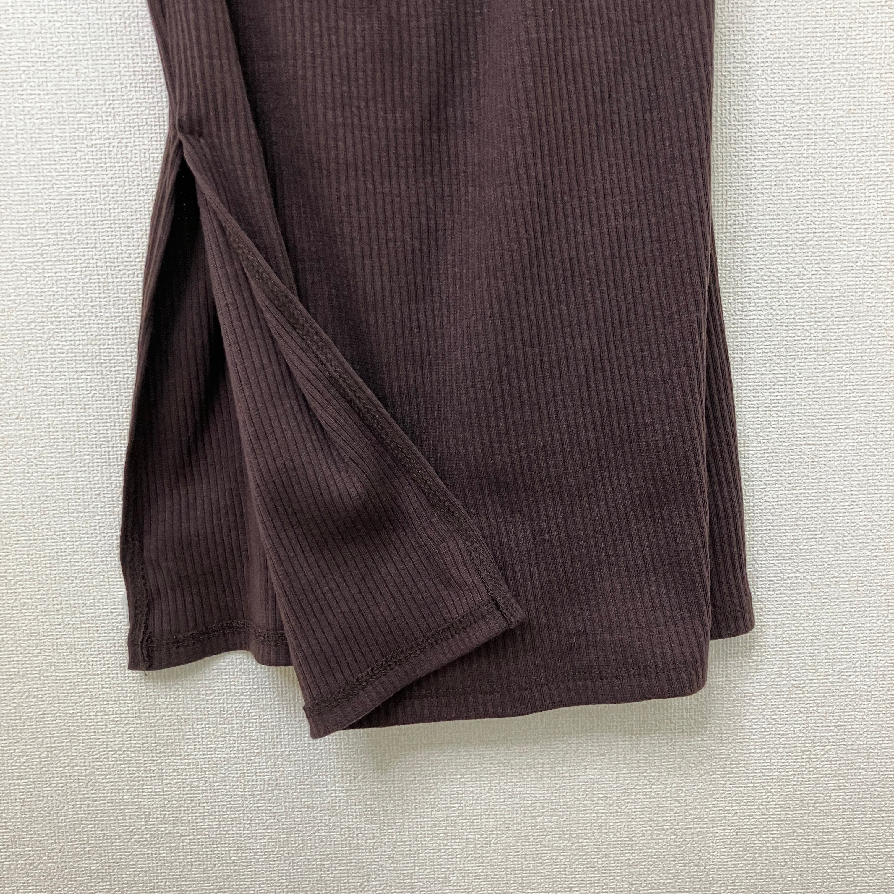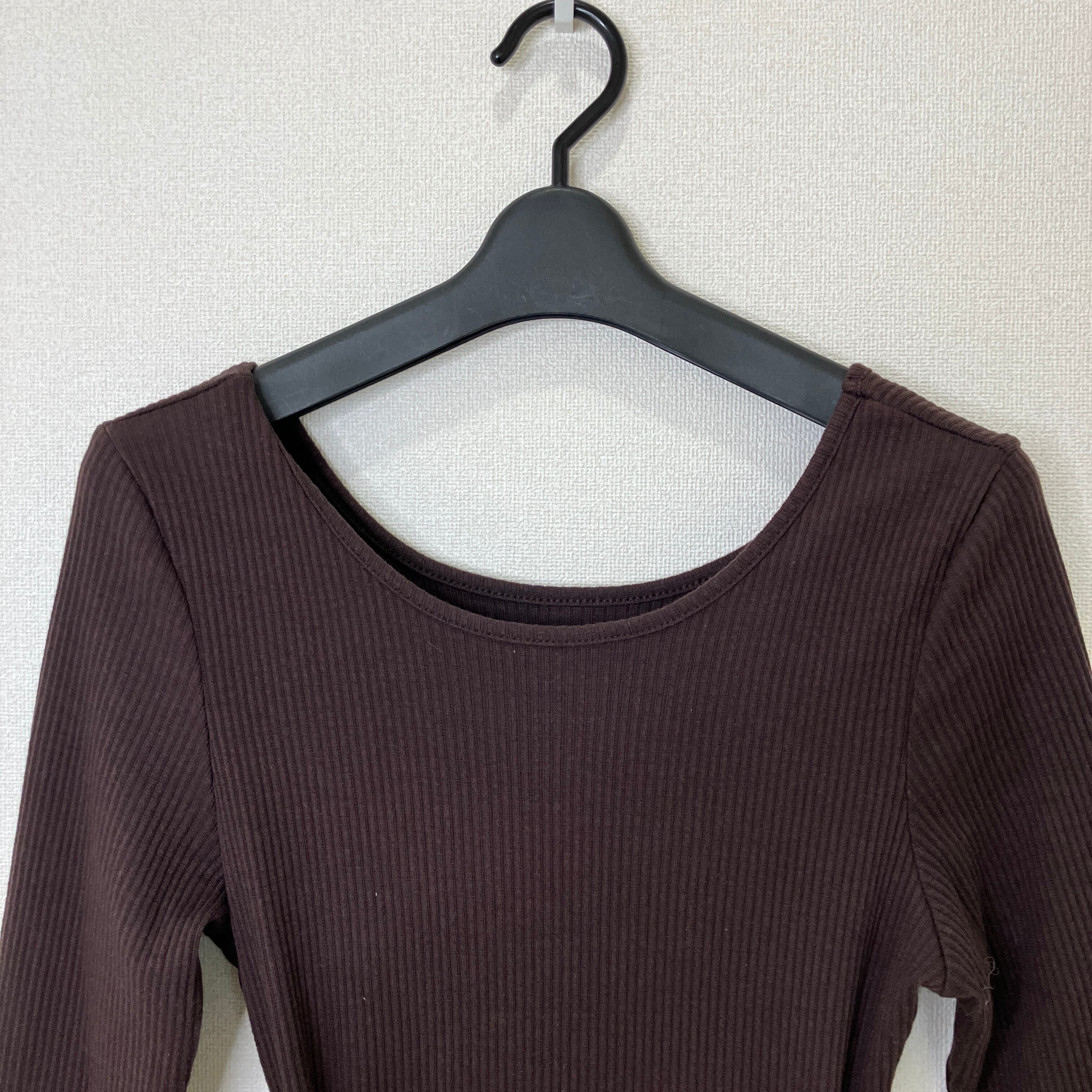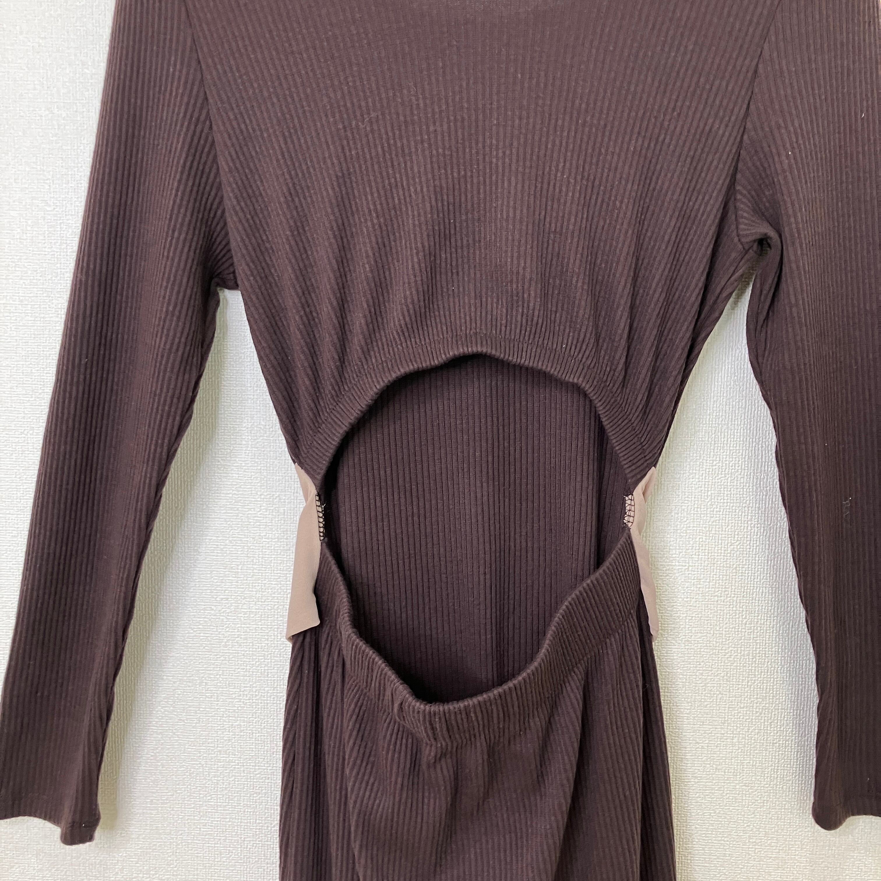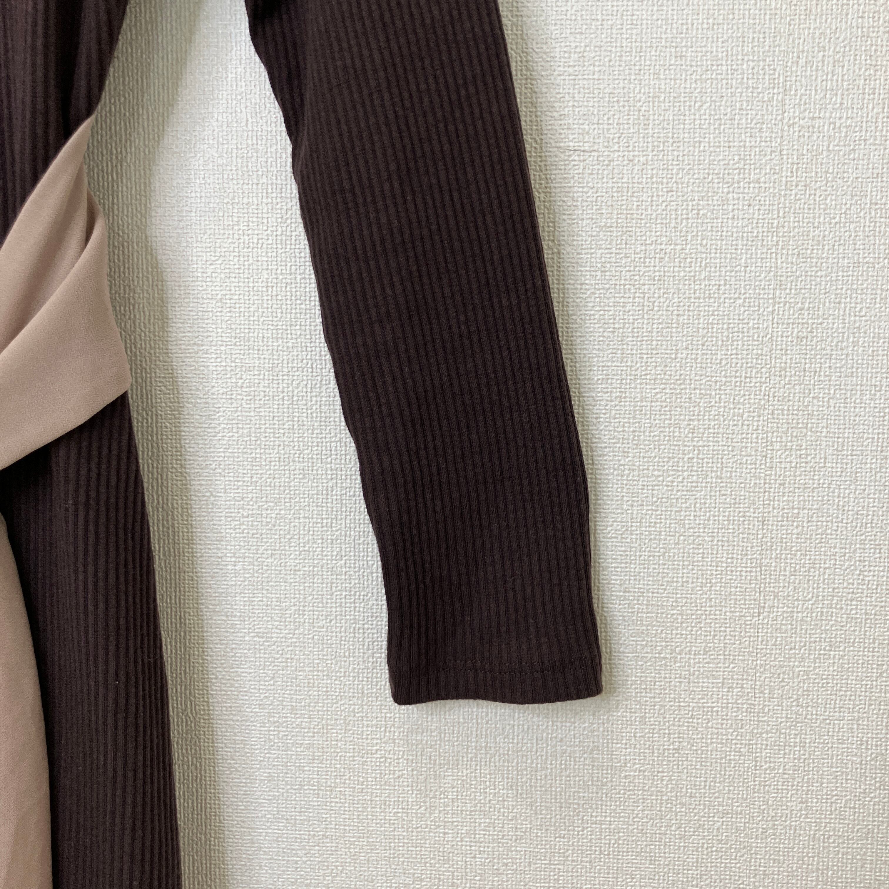 リボン付きのダークブラウンニットワンピース、長袖でラウンドネックデザイン。