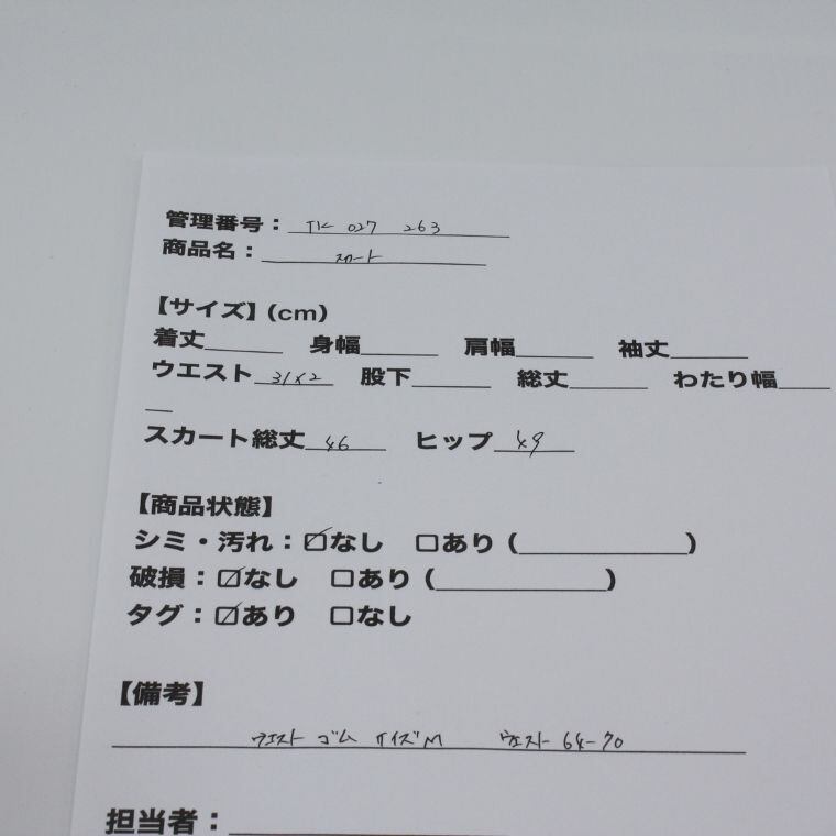 目立つシミや汚れは見られず、全体的に状態は良好です。中古品のため、わずかな使用感や保管時のシワについてはあらかじめご了承ください。コーディネートに取り入れやすく、着回し力の高いチェック柄スカートをお探しの方におすすめの一着です。
