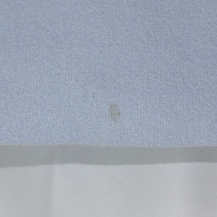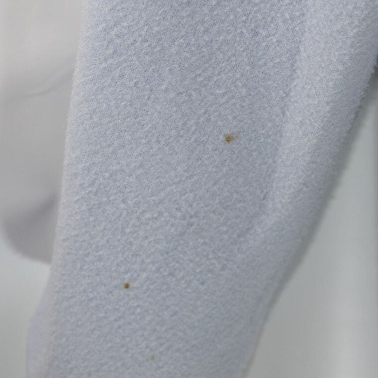 また、前身頃や裾付近を中心に複数のシミが確認できます。