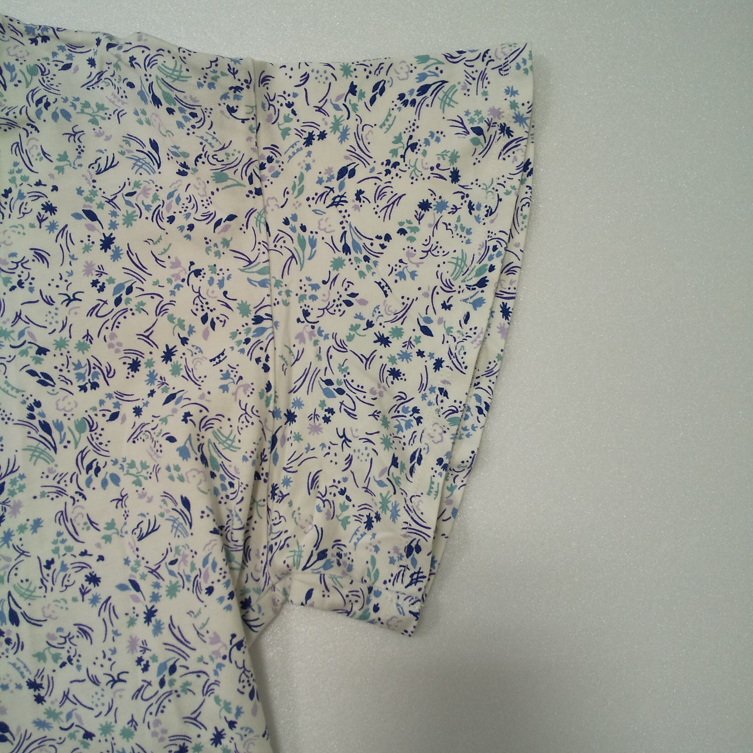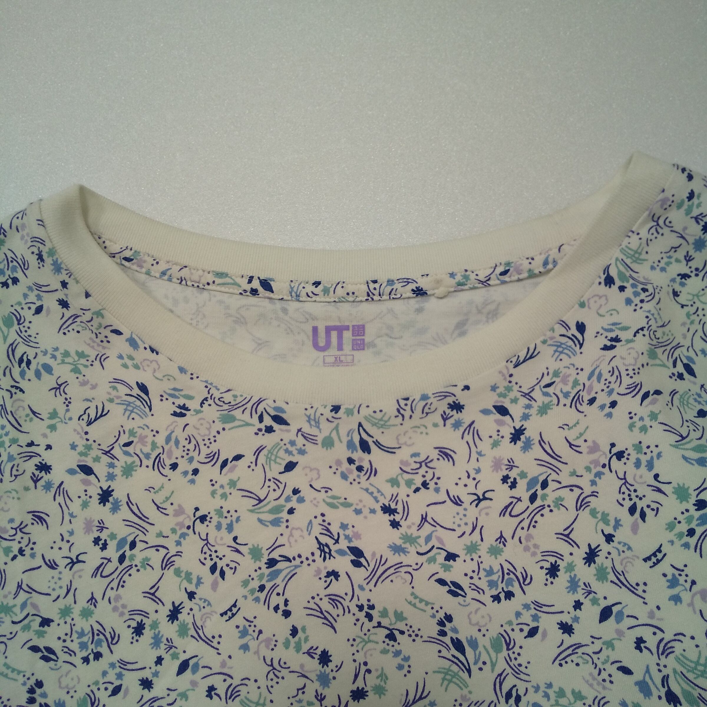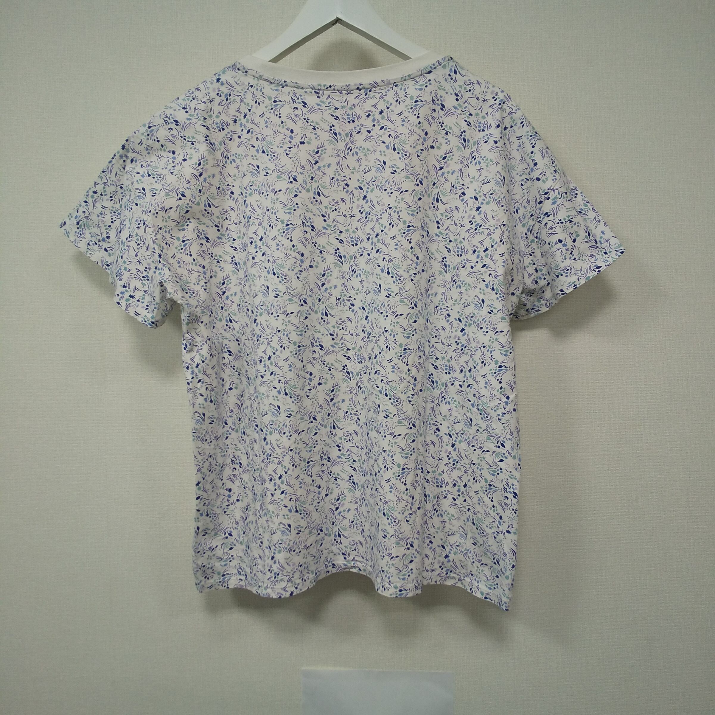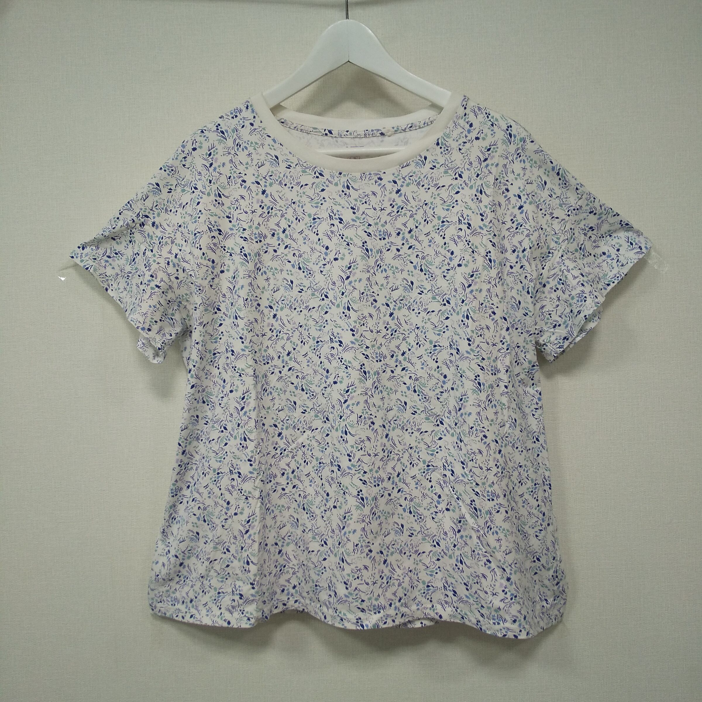 UNIQLO(ユニクロ)× ANNA SUI(アナスイ)コラボの「UT」花柄Tシャツです。白地に青・緑系の小花柄プリントが全体に入った、可愛らしさと上品さを併せ持つデザイン。UT×ANNA SUIのロゴ入りで、コラボならではの特別感があります。タグ表記はXLで、ゆったり着たい方にもおすすめ。デニムやスカート、ワイドパンツにも合わせやすく、春夏はもちろん羽織のインナーとしても使いやすい1枚です。