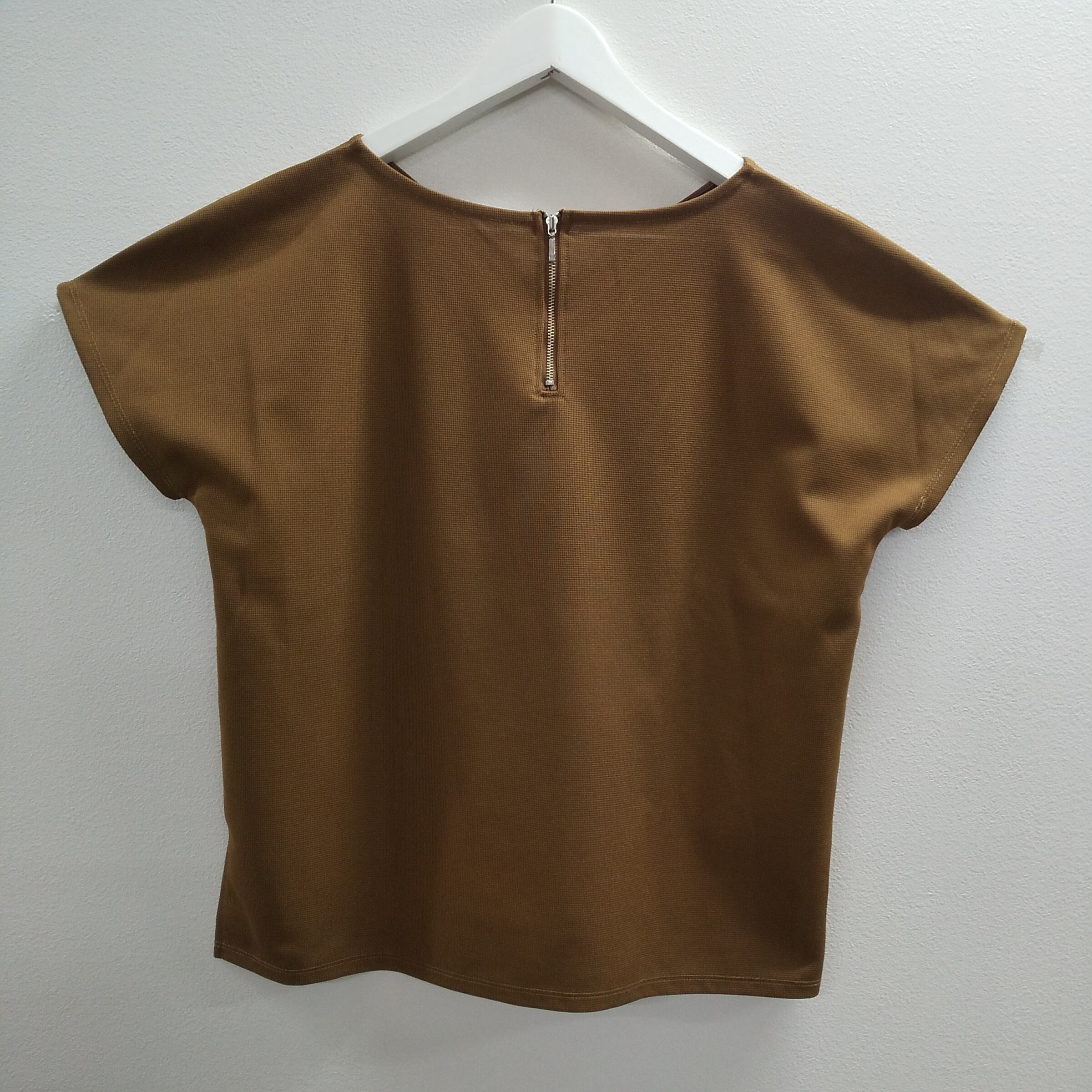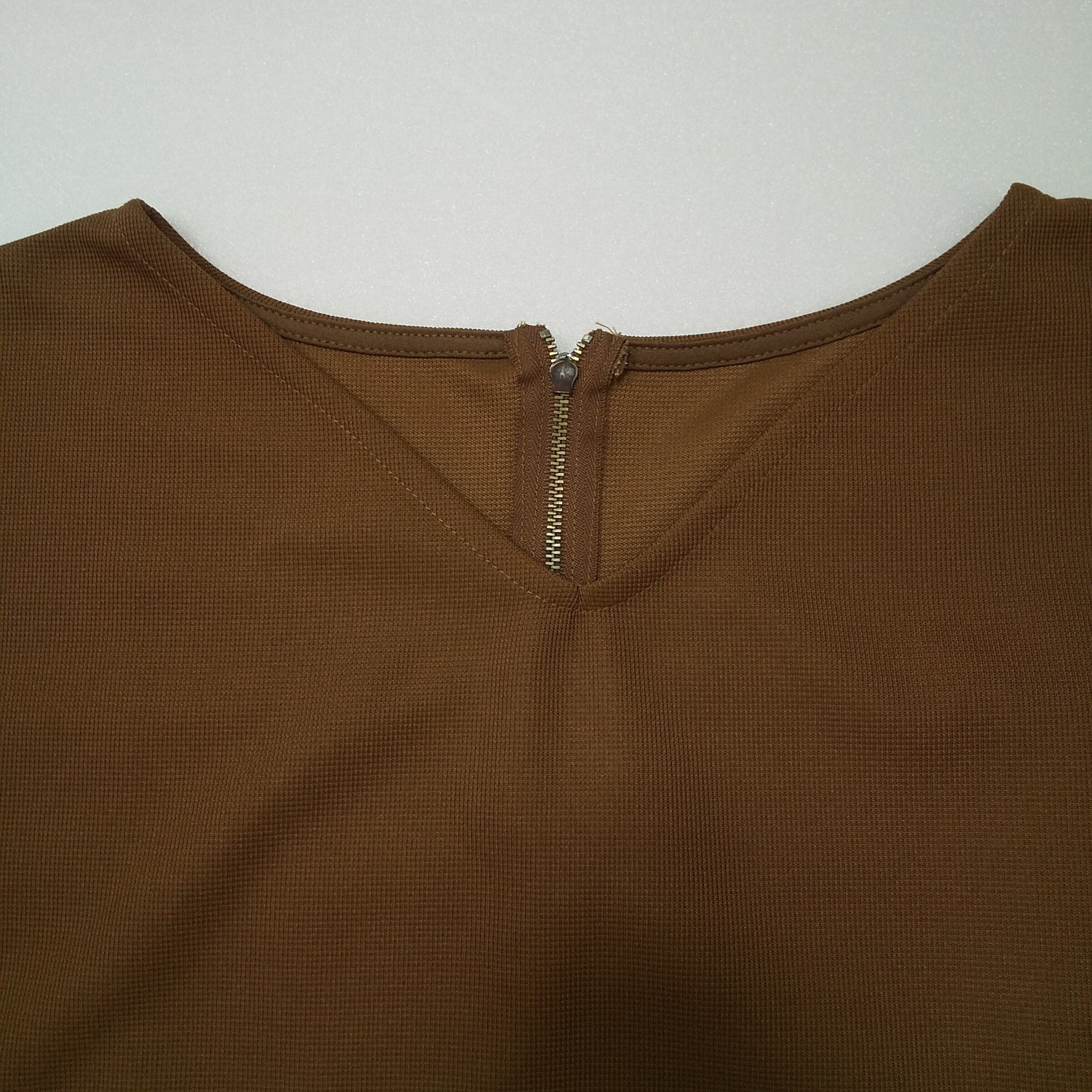 Te chichi(テチチ)TERRASSEのカットソーです。落ち着いた茶色で、きれいめにもカジュアルにも合わせやすい万能カラー。首元はVネックですっきり見え、程よく抜け感が出るデザインです。背面にジップ(ファスナー)付きなので着脱もしやすく、ヘアセット後でも着やすいのが嬉しいポイント。袖は肩まわりをやさしくカバーするシルエットで、春夏は1枚で、秋口はカーディガンやジャケットのインナーとしても活躍します。素材はポリエステル100%で、シワになりにくく扱いやすいのもおすすめポイントです。
