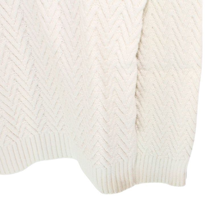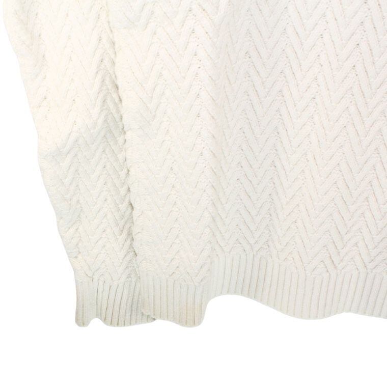立体感のあるヘリンボーン調のケーブル編みデザインが特徴で、シンプルながらも存在感のある一着です。