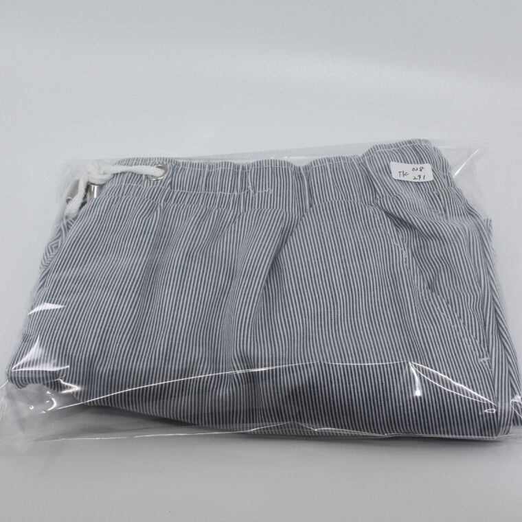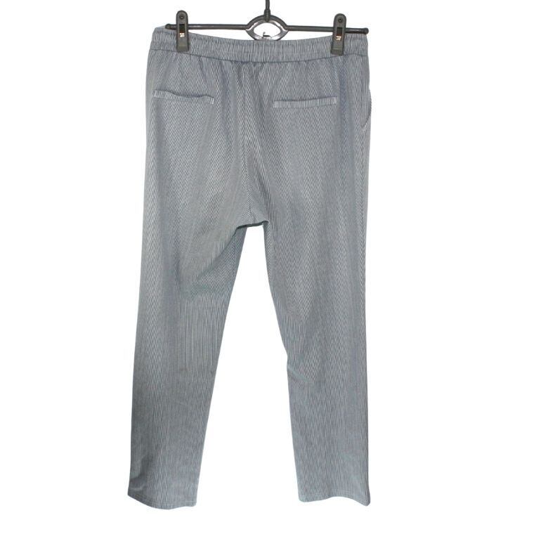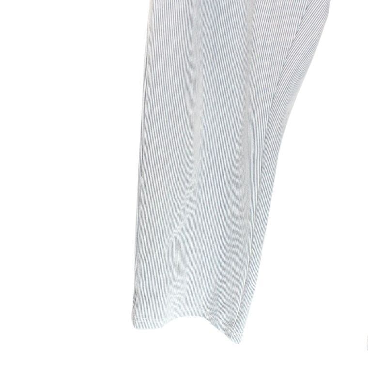 全体に細かなストライプ調の織り柄が入った、落ち着いたライトブルー系カラーで、カジュアルすぎず上品な印象。ウエストは総ゴム+ドローコード付きのため、着脱がしやすく、日常使いからお出かけまで幅広く活躍します。