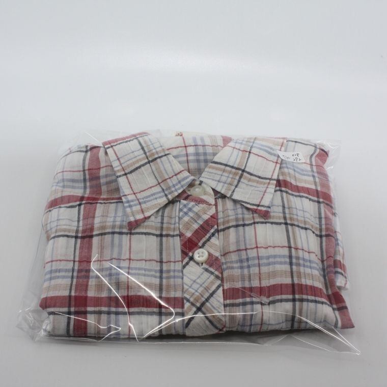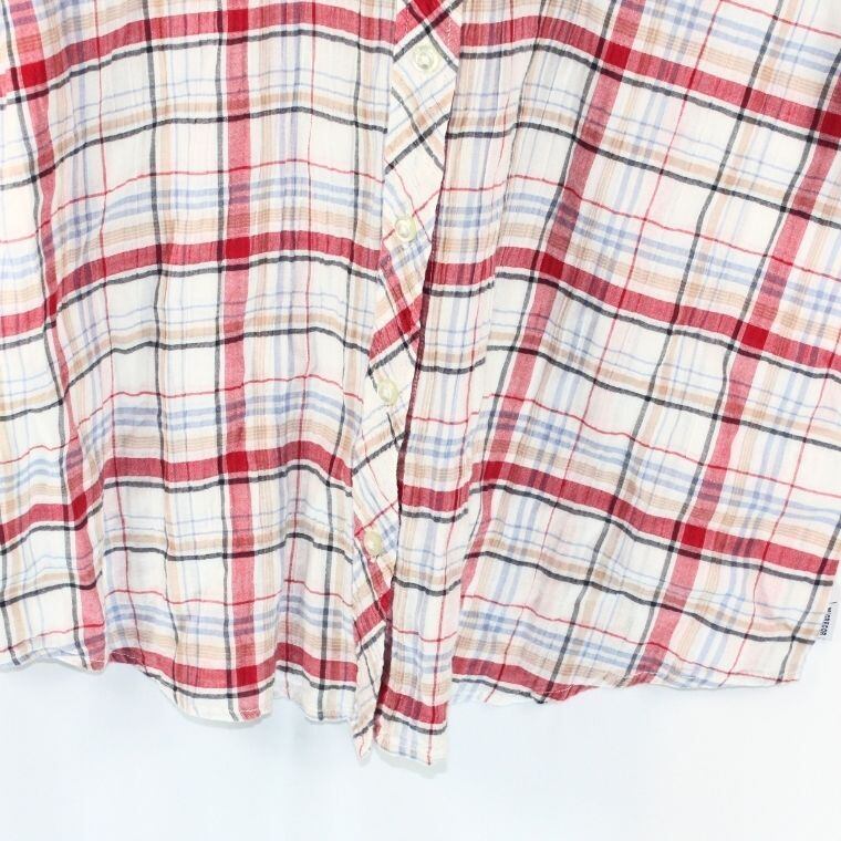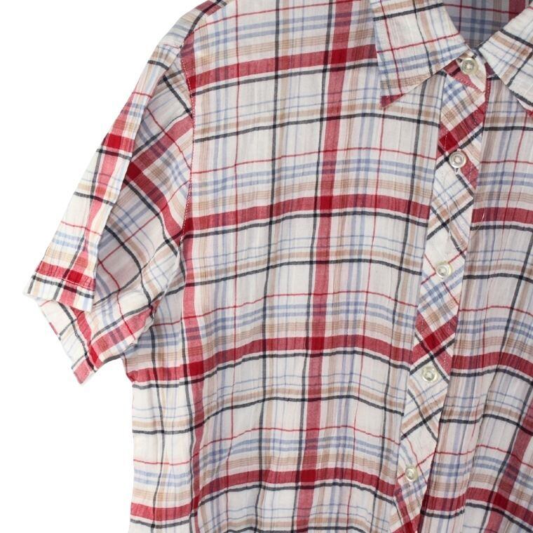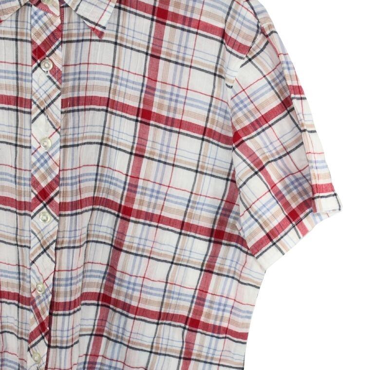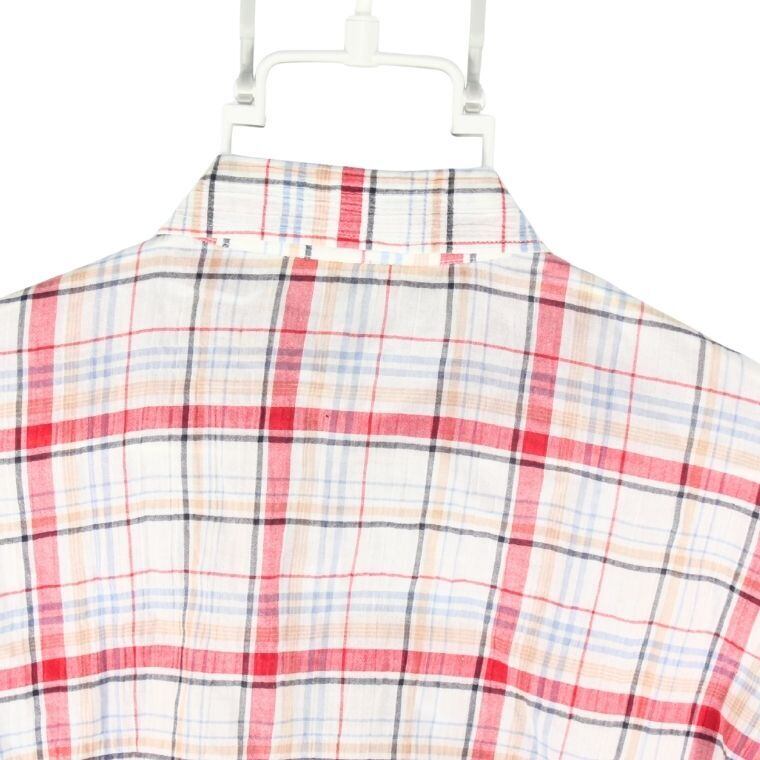 赤・ベージュ・ブルー系のチェック柄が爽やかな一着で、カジュアルスタイルに取り入れやすいデザインです。