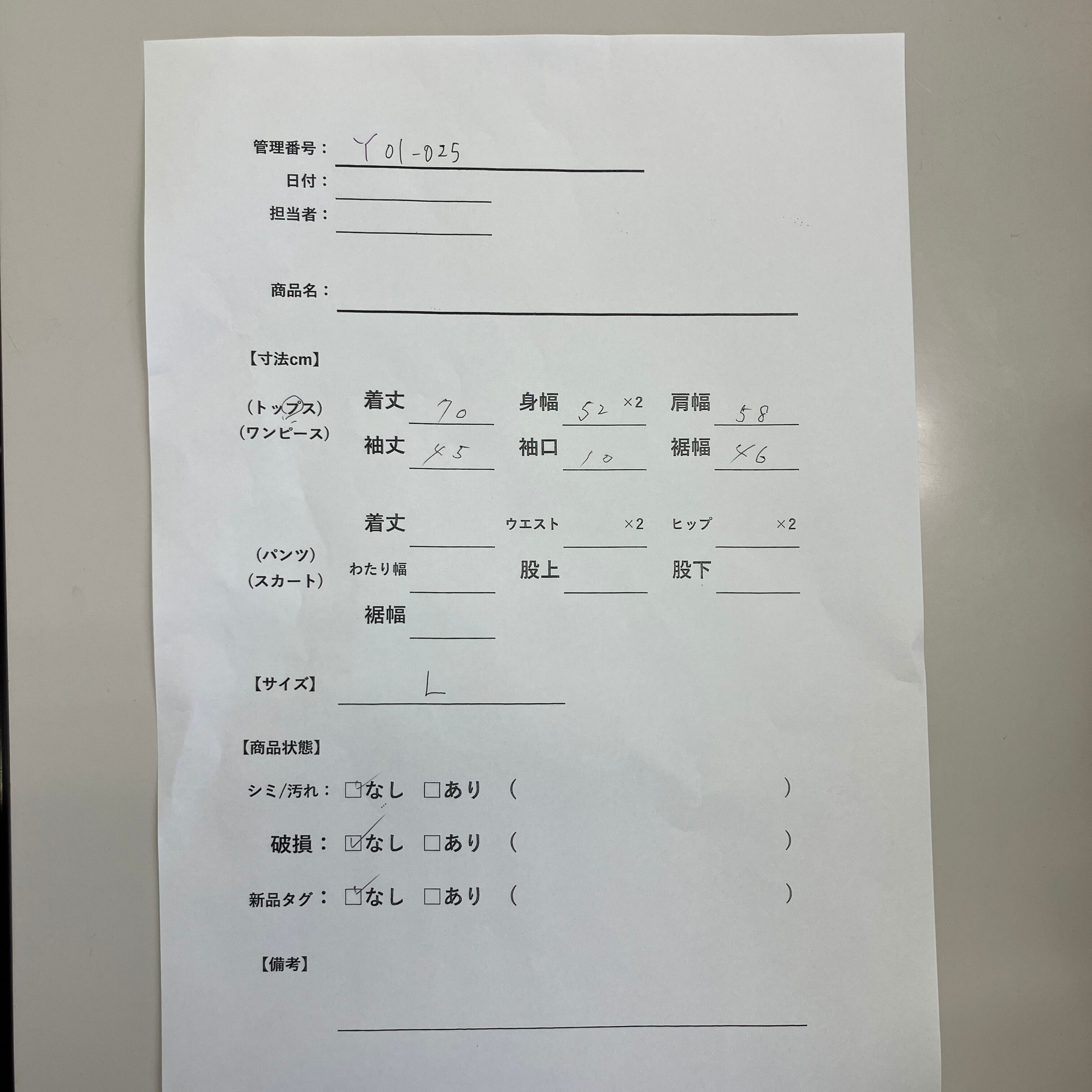 管理番号:Y01-025 #てまいらずアパレル商品一覧
