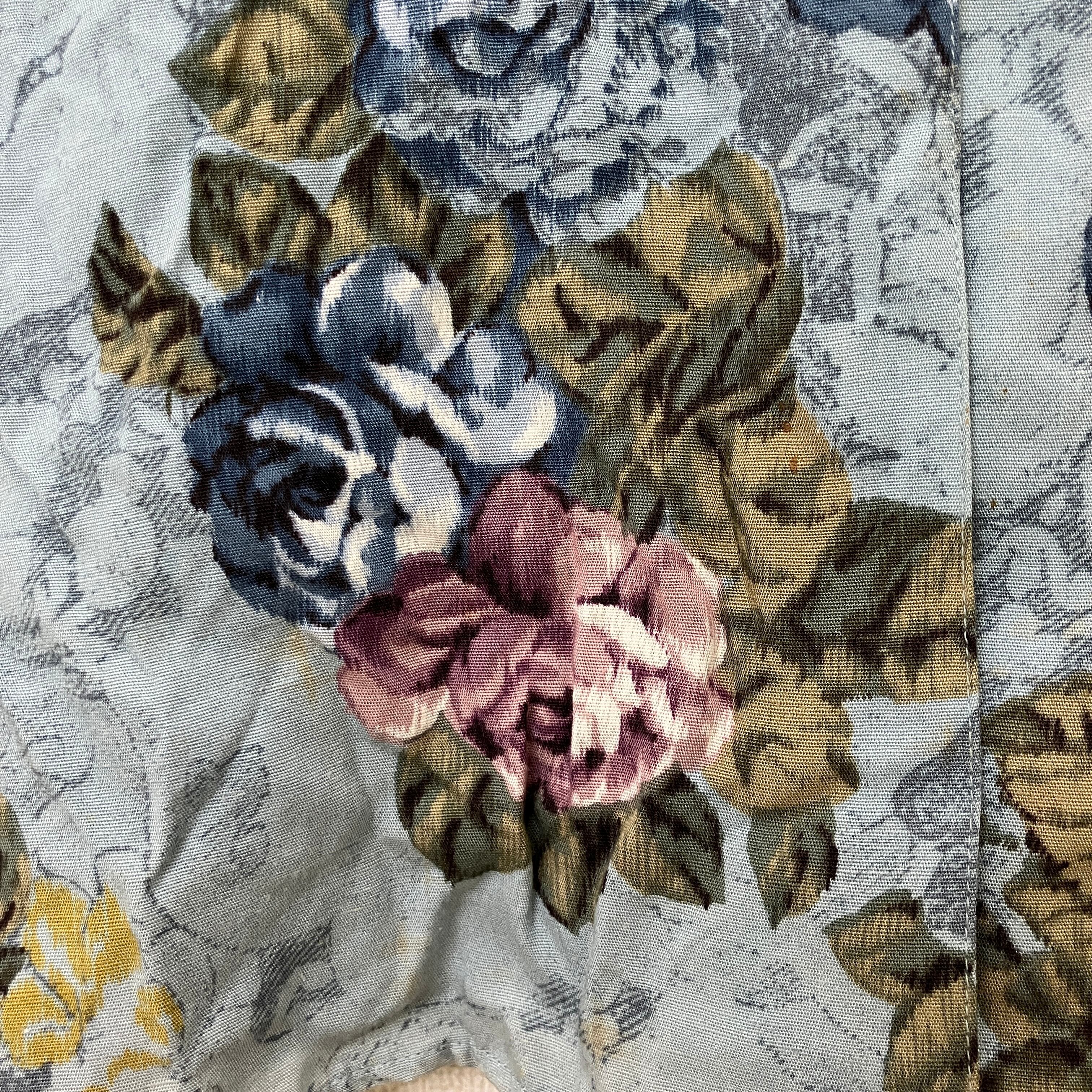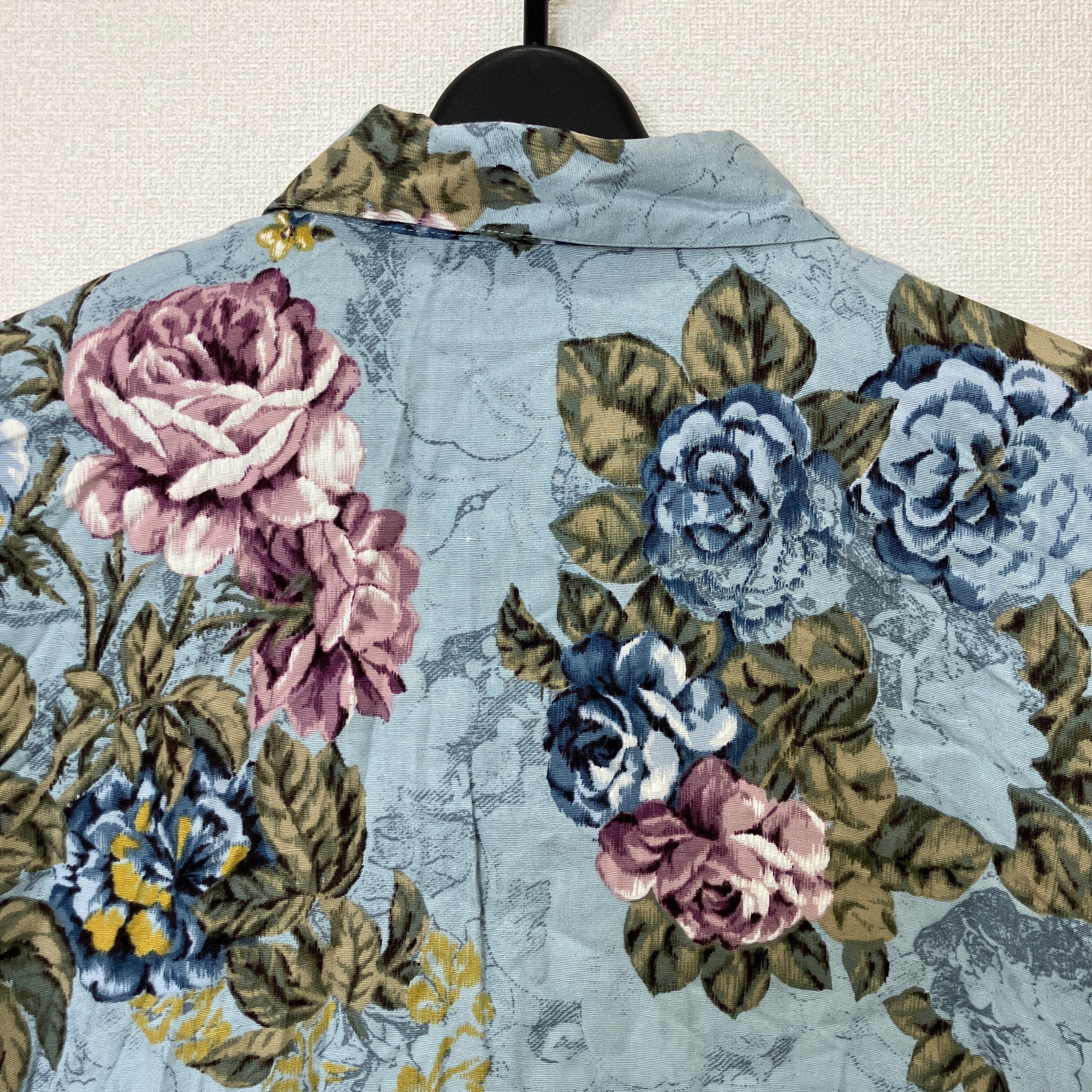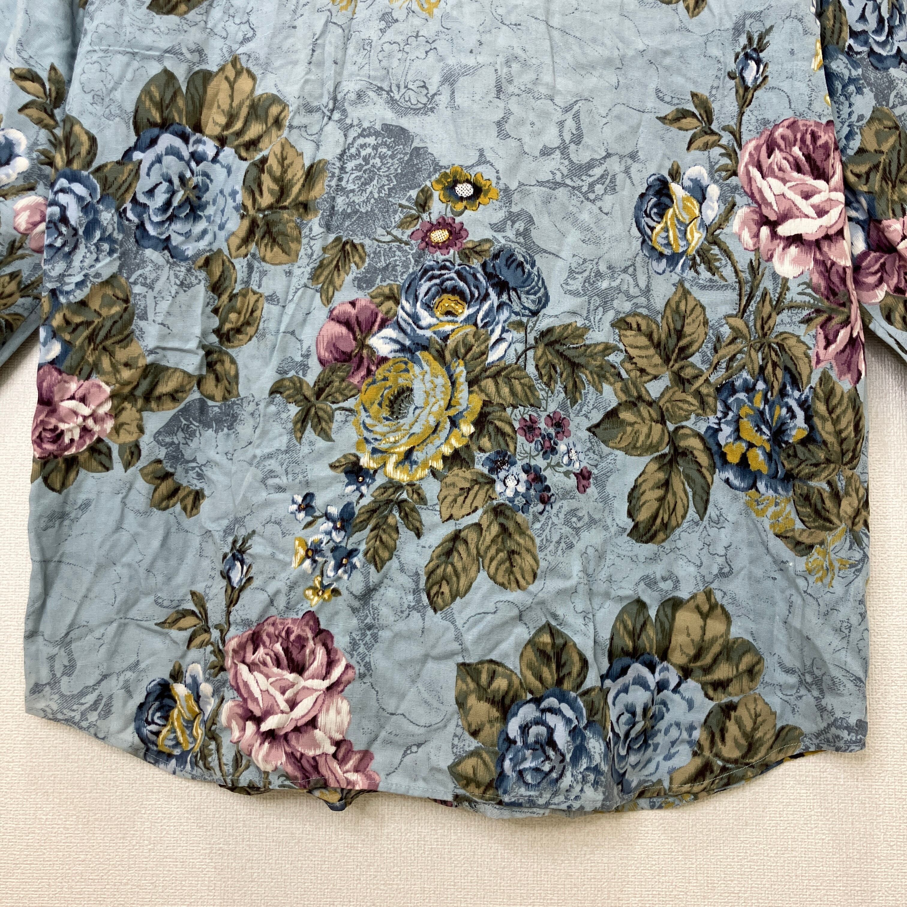落ち着いたブルーを基調とした、エレガントなバラの総柄が目を引く長袖シャツです。