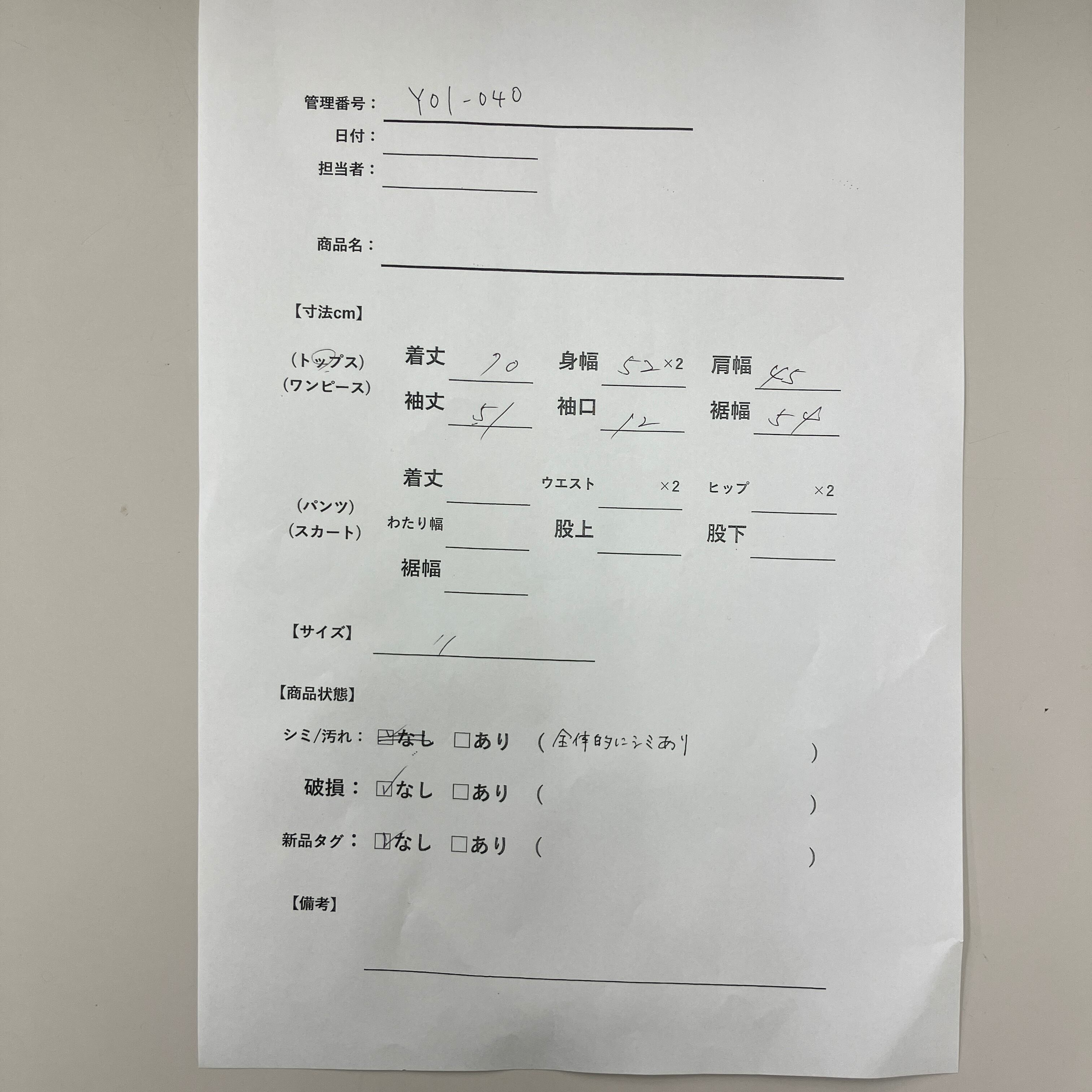 シミ/汚れ: あり(全体的に薄いシミあり)
