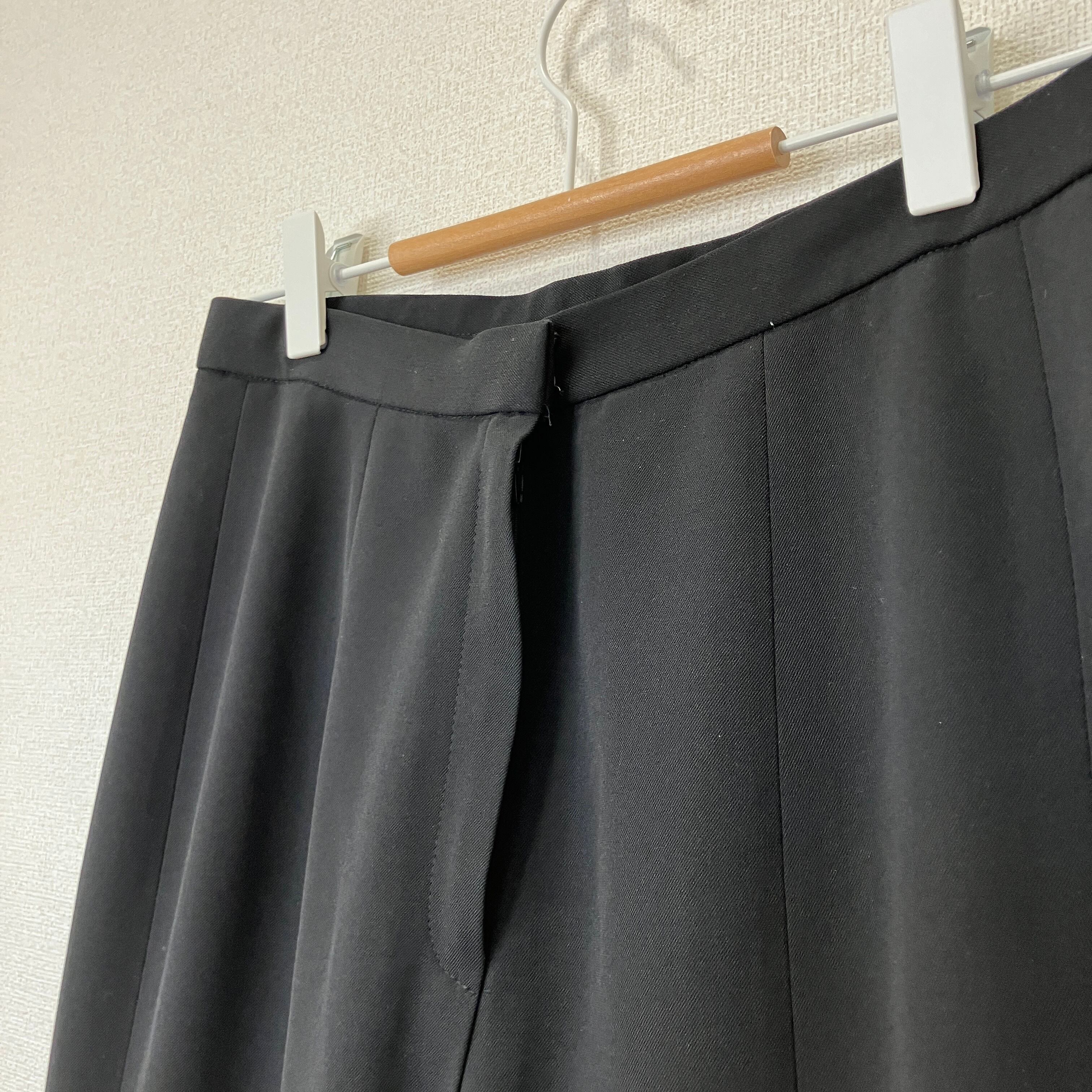 さらりとしたポリエステル主体の生地を使用した、ブラックのセミフレアパンツです。